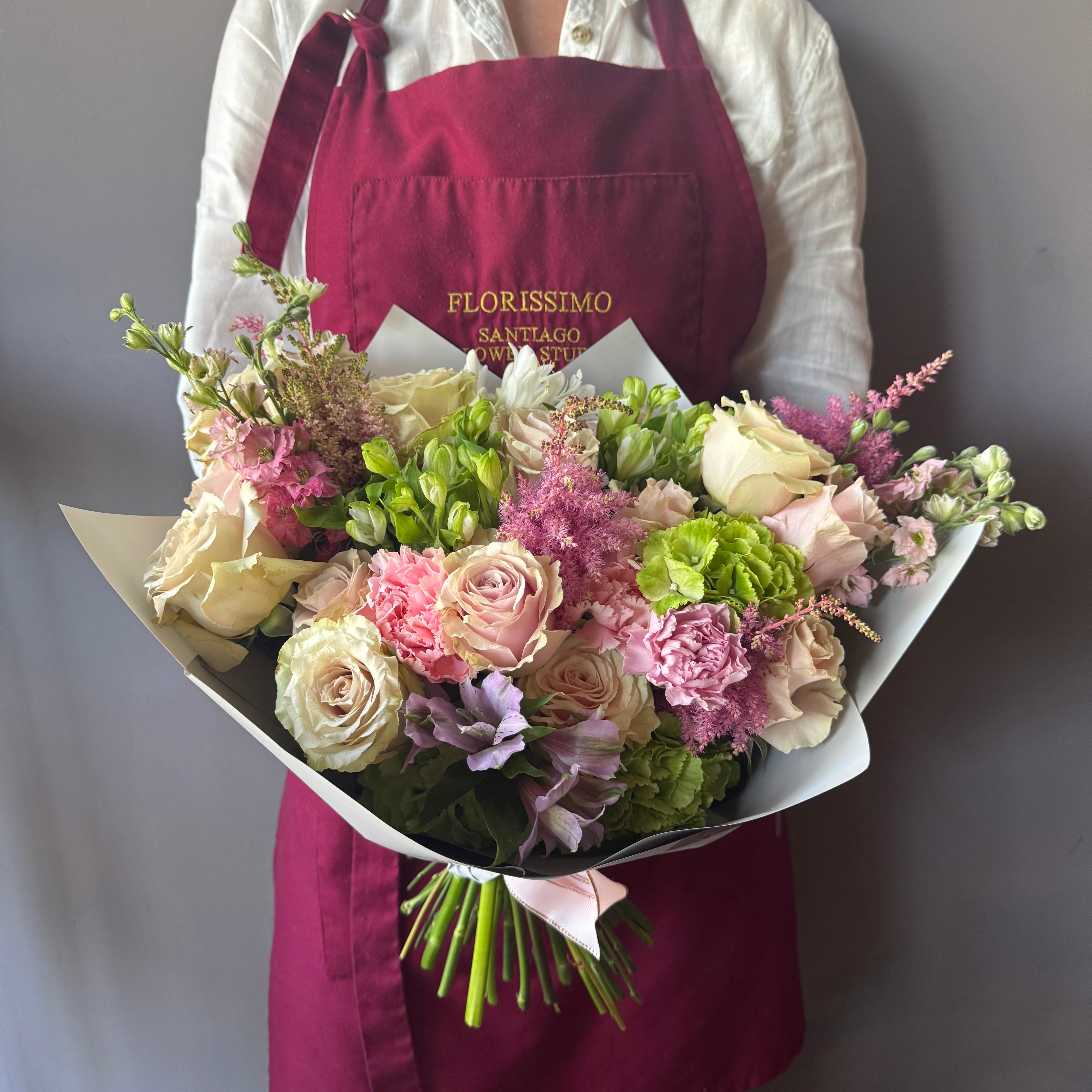 Cada ramo que ofrecemos es una obra única, creada con esmero por nuestras talentosas floristas. Debido a la variabilidad estacional y a la disponibilidad de flores, el producto final puede diferir ligeramente de las imágenes mostradas. Las fotos sirven como referencia para la elección de la tonalidad, forma y diseño, pero no garantizan una réplica exacta del arreglo.