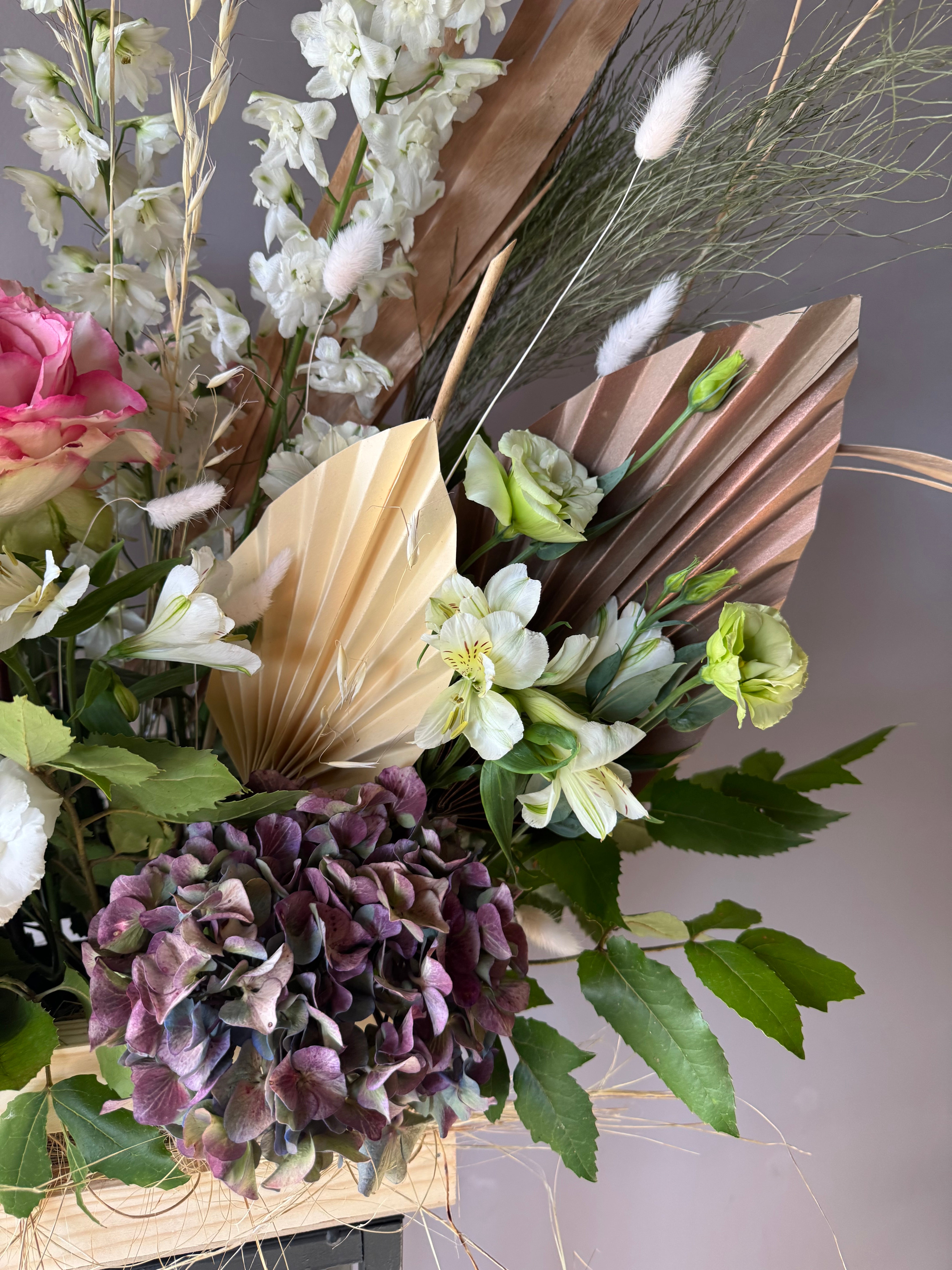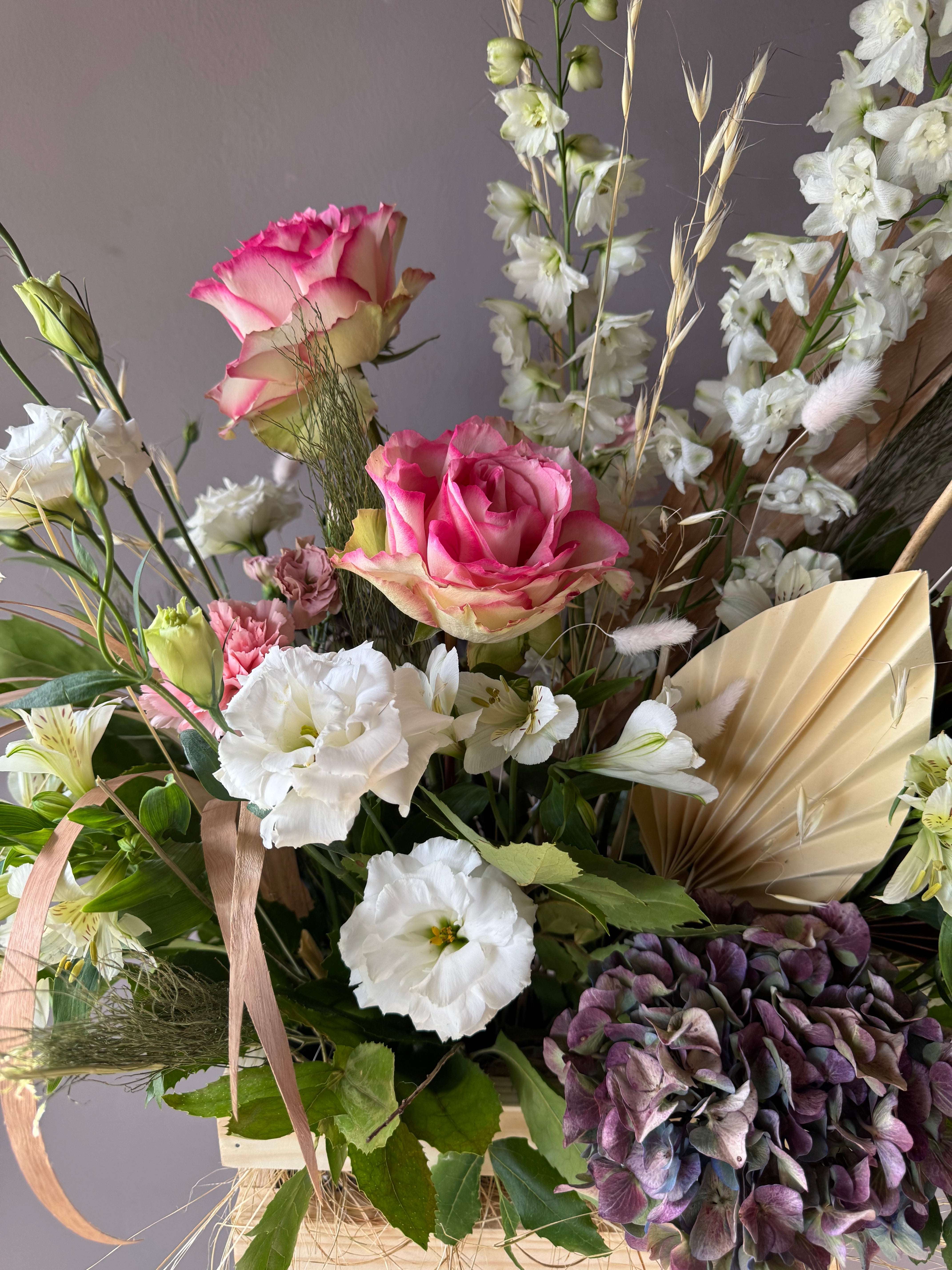Esta hermosa caja de madera en tamaño L es el obsequio ideal para sorprender a tus seres queridos. Con sus colores crudos, blancos y rosados, además de detalles como abanicos, ofrece un arreglo floral asimétrico en tonos alegres y una combinación única de colores y diseños que cautivarán a su destinatario. ¡Haz que su día sea aún más especial con este maravilloso regalo!