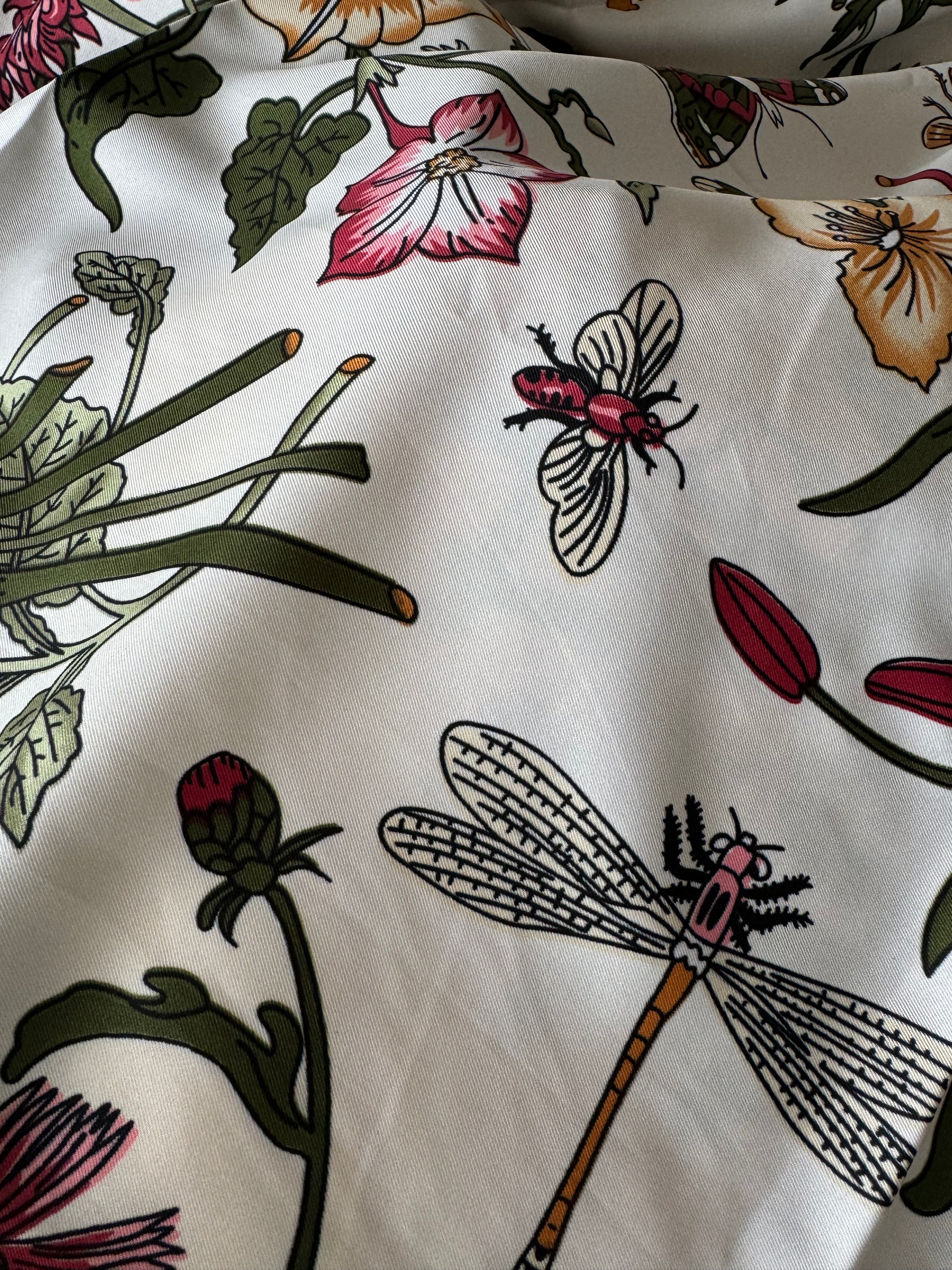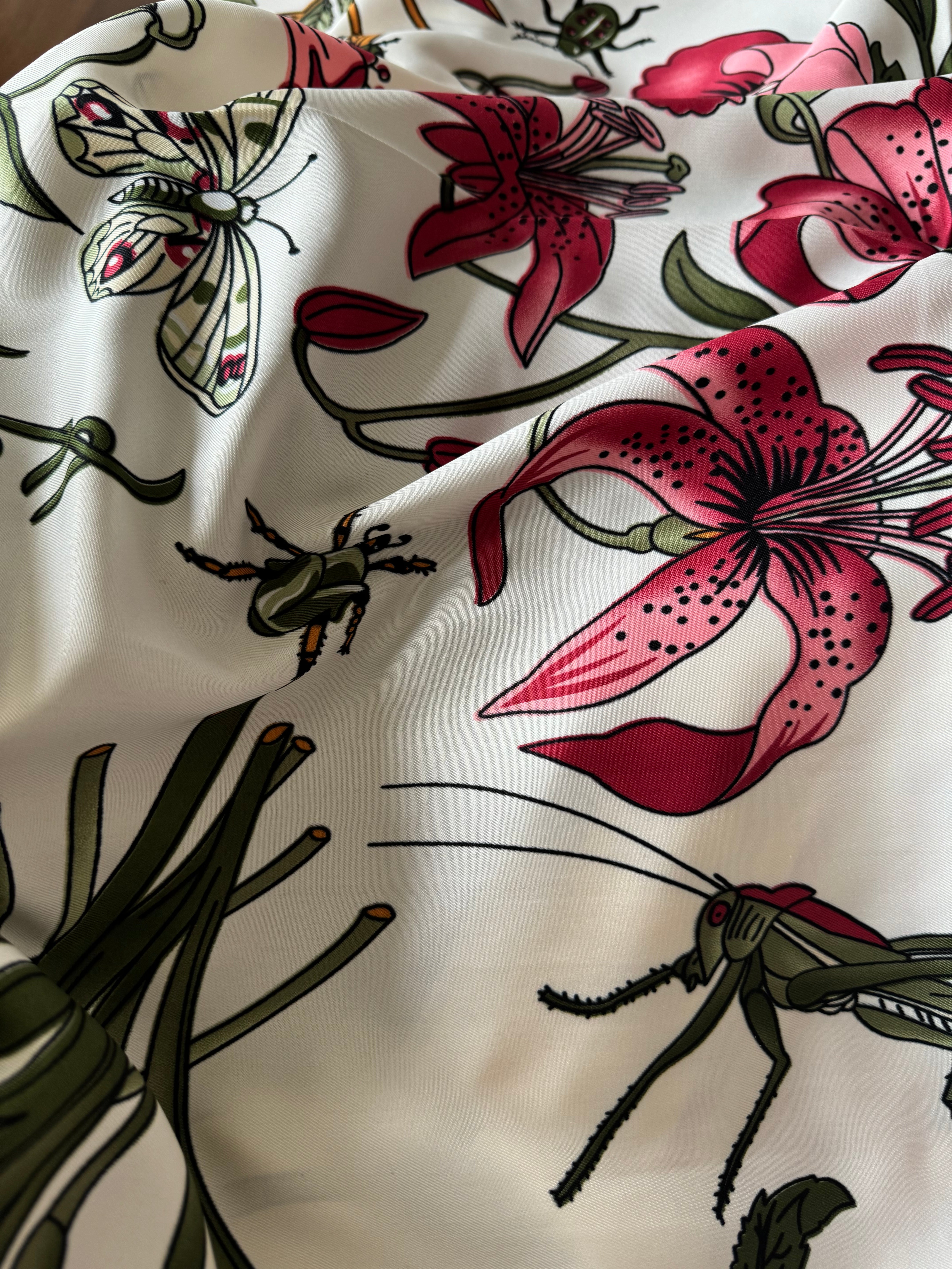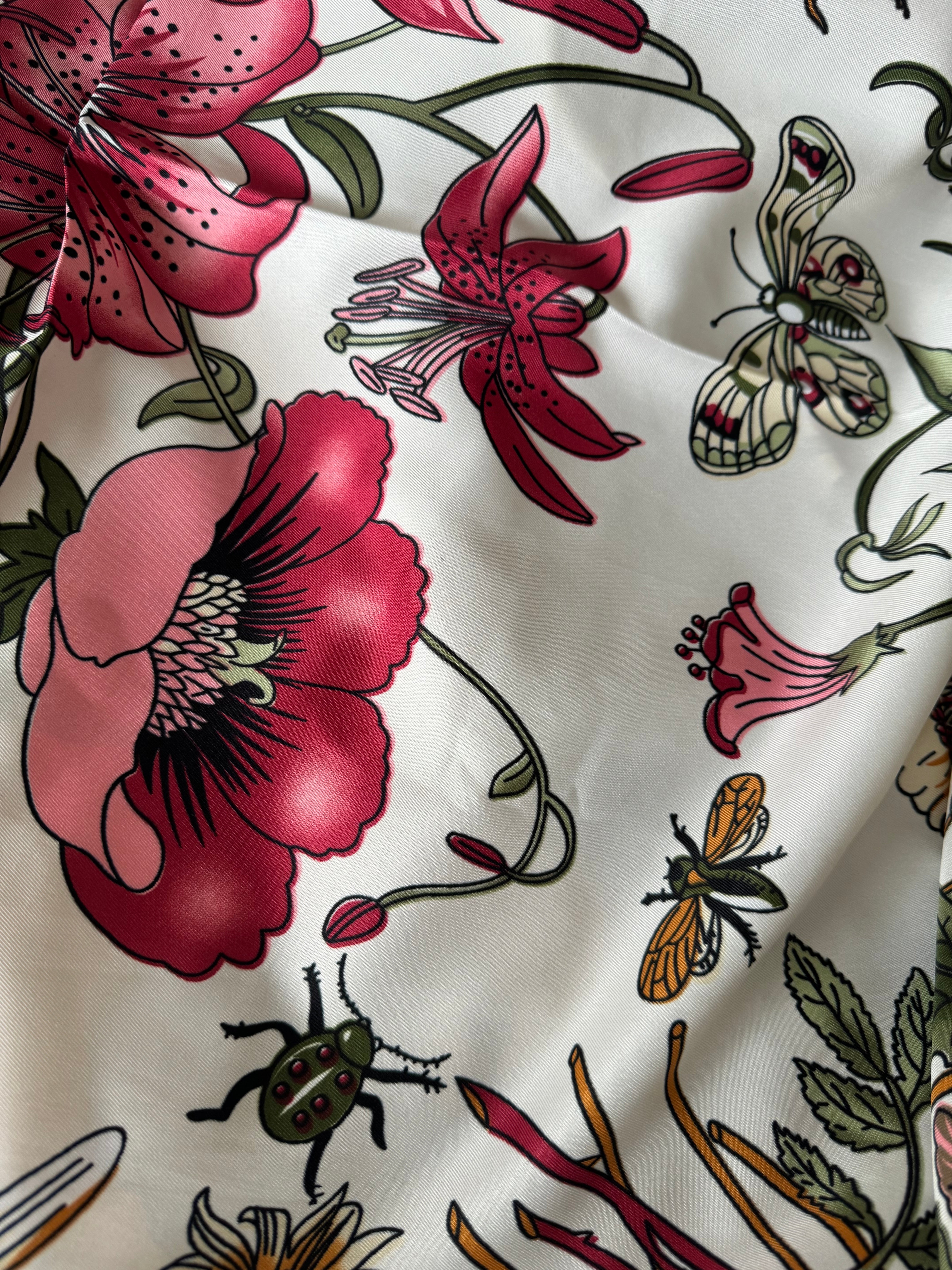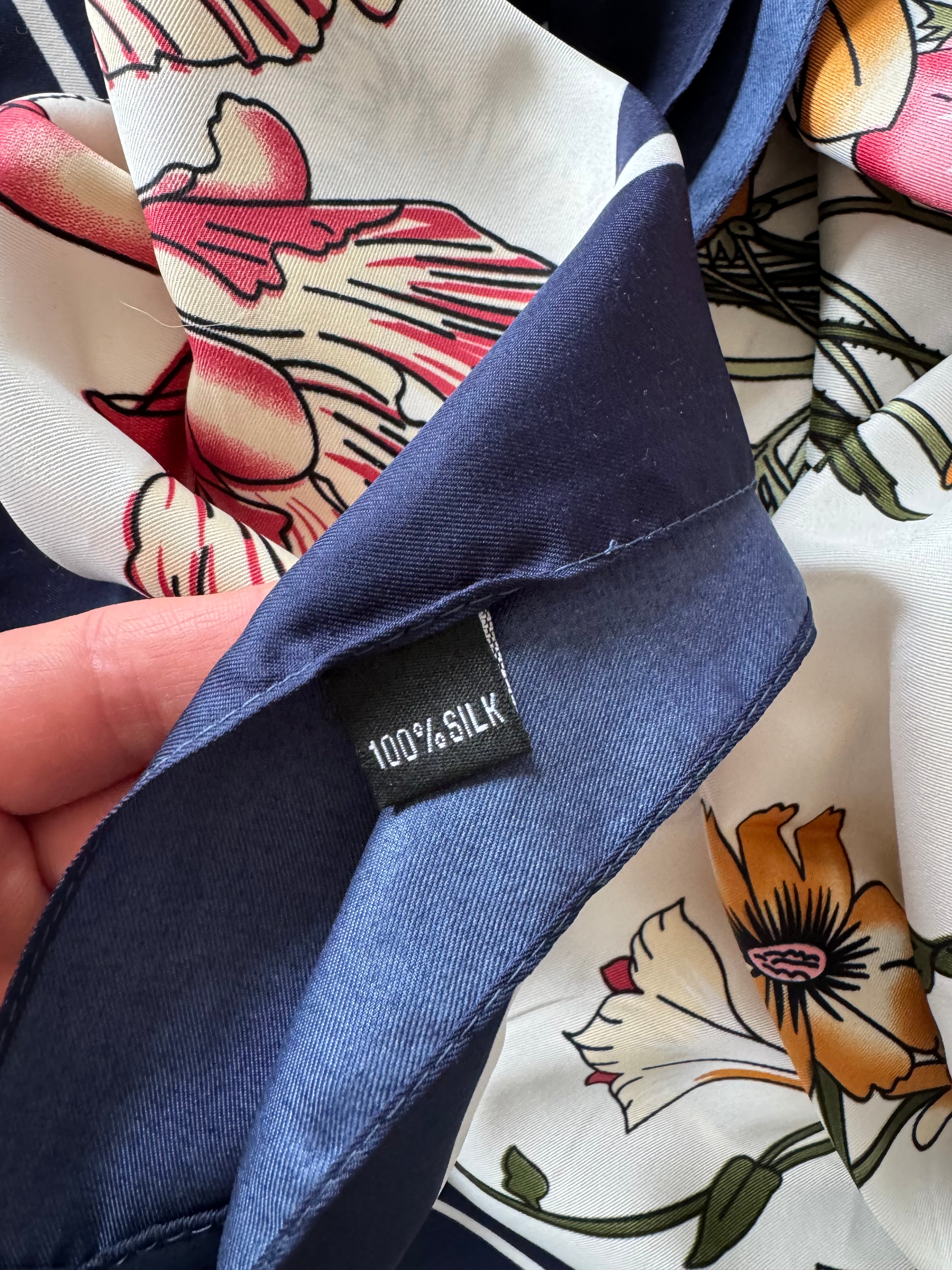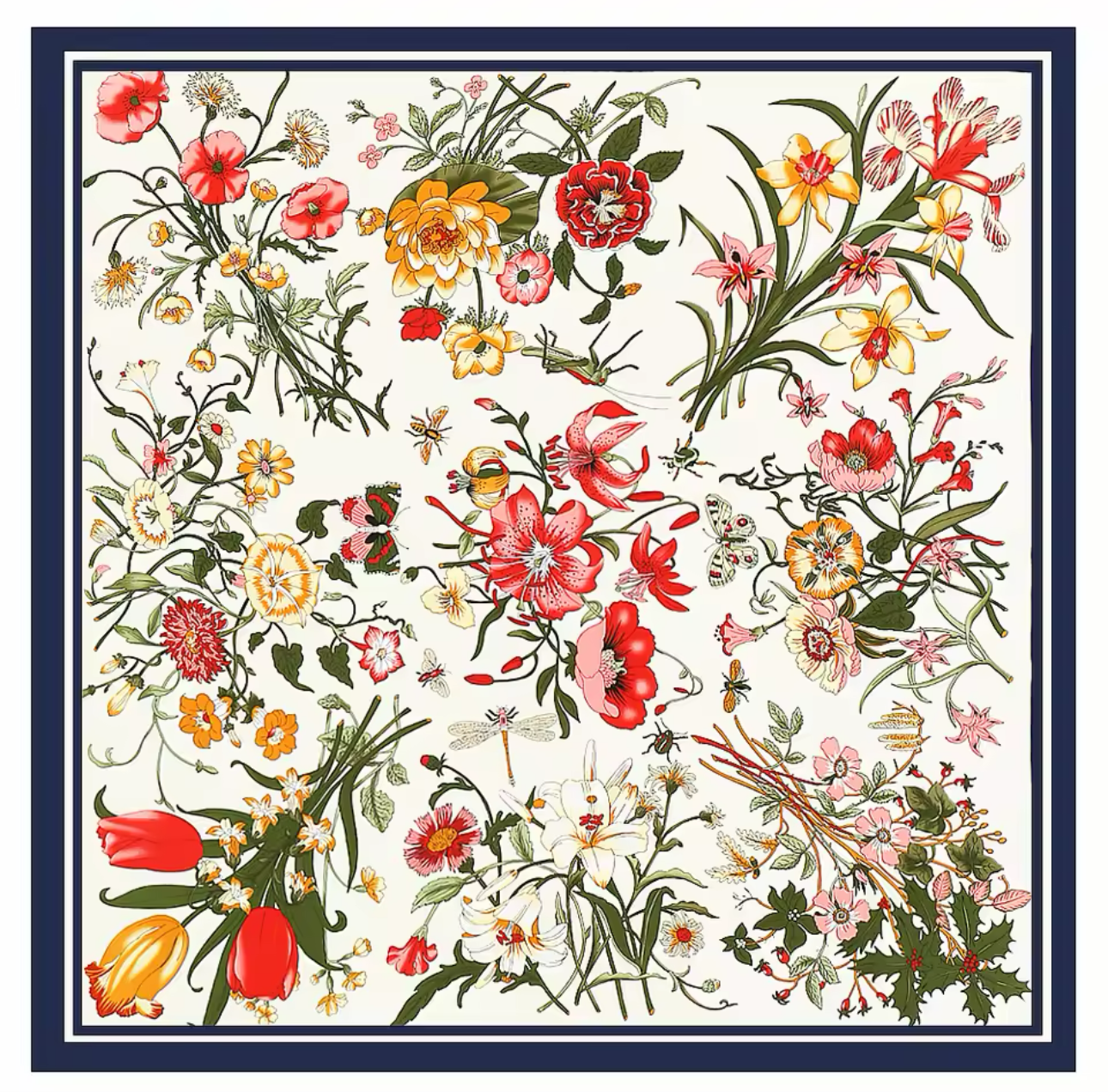 Un precioso pañuelo de mujer en lindas tonalidades con dibujo de flores ornamentales hecho de 100% de seda natural. Tamaño 130x130 cm. Viene envuelto con mucho cariño en papel decorativo y con cinta. Un maravilloso regalo para una fecha especial como Dia de los Enamorados, Cumpleaños, Aniversario, o un Agradecimiento del Equipo laboral.
