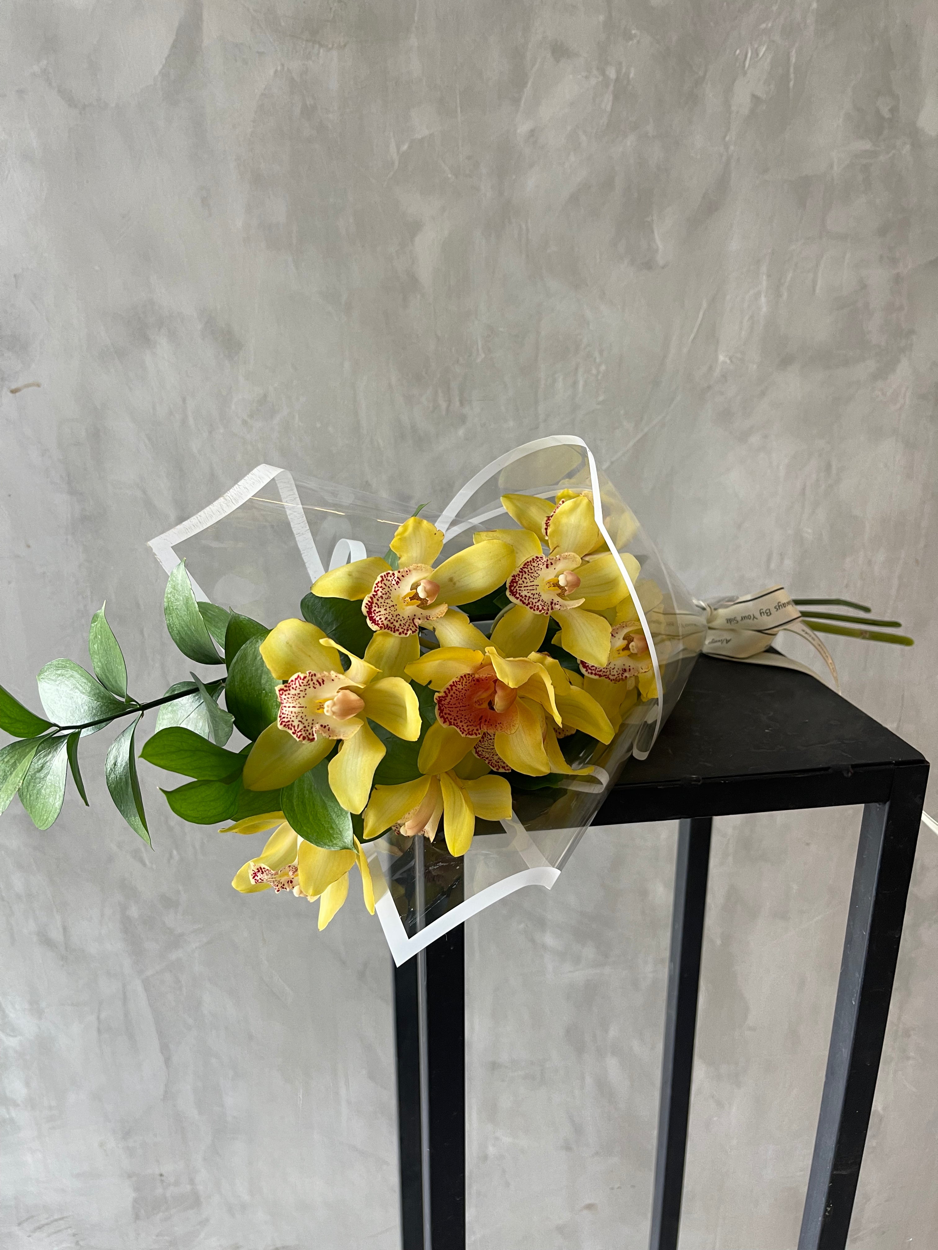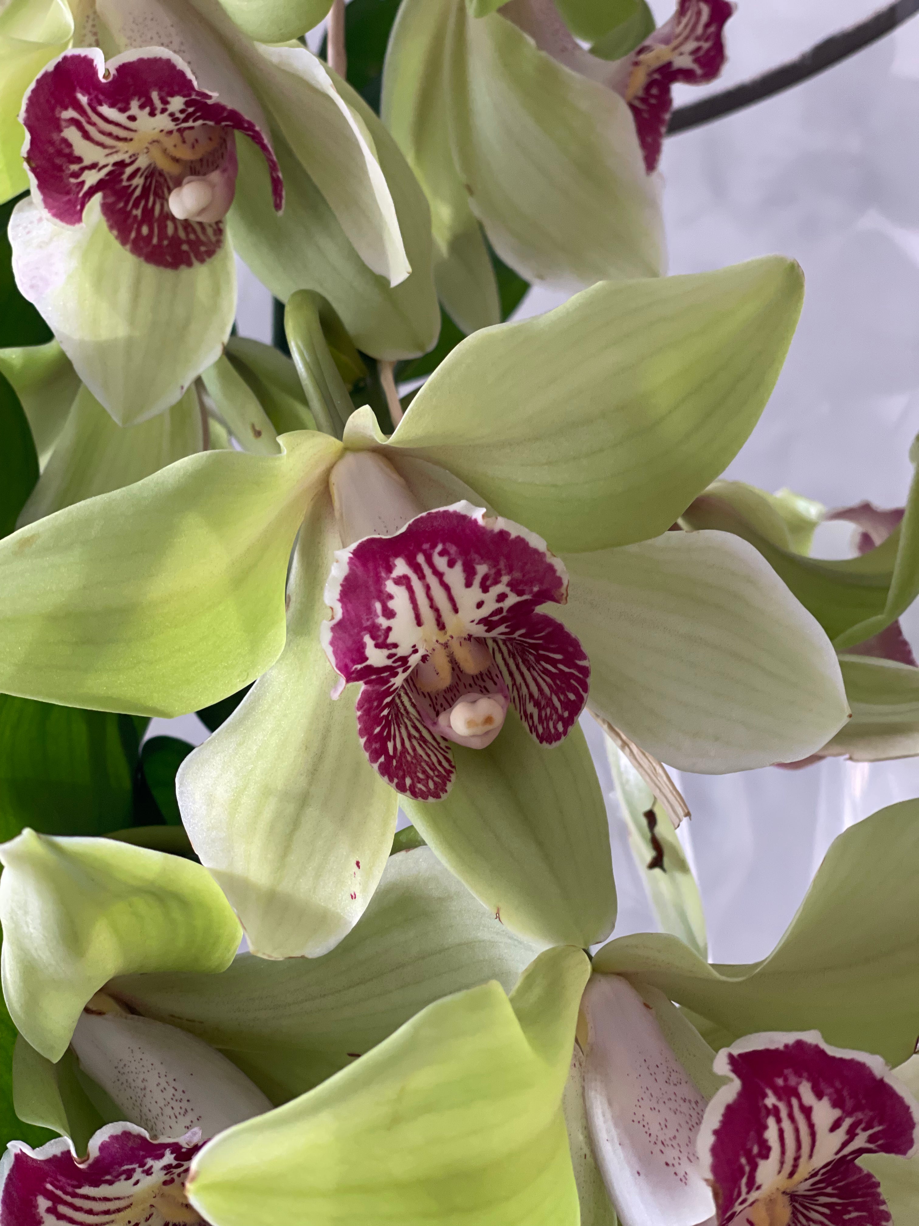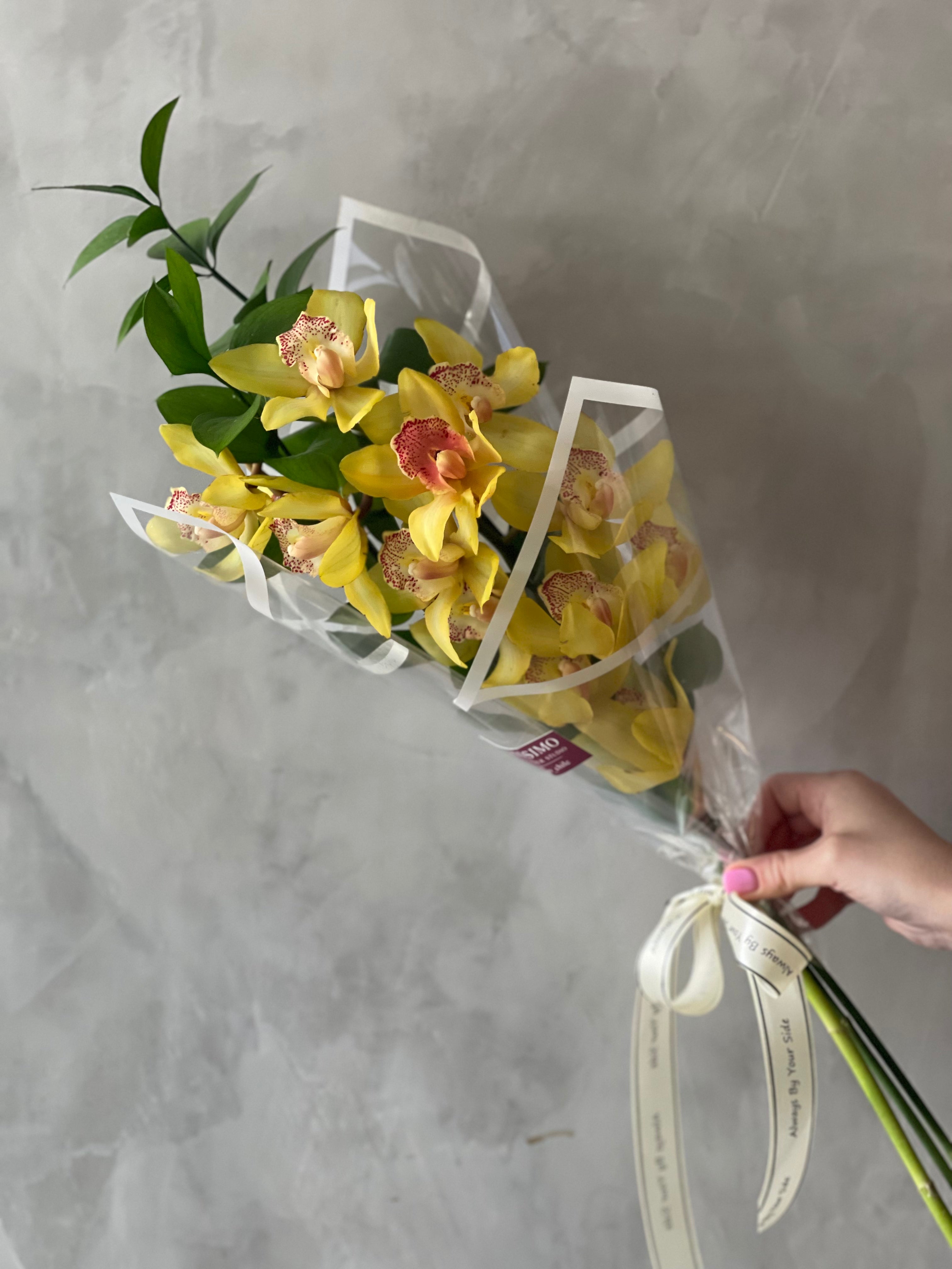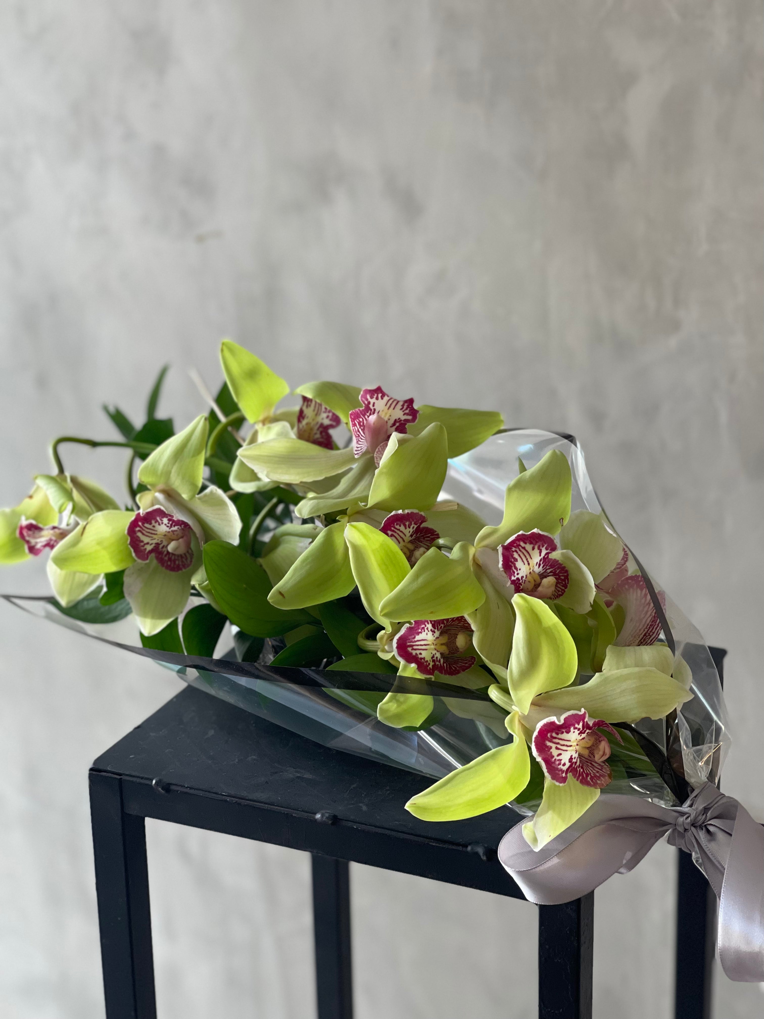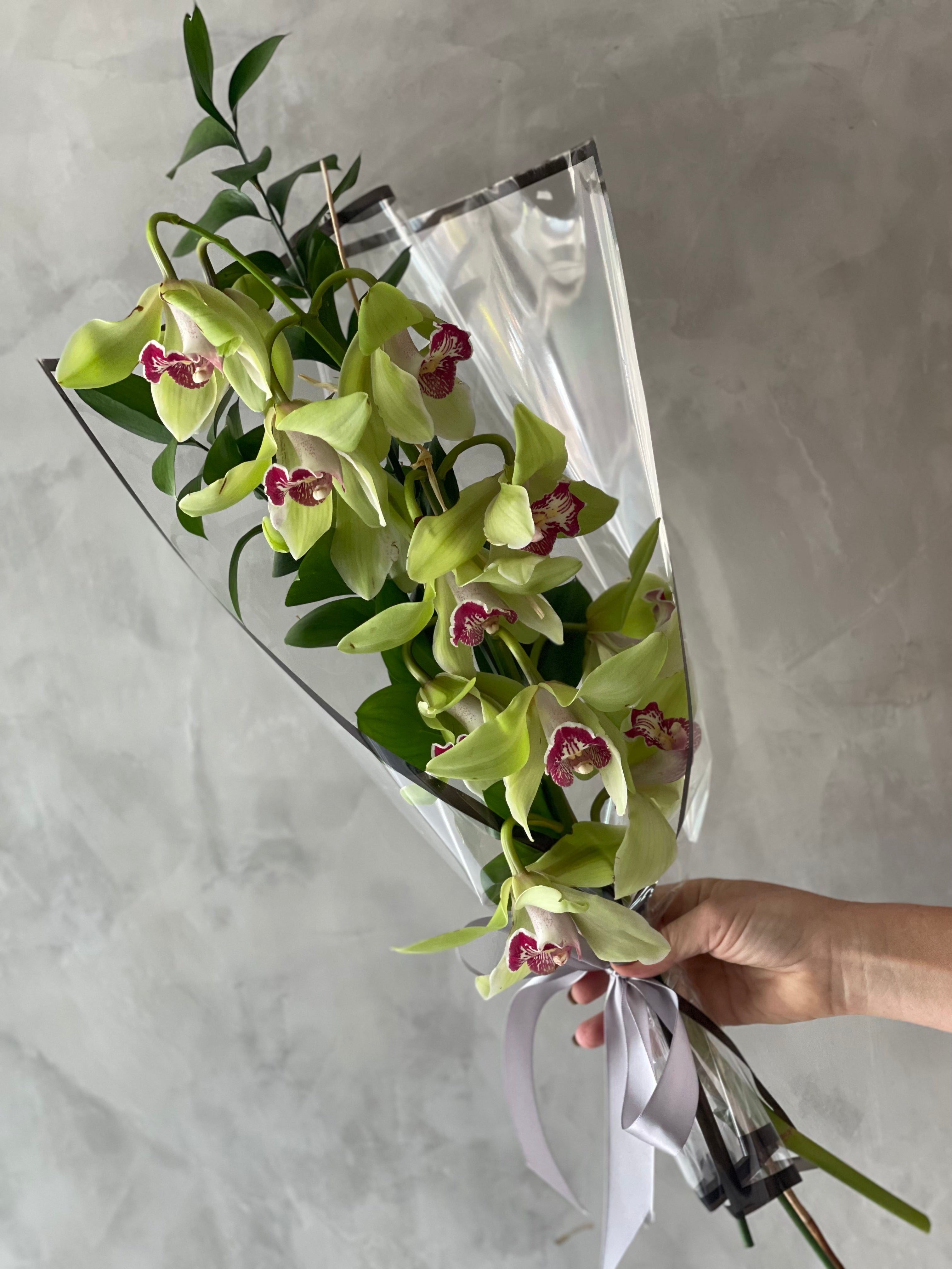Orquídea cymbidium es una flor que puede durar hasta 3 semanas en el caso de ambiente fresco sin sol directo y cambio diario del agua. Cada vara tiene varias flores y altura de 50 - 60 cm. Vienen con unas varas verdes envueltas en papel con cinta.