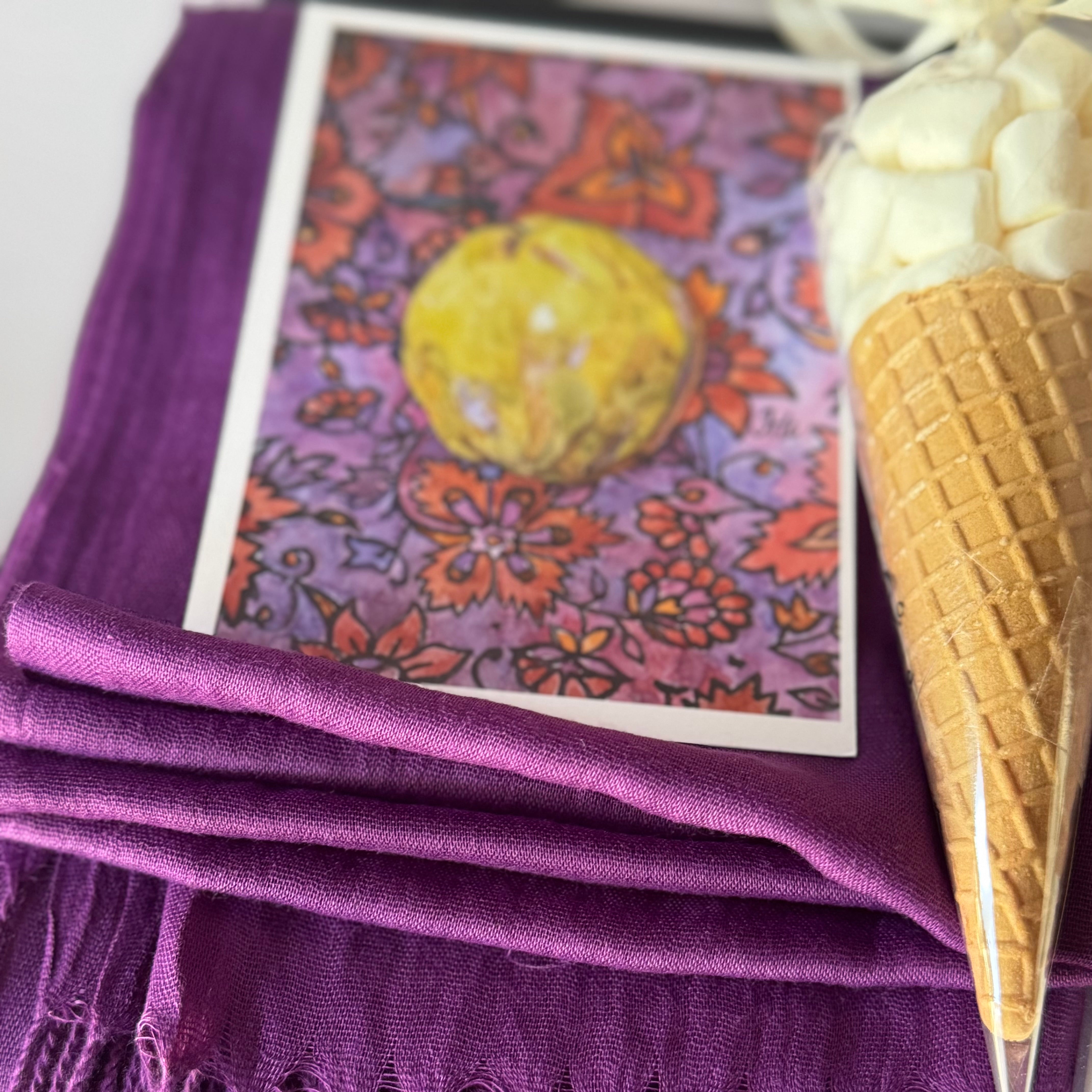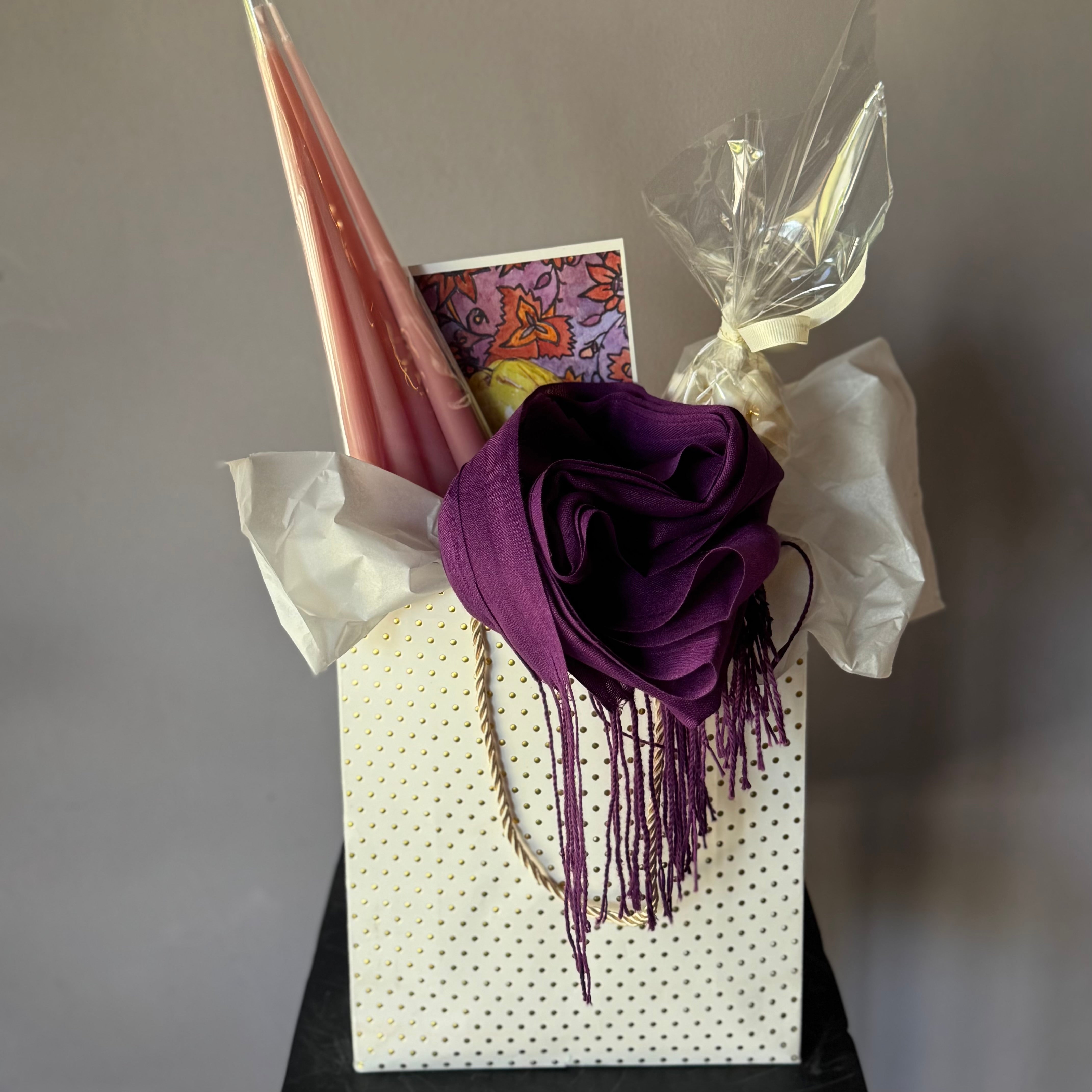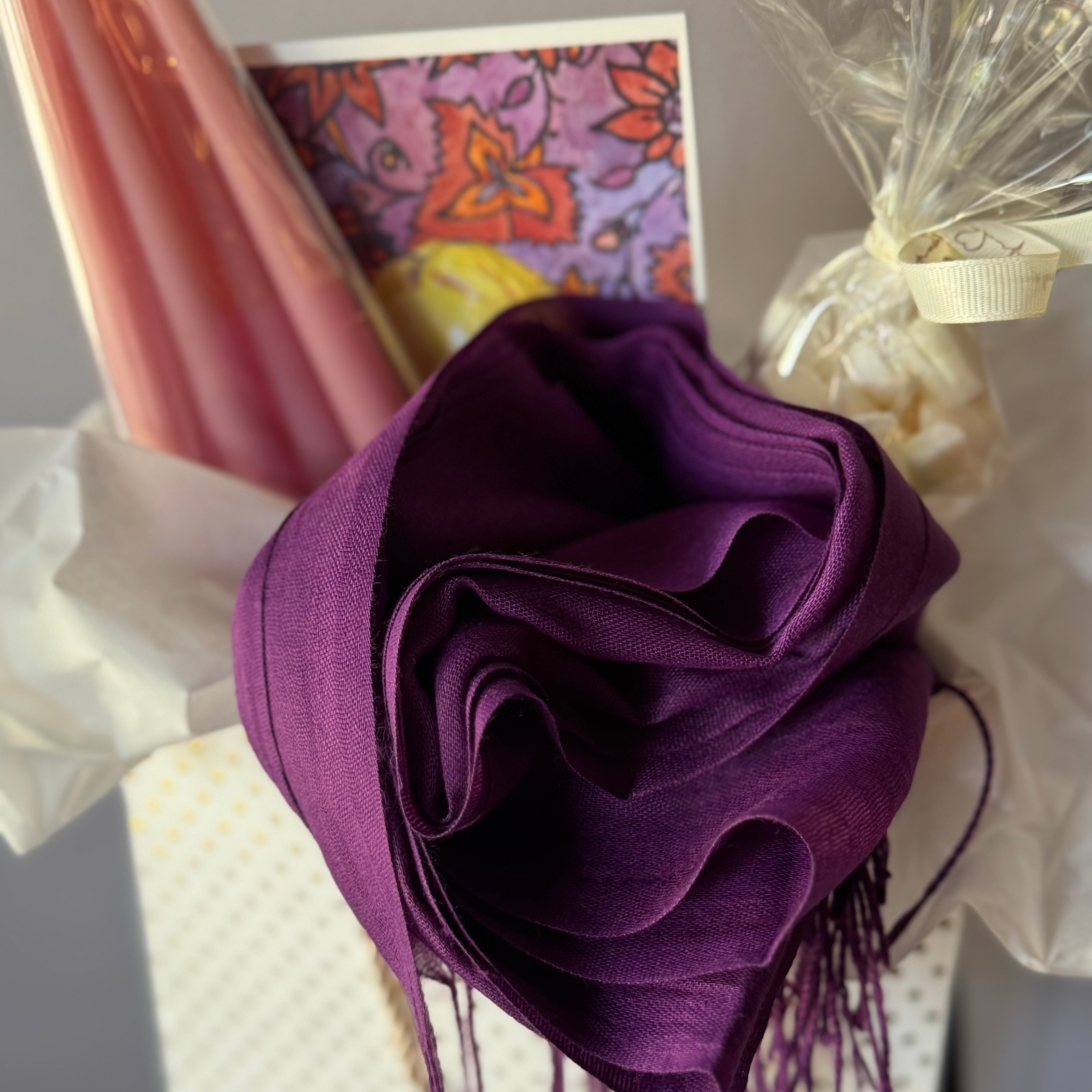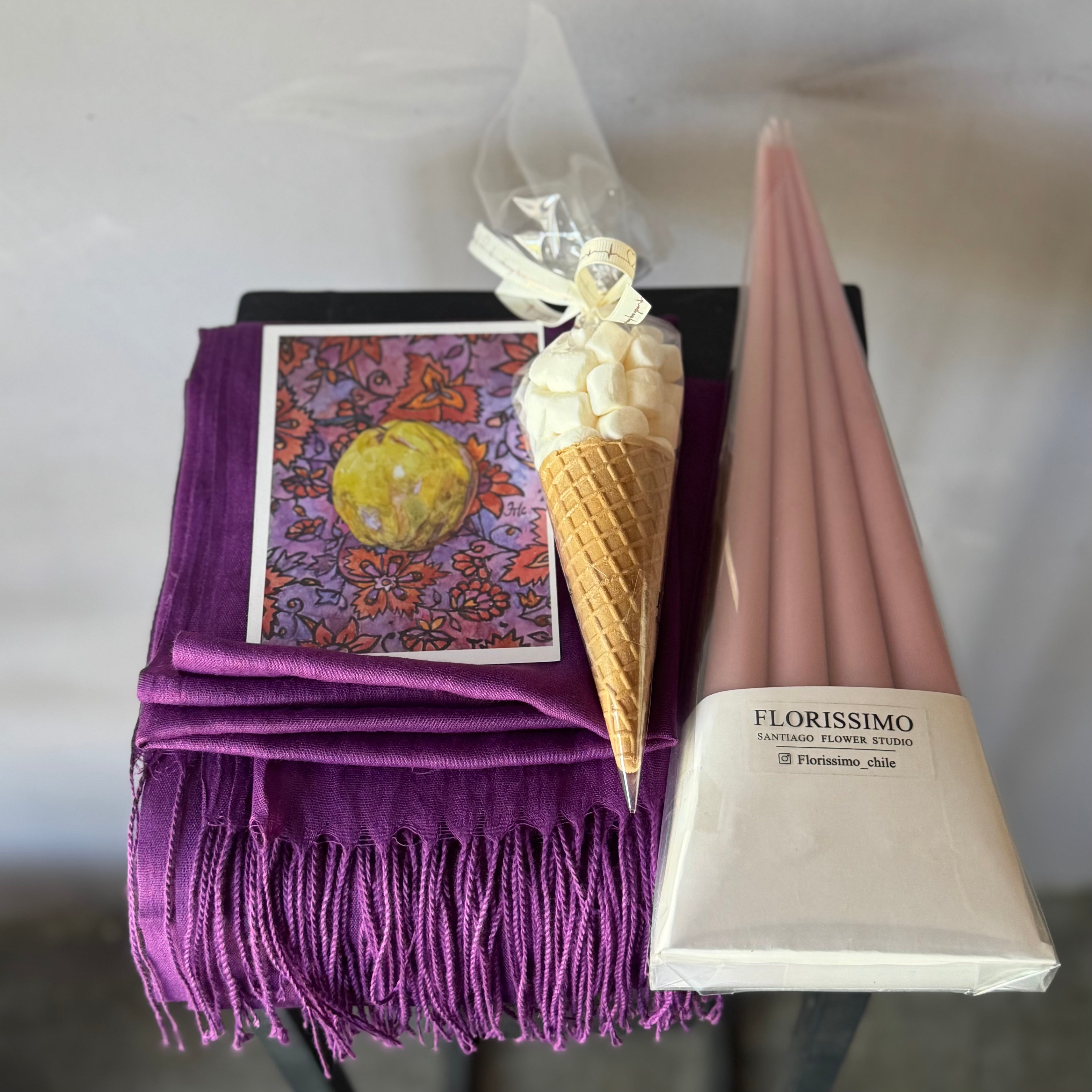 ¡Sorprende a esa mujer especial con nuestro set de regalo en bolsa en tonos púrpuros! Incluye un fino chal de cachemira 100% de 170x70cm en hermosas tonalidades, velas decorativas en tono crema y rosado, una tarjeta con diseño llamativo, y un delicioso cono de marshmallow. ¡Un regalo perfecto para cualquier ocasión!