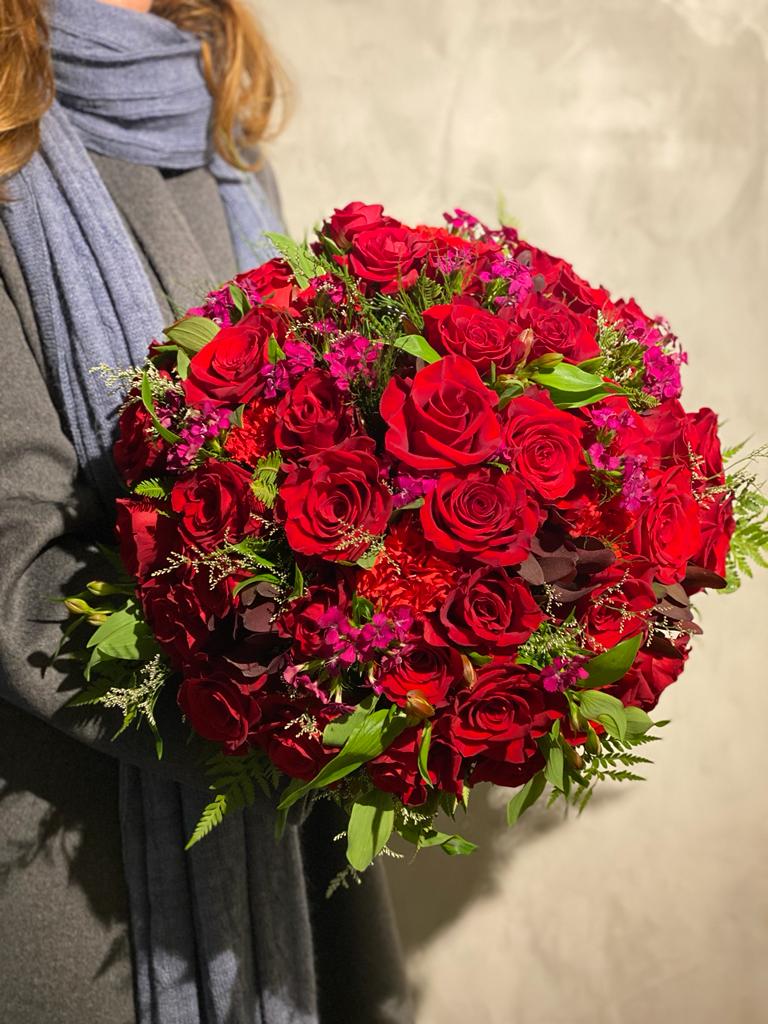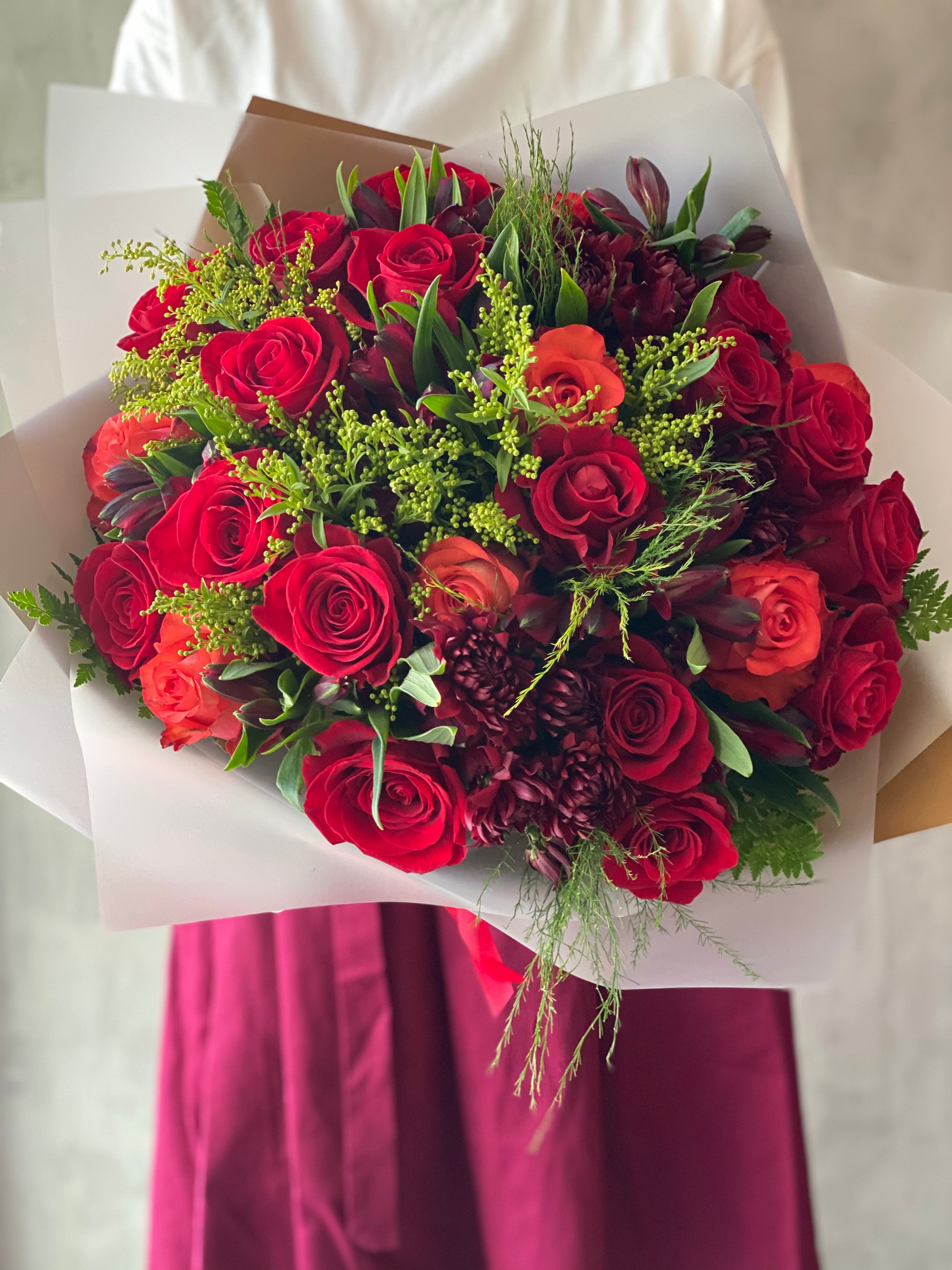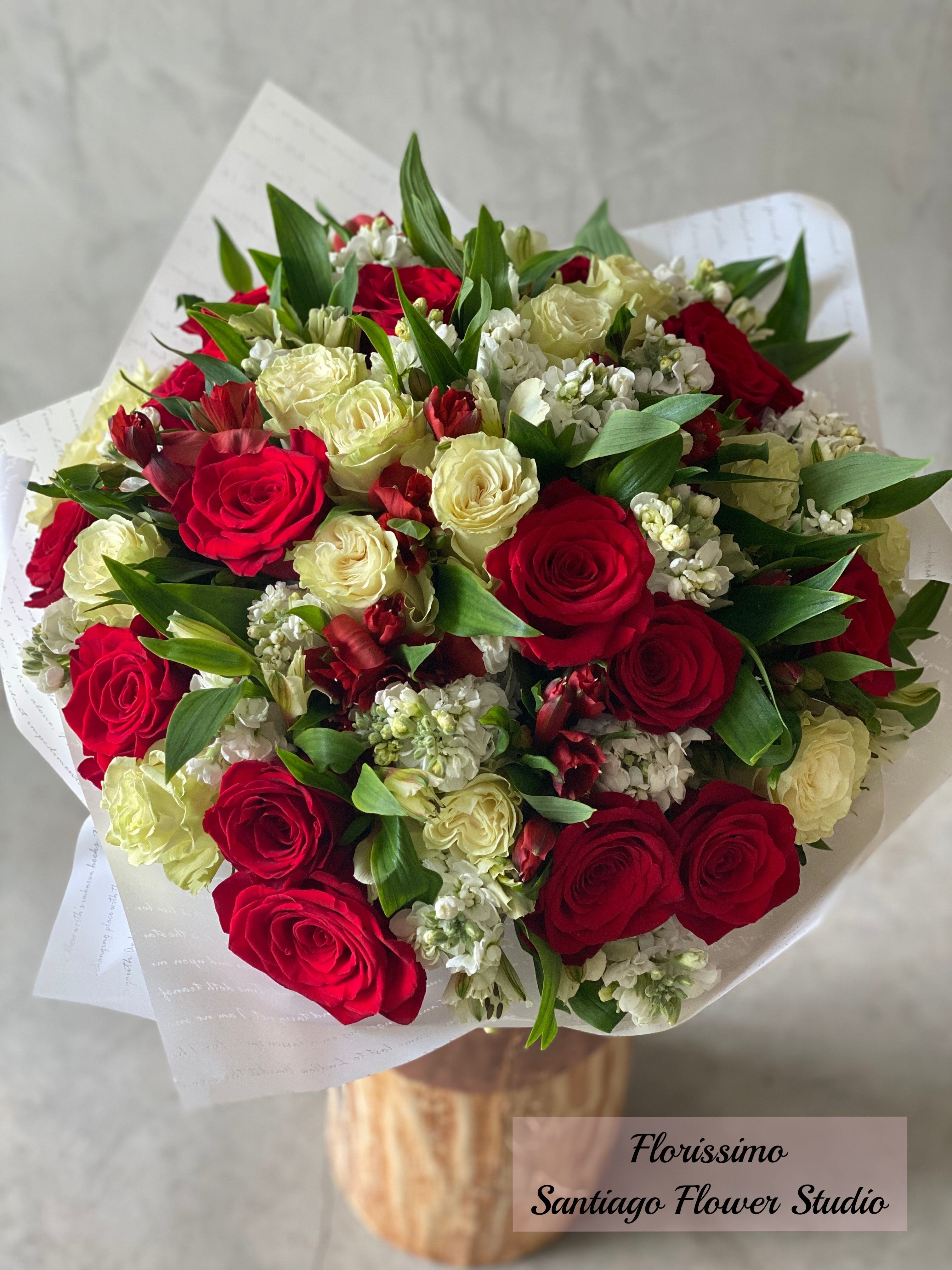 Un impactante ramo compuesto por 50 rosas acompañadas de un delicado surtido de flores del mismo tono y toques de follaje que realzan su frescura. Elegante y lleno de armonía, este arreglo es perfecto para expresar sentimientos profundos con fuerza y belleza. Ideal para celebraciones especiales o para dejar una huella inolvidable.
