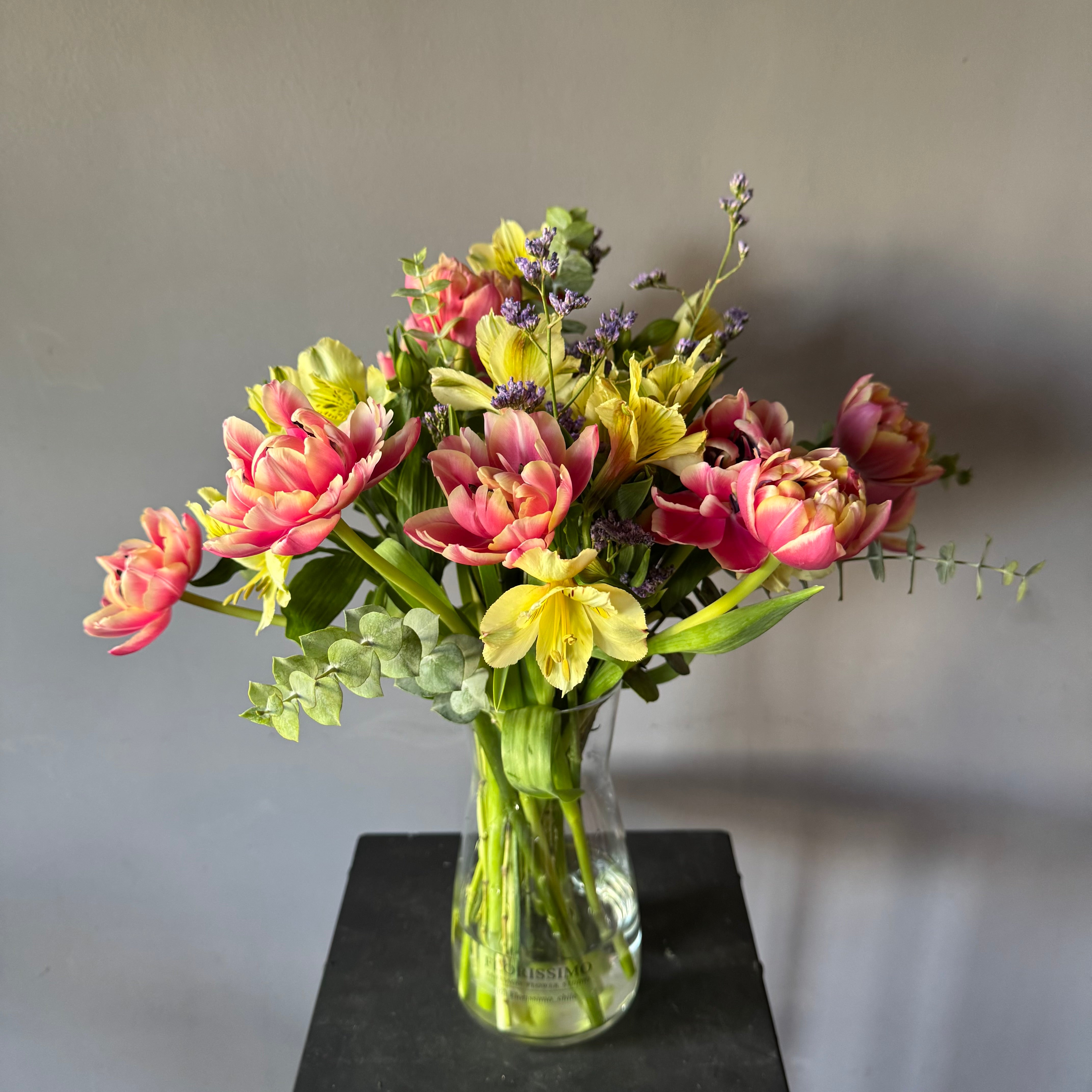 Ramo de 10 tulipanes, alstromerias y eucalipto en florero
