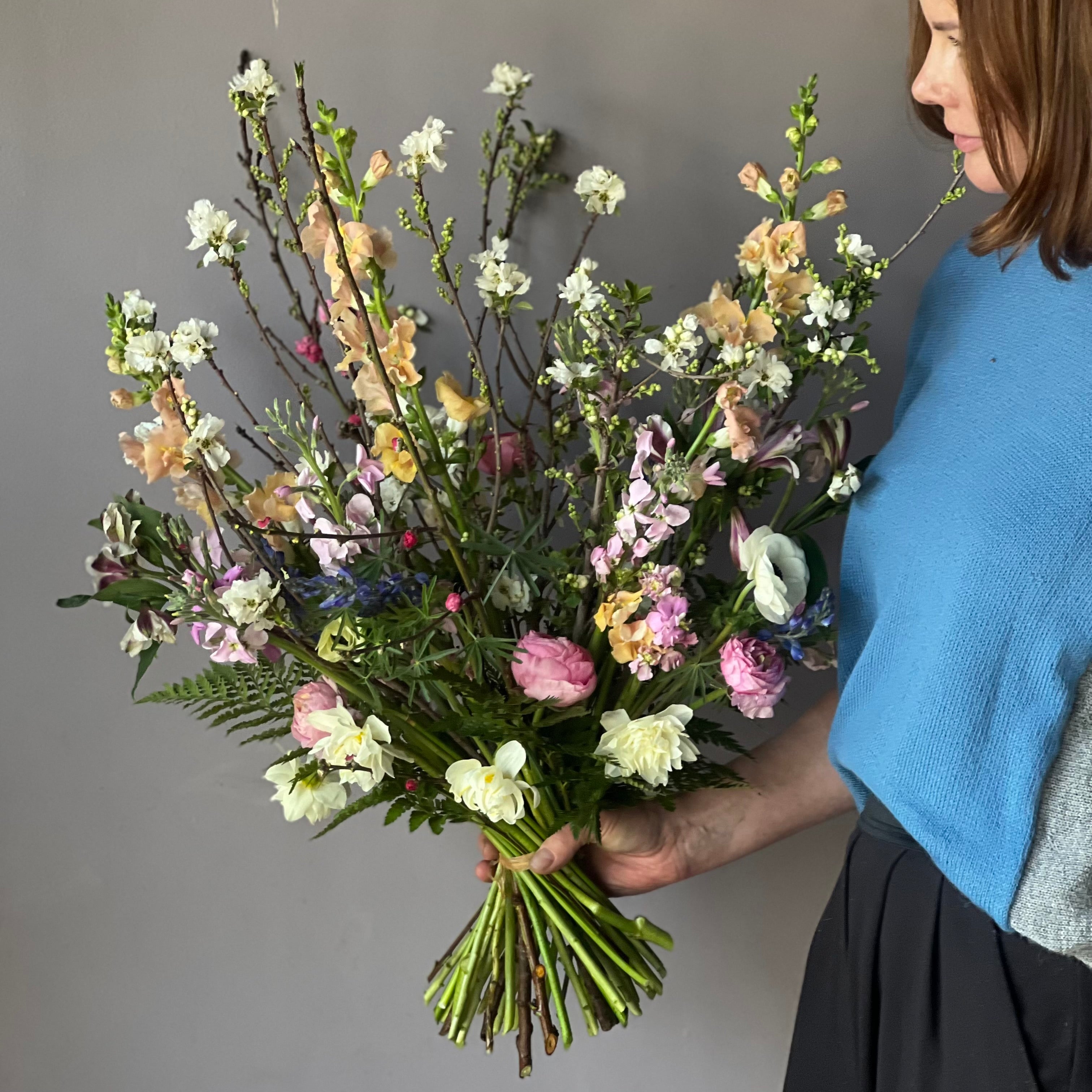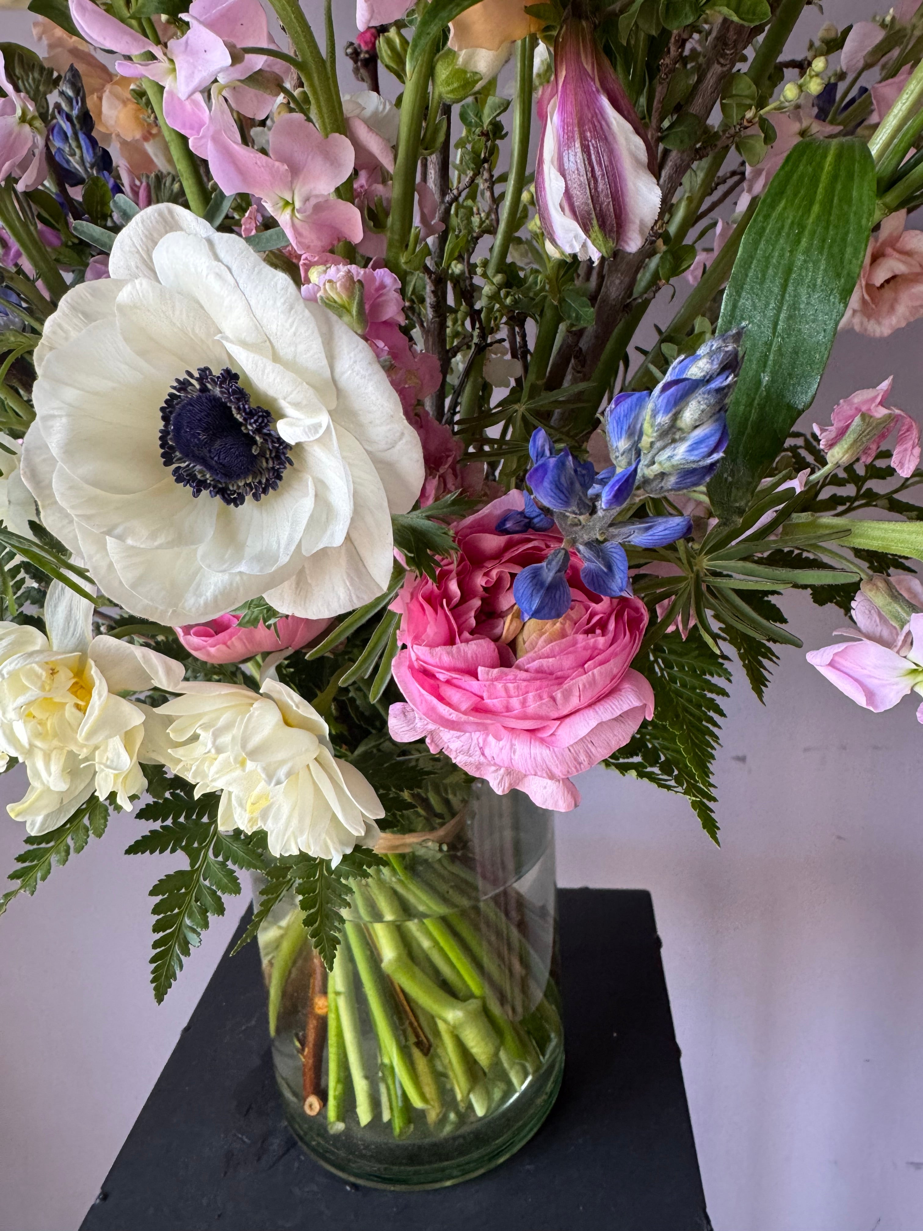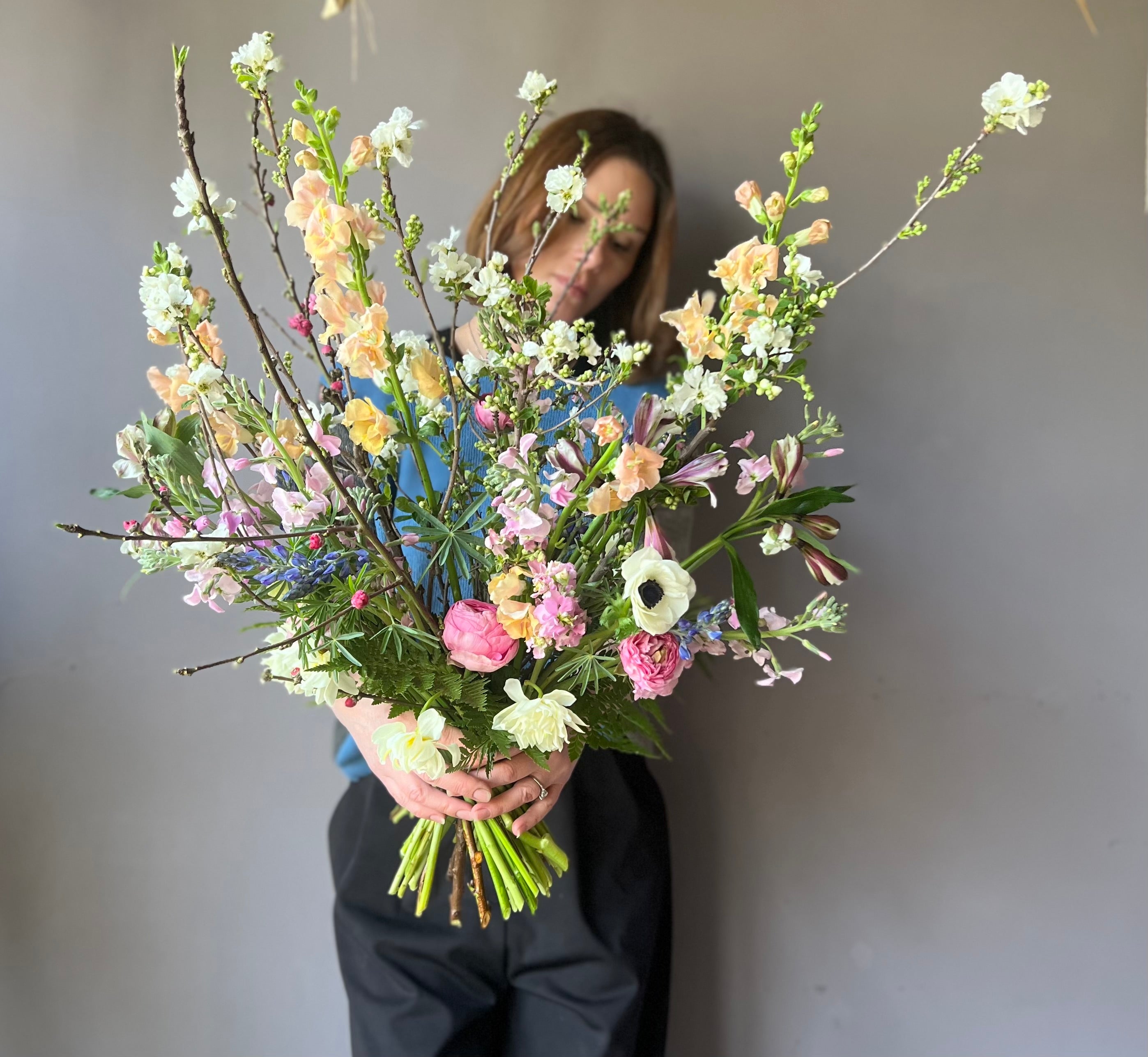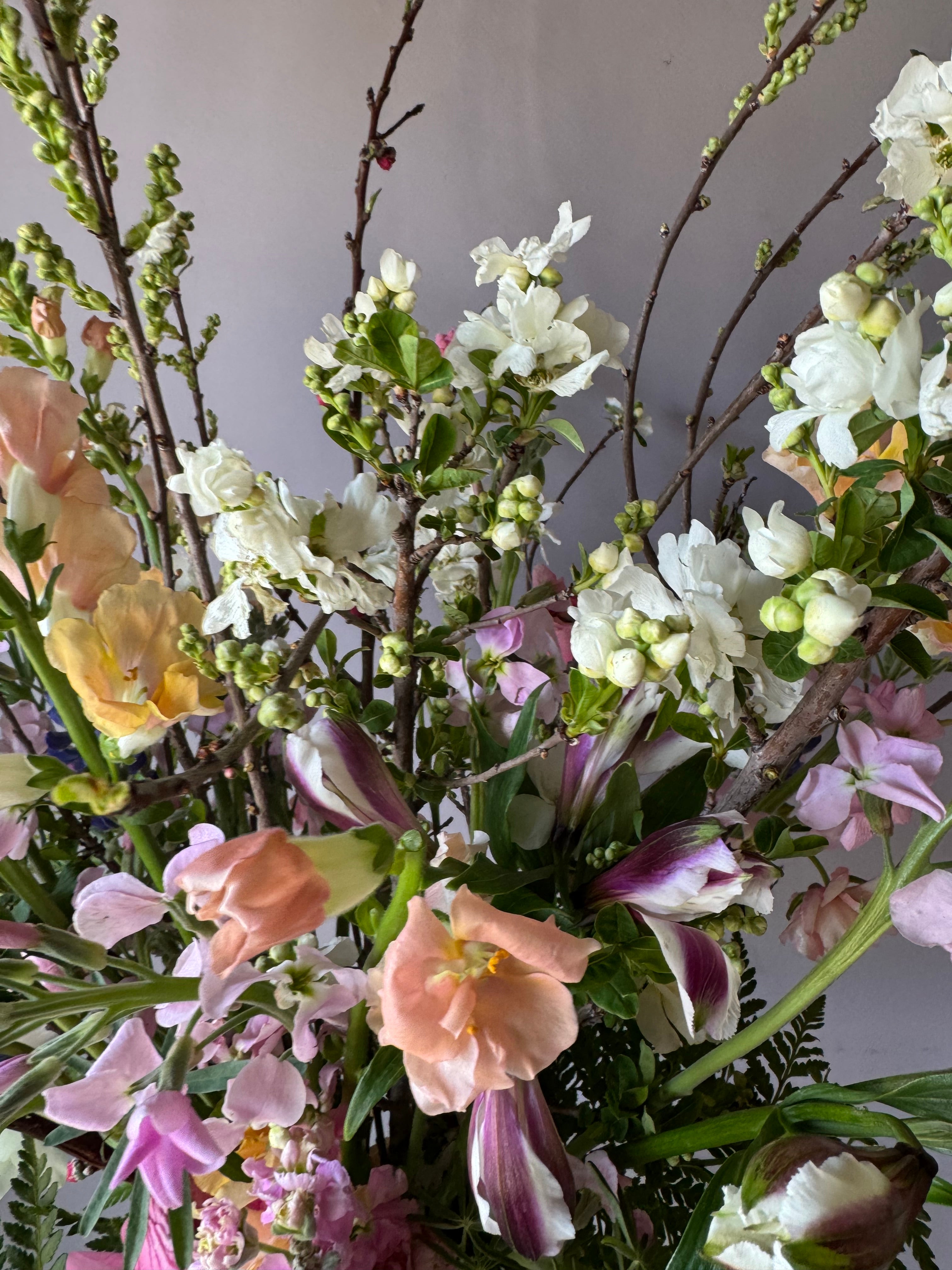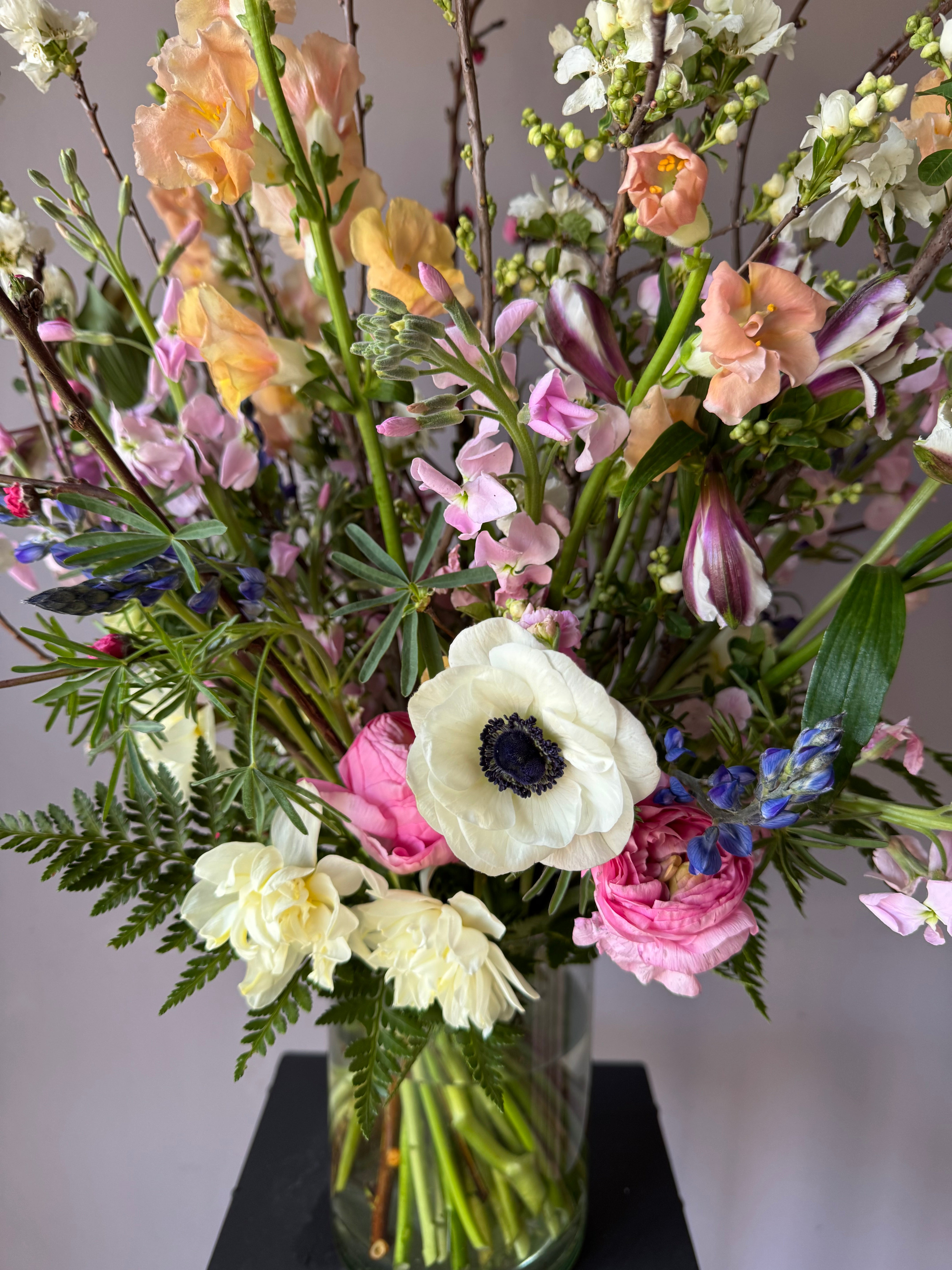 Un ramo alto con flores mixtas de primavera incluye ramas florecidas de ciruelo, anémonas, ranúnculos, perritos, alstromerias en tonos alegres.