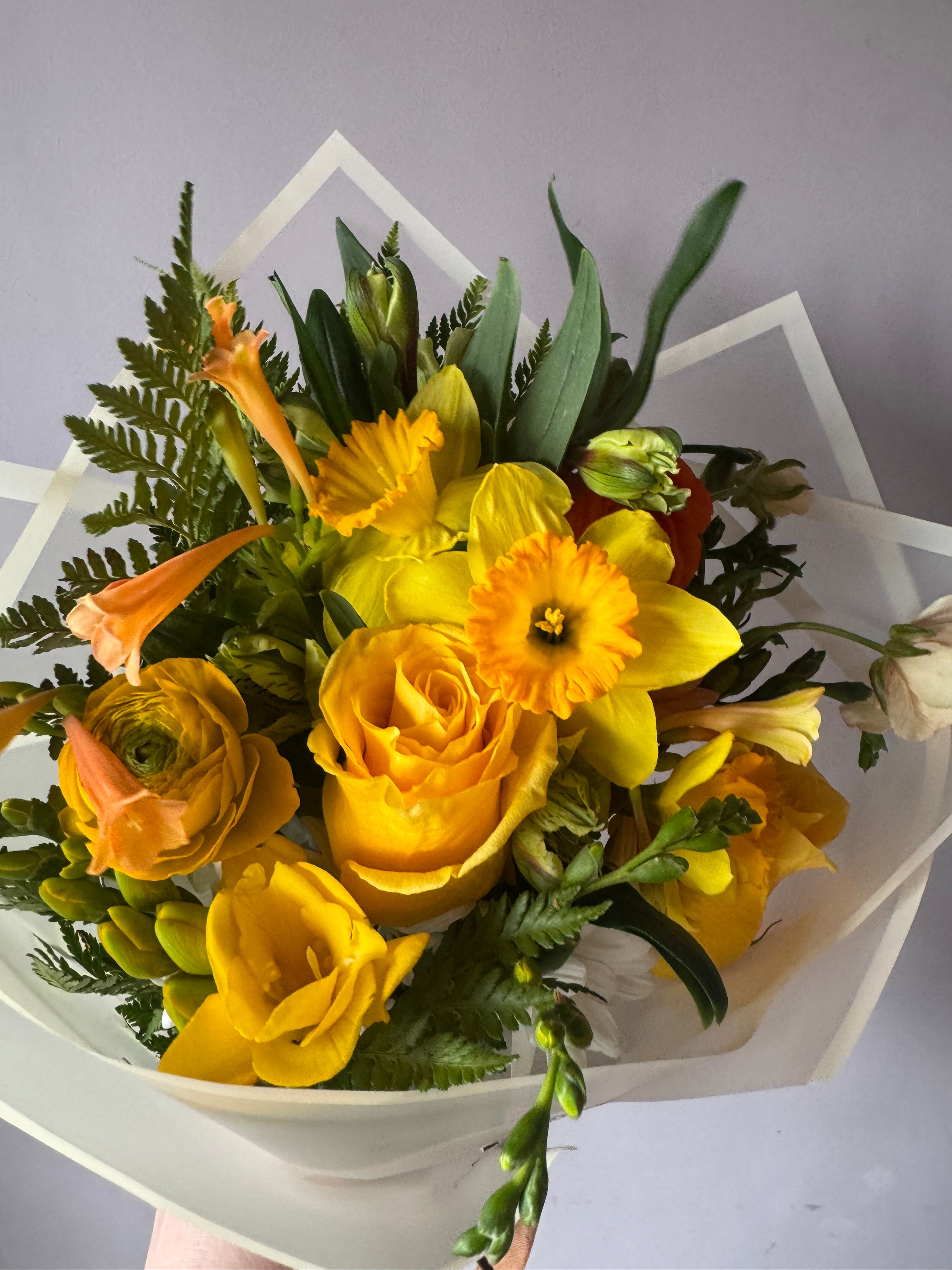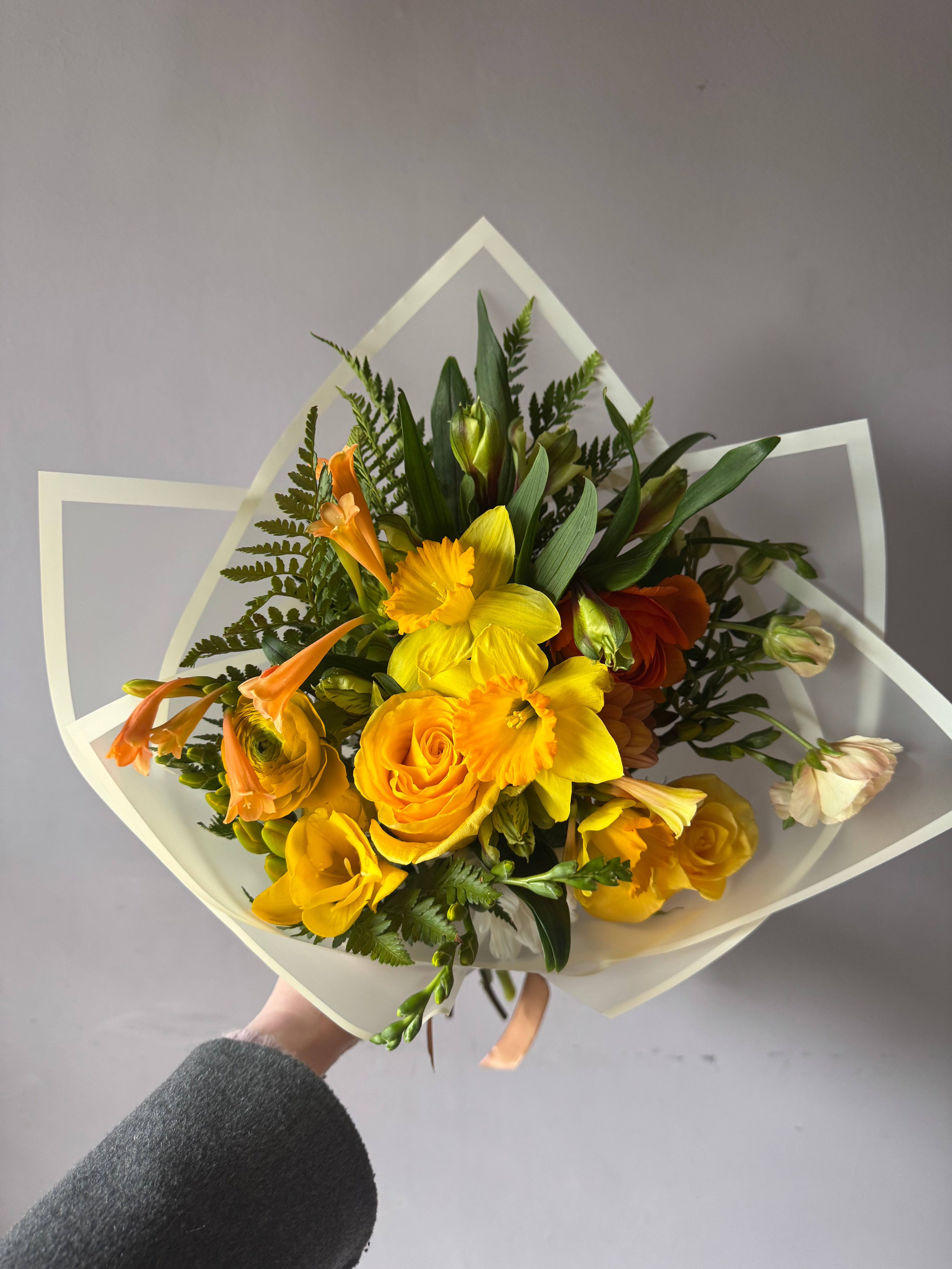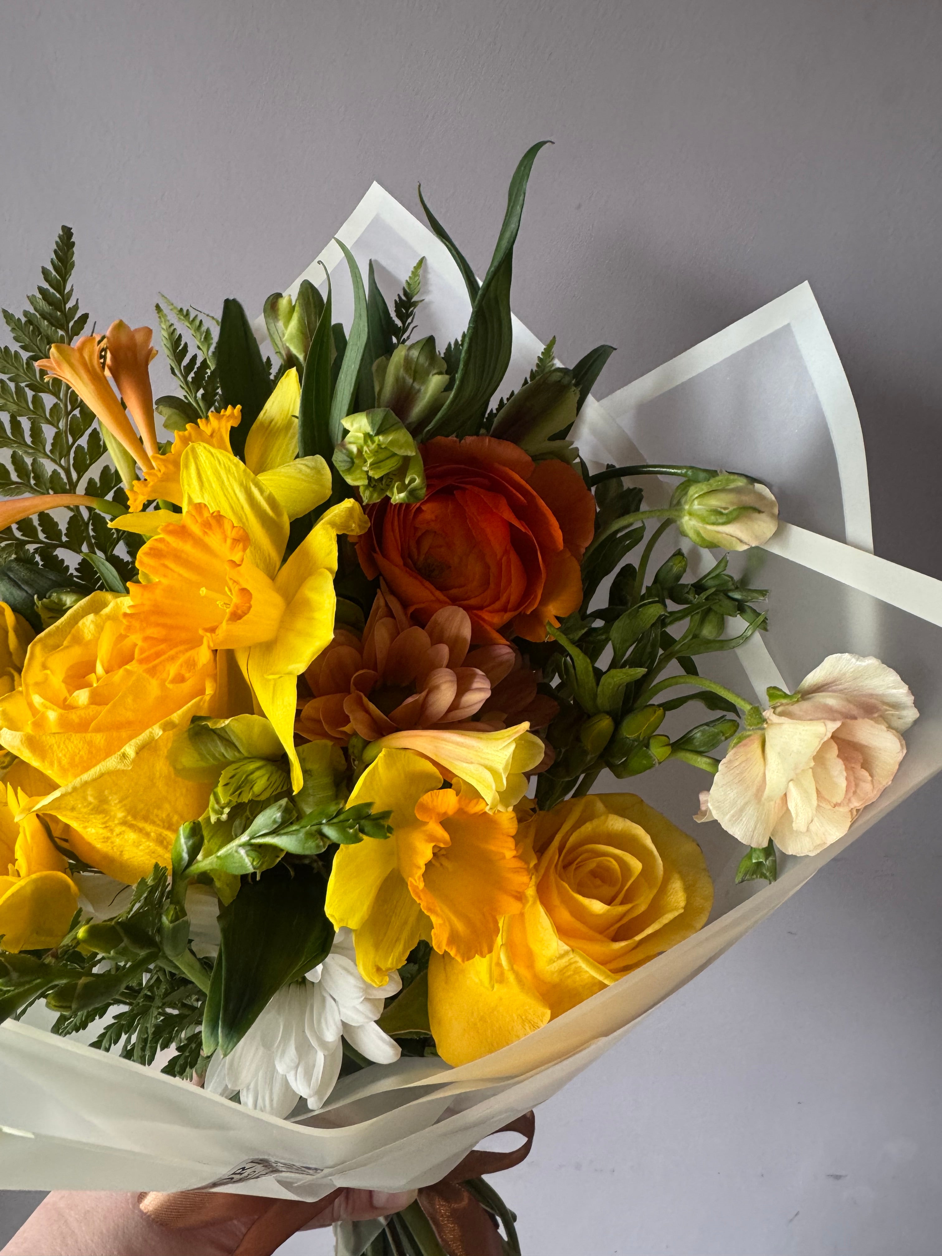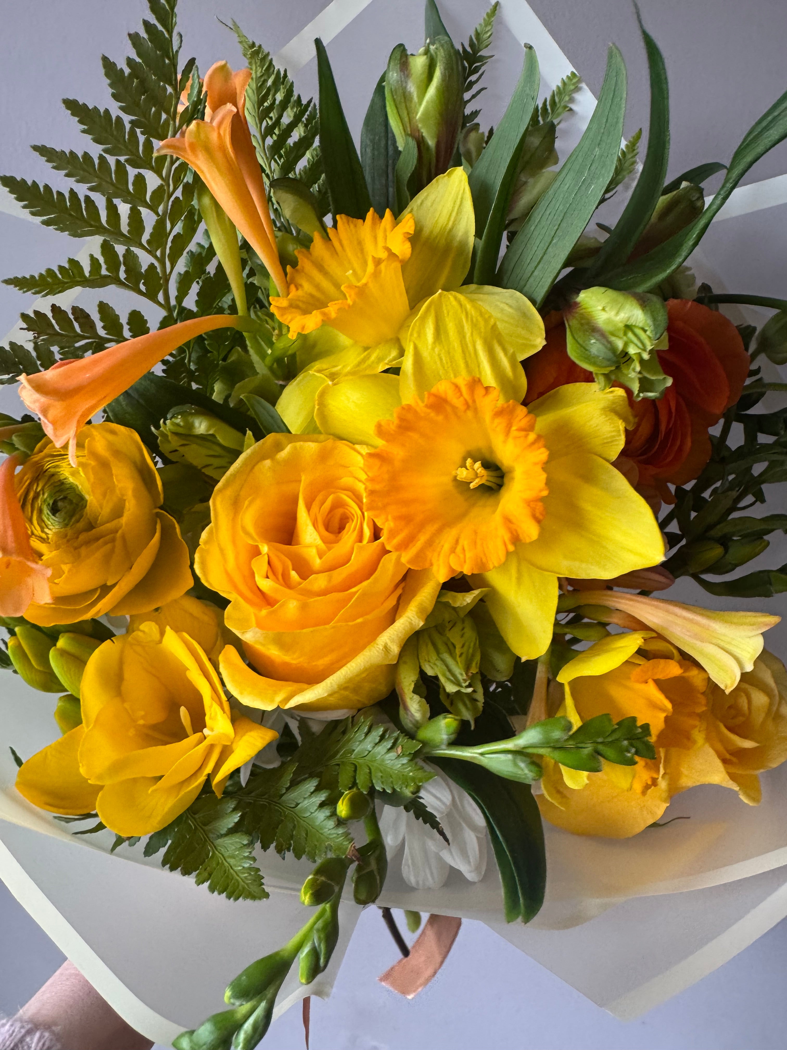 Un ramo mediano de temporada corta en tonos amarillos con narcisos, ranúnculos, ranúnculos butterfly y cyranthus amarillos. Nuestros ramos del día son preciosos y llenos de color y alegría. Elige la tonalidad que más te gusta y recibelo en tu casa