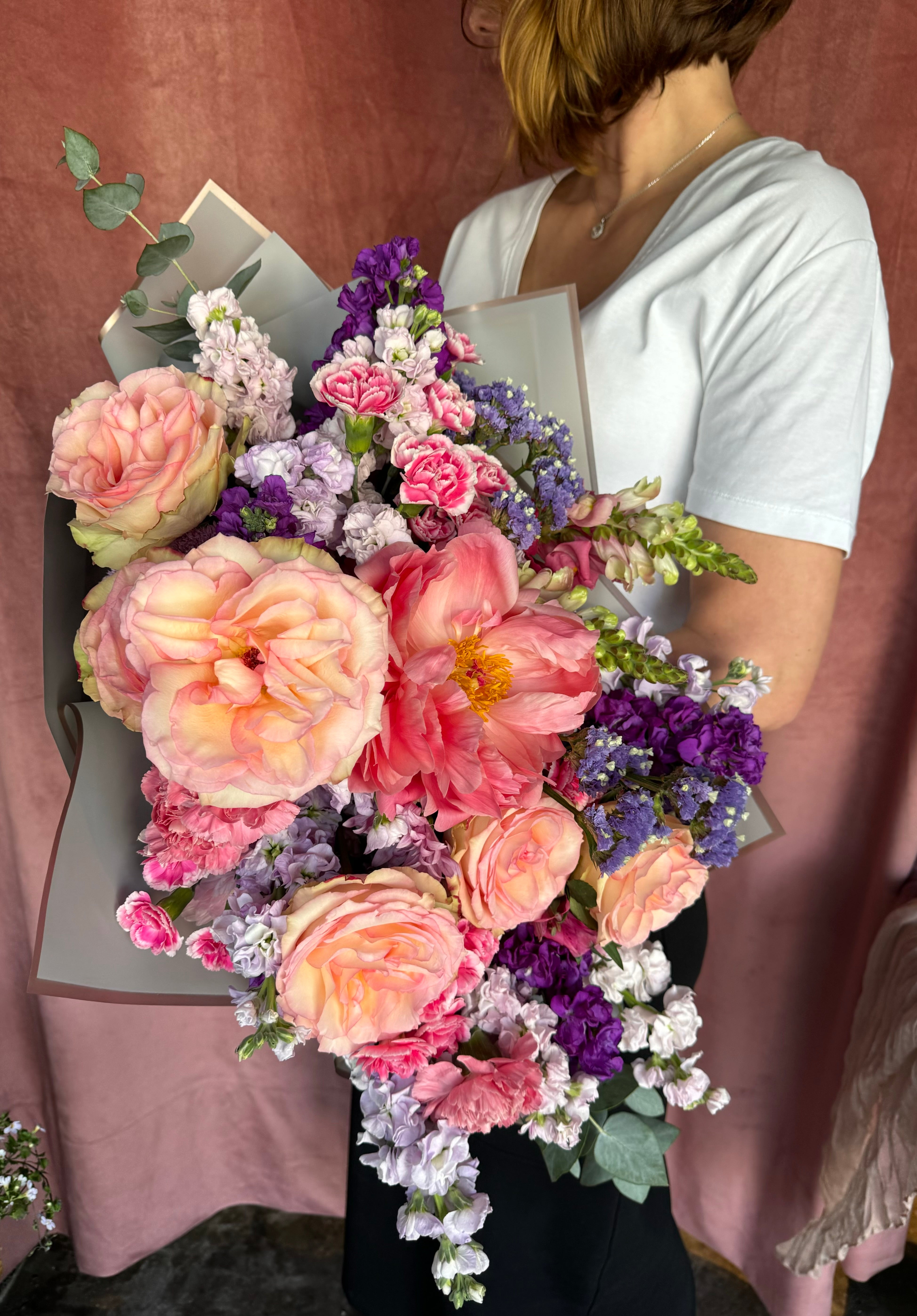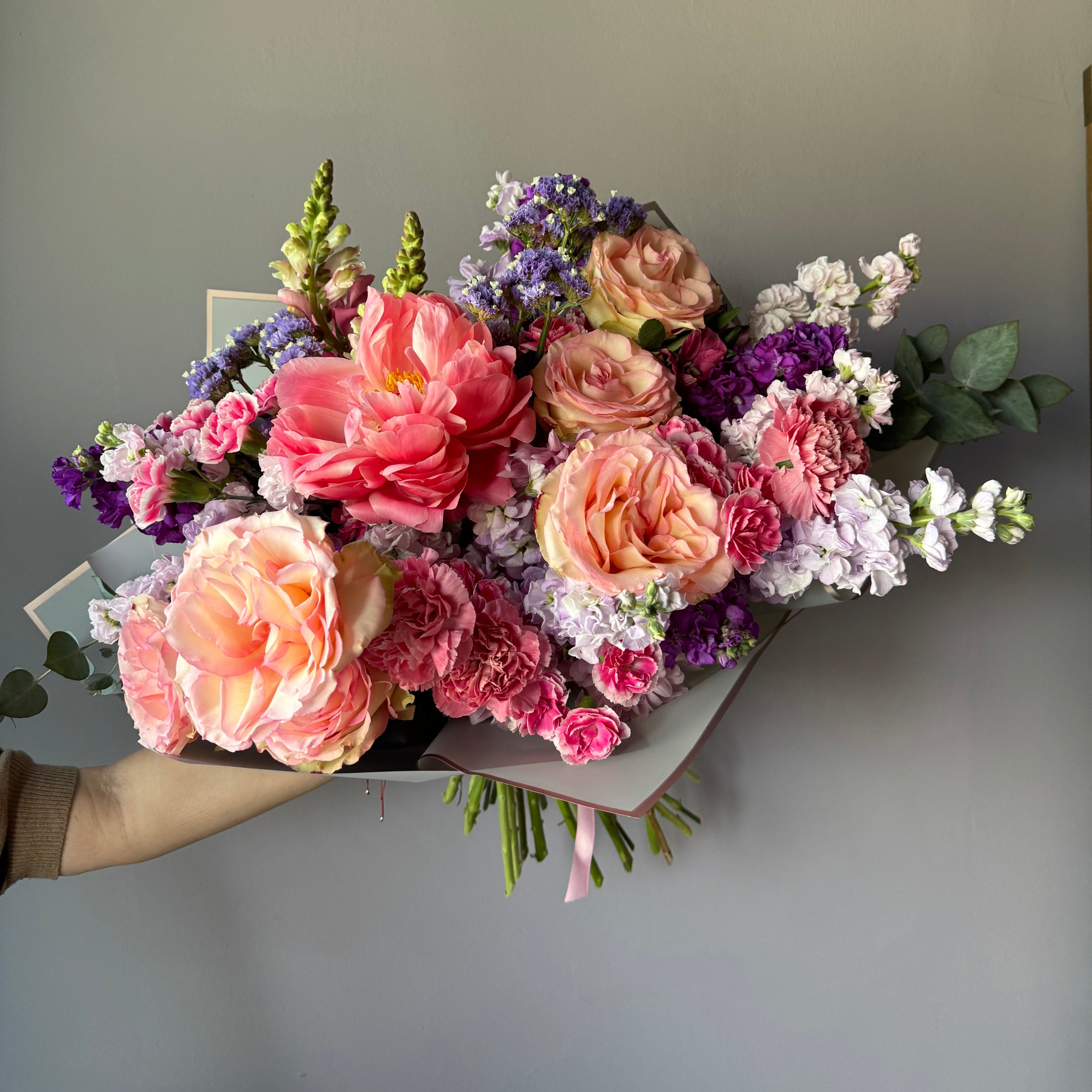 Ramo mixto grande con primeras peonias de temporada de variedad coral sunset, rosas rosadas y flores mixtas.