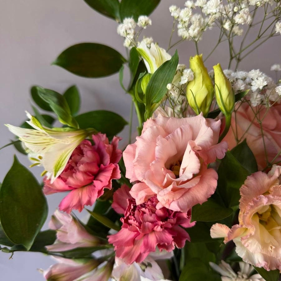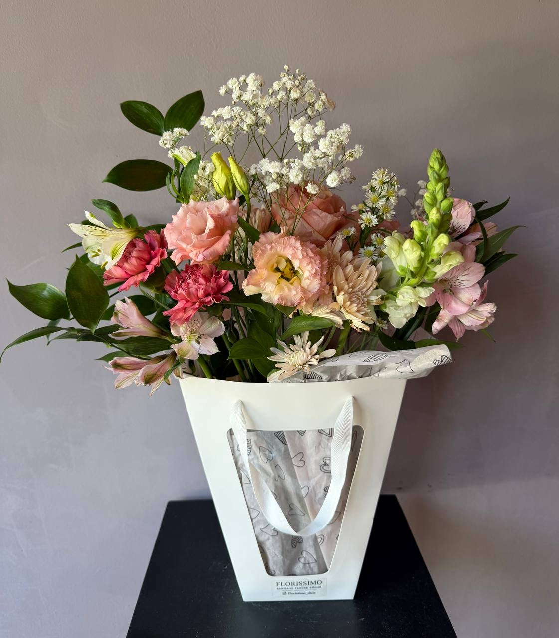 Bolsa completa de flores en tonos rosados, diseñada para transmitir delicadeza y romanticismo. Una composición suave y armoniosa, ideal para sorprender con un gesto dulce y elegante en ocasiones especiales.