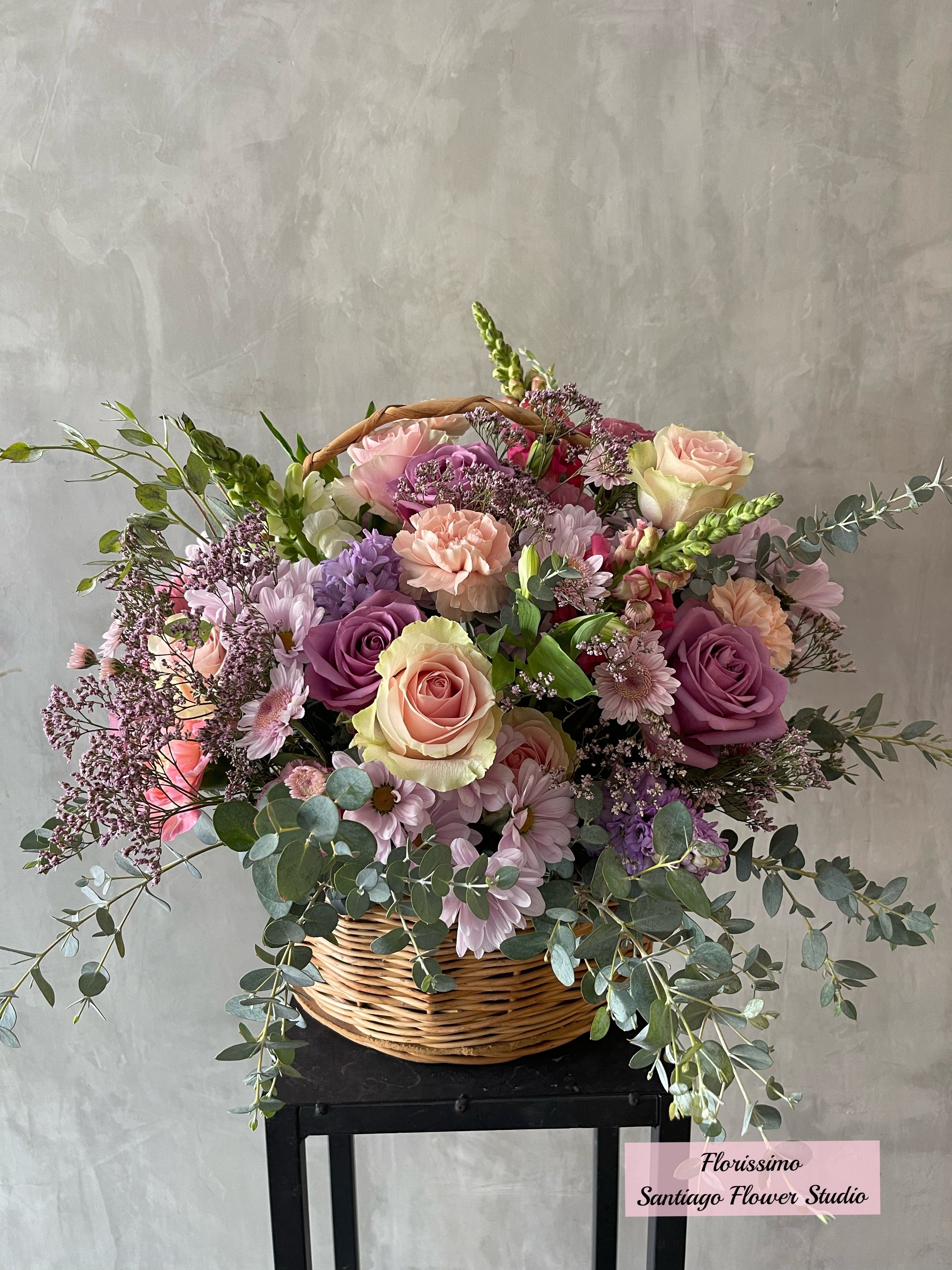 Un precioso canasto de flores frescas en tonos rosados pasteles, para hacer un regalo inolvidable y único!