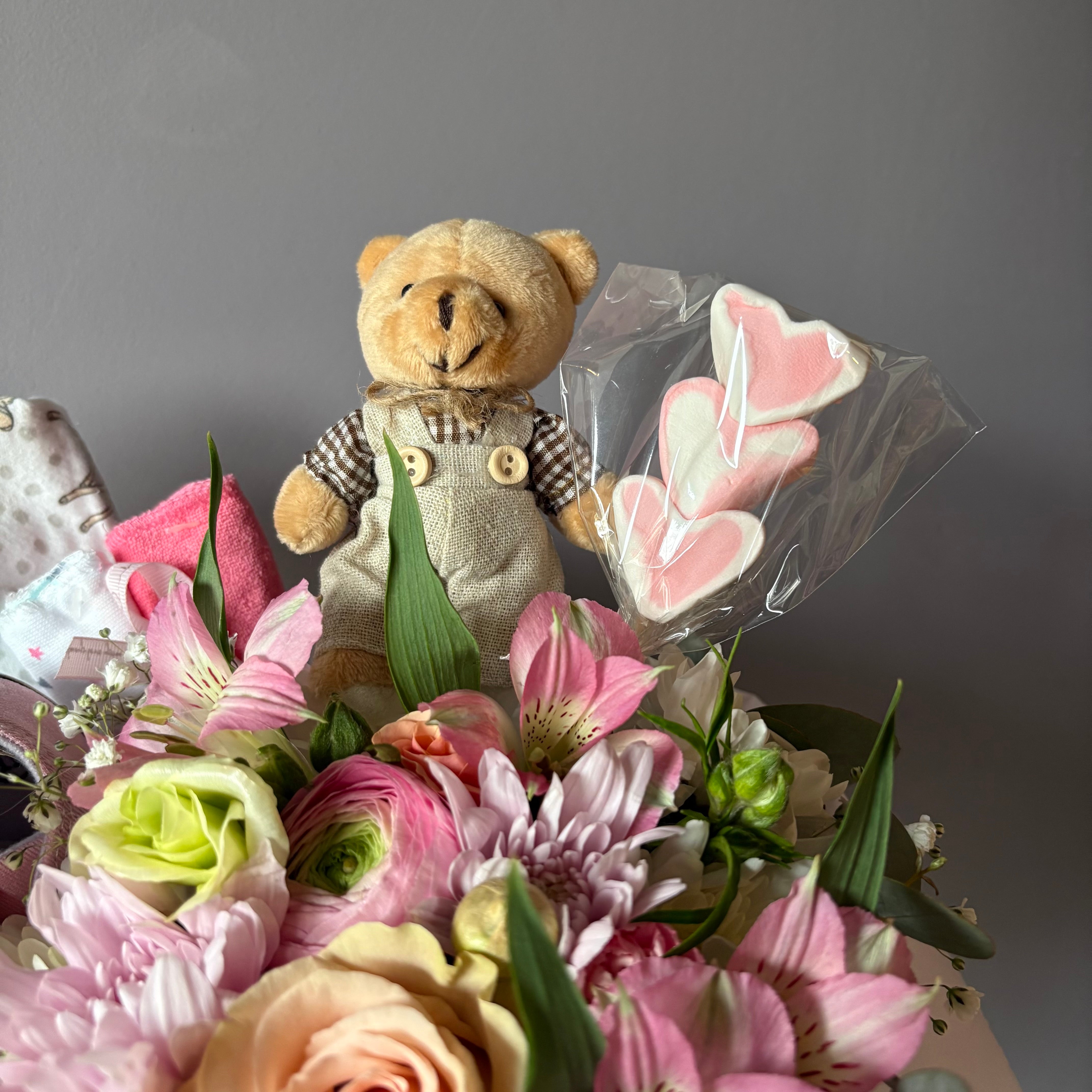 Un lindo conjunto en caja para nacimiento de una niña. Tiene un arreglo floral chico, bombones con guindas bañados en chocolate de leche, un dulce de marshmallow y varios regalitos lindos y útiles para primeros meses de vida del bebé, como: