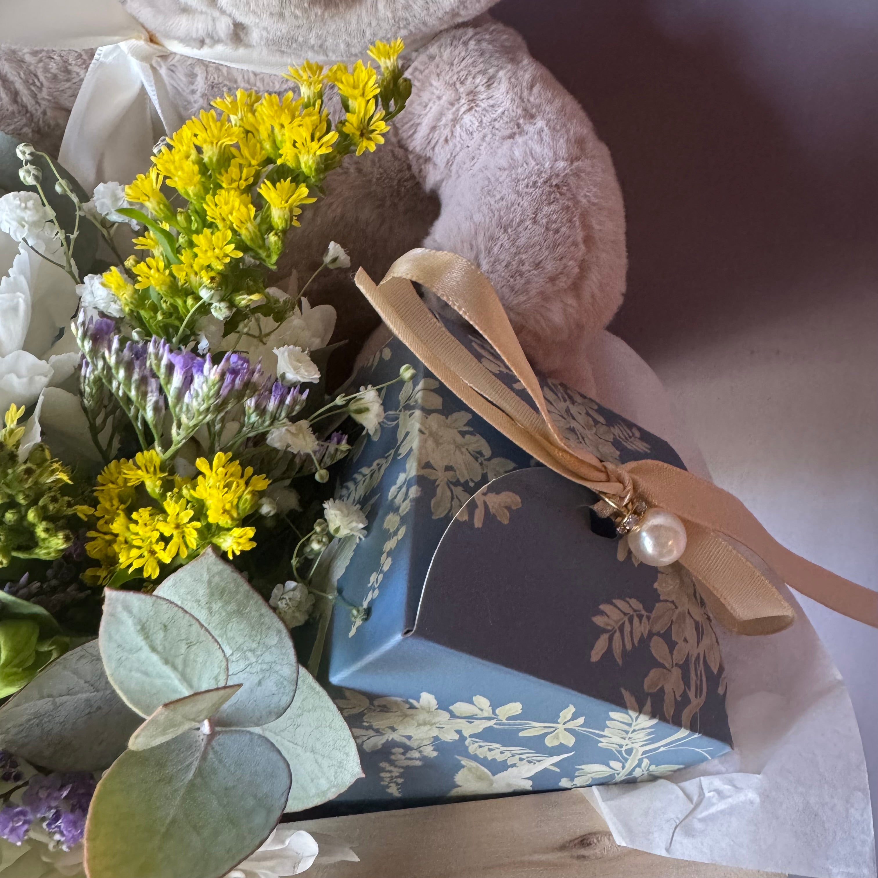 Una linda caja con ajuar de regalo para nacimiento de un niño con un arreglo floral mediano y varios regalitos pequeños: