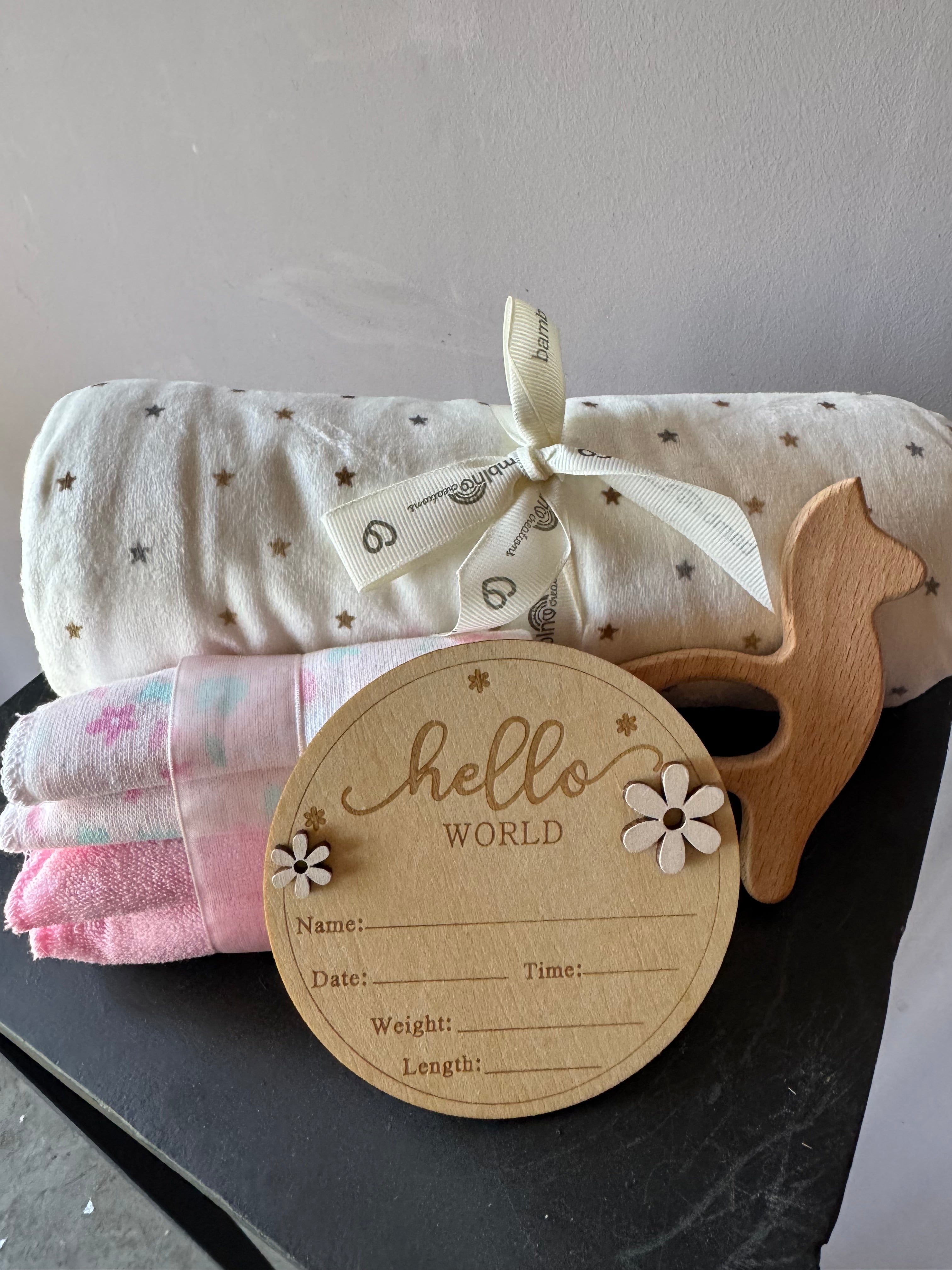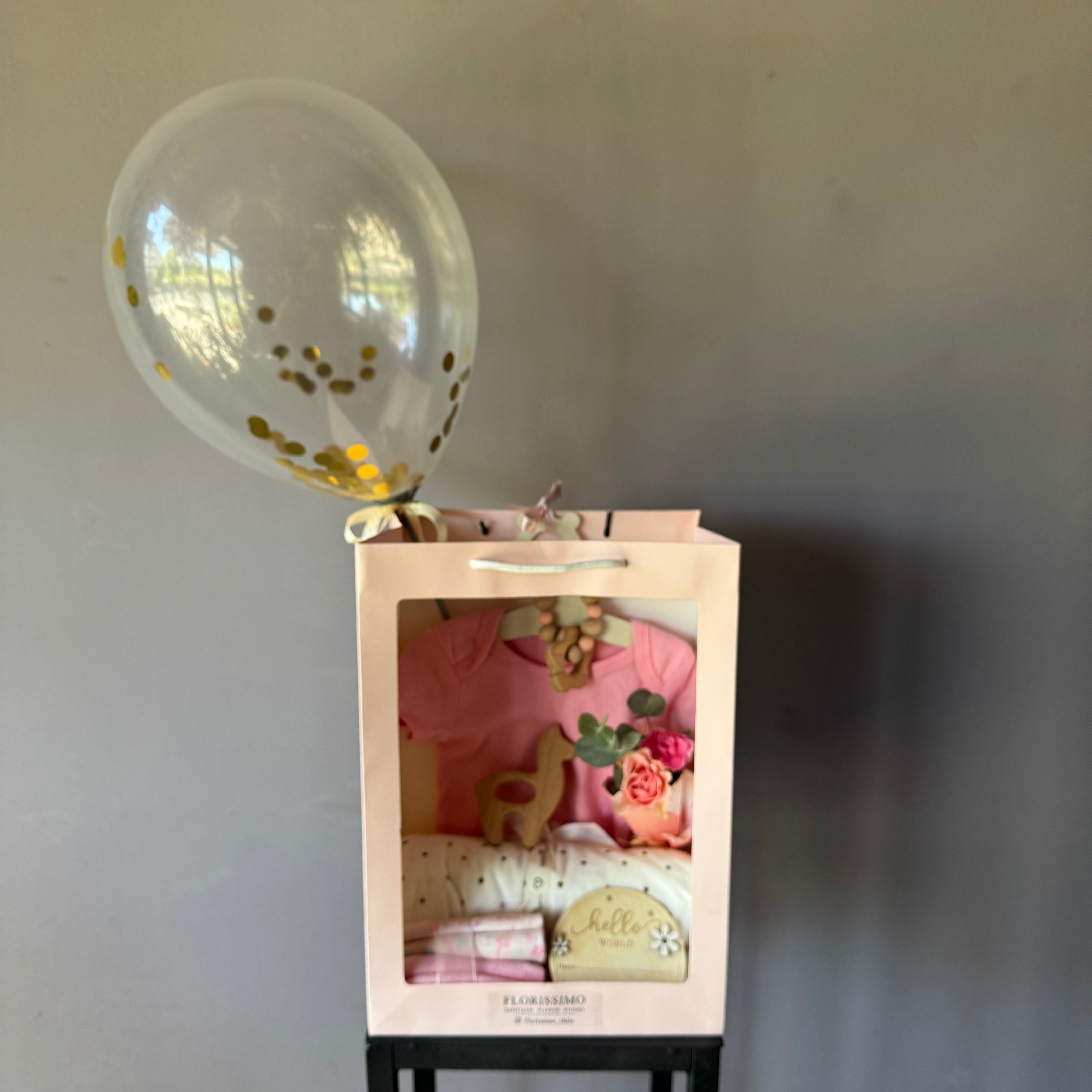 Bolsa rectangular con ventana transparente con kit de bienvenida para recién nacida. Puede ser regalado para nacimiento o para un baby shower. Viene con globo de color rosado pálido, un ramito de flores frescas. Tambien contiene: