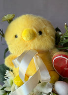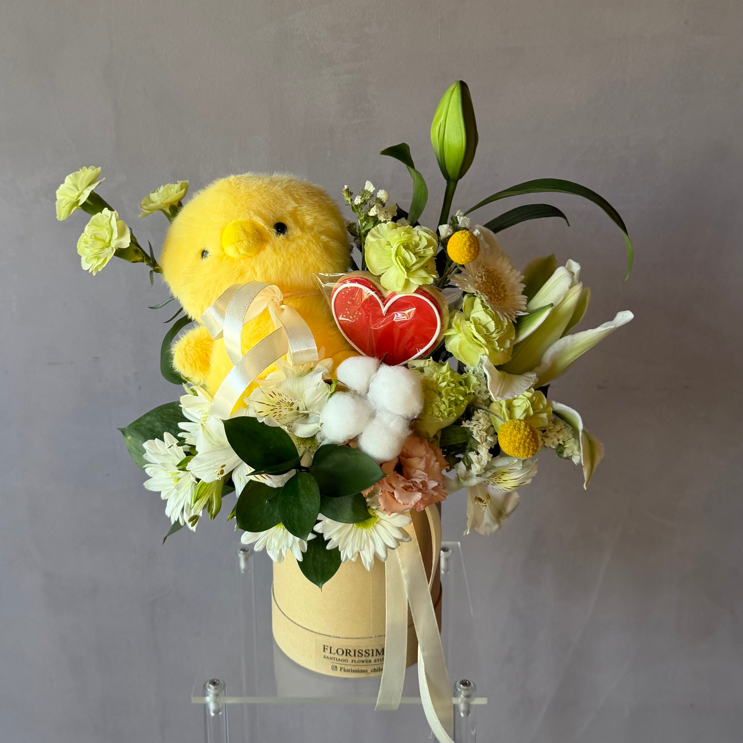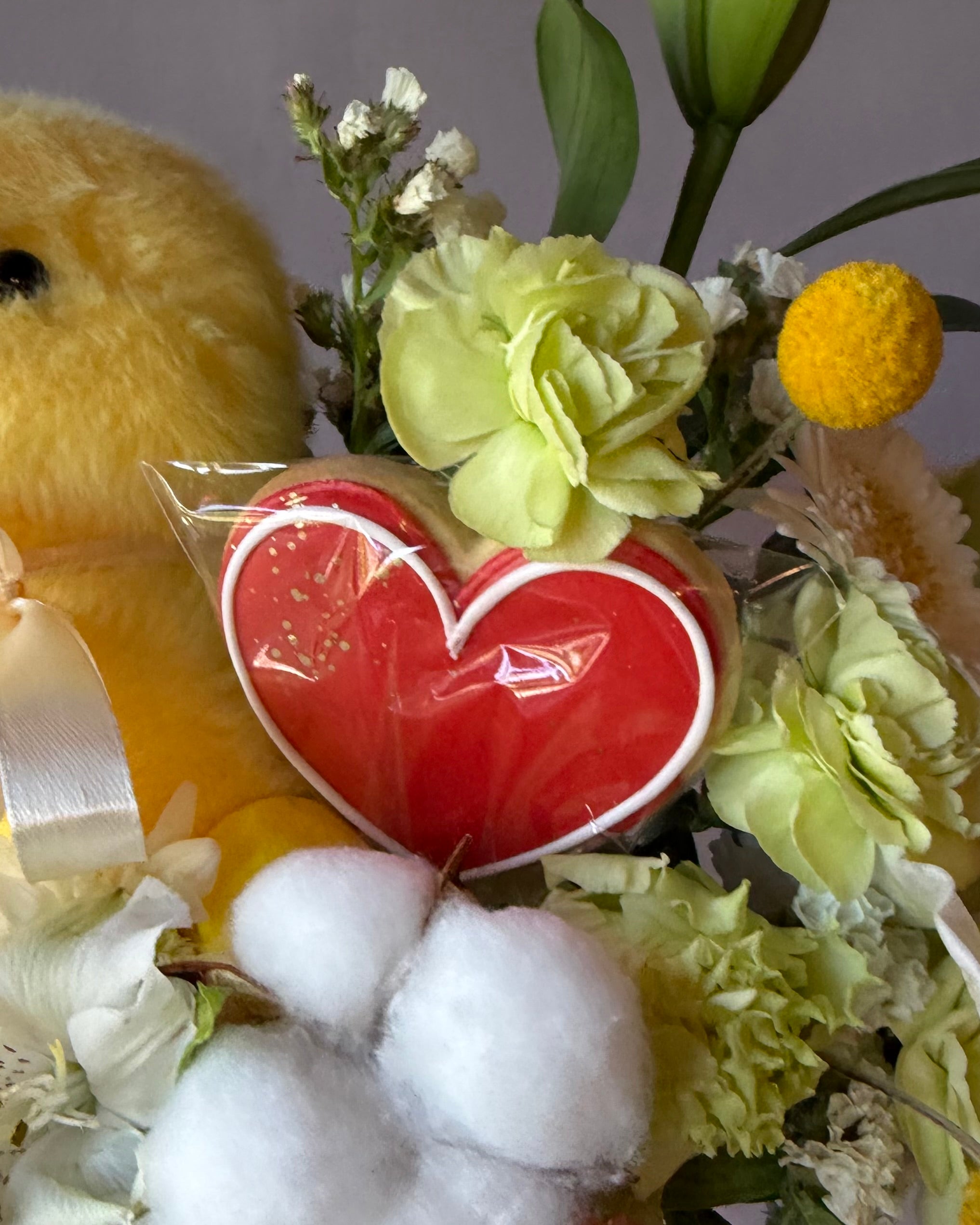 Encantador arreglo floral en caja, compuesto por flores frescas en tonos suaves y acompañado de una galleta artesanal en forma de corazón rojo, símbolo de cariño y buenos deseos. Un detalle delicado y significativo, ideal para celebrar expresar amor, gratitud o sorprender en cualquier momento especial.