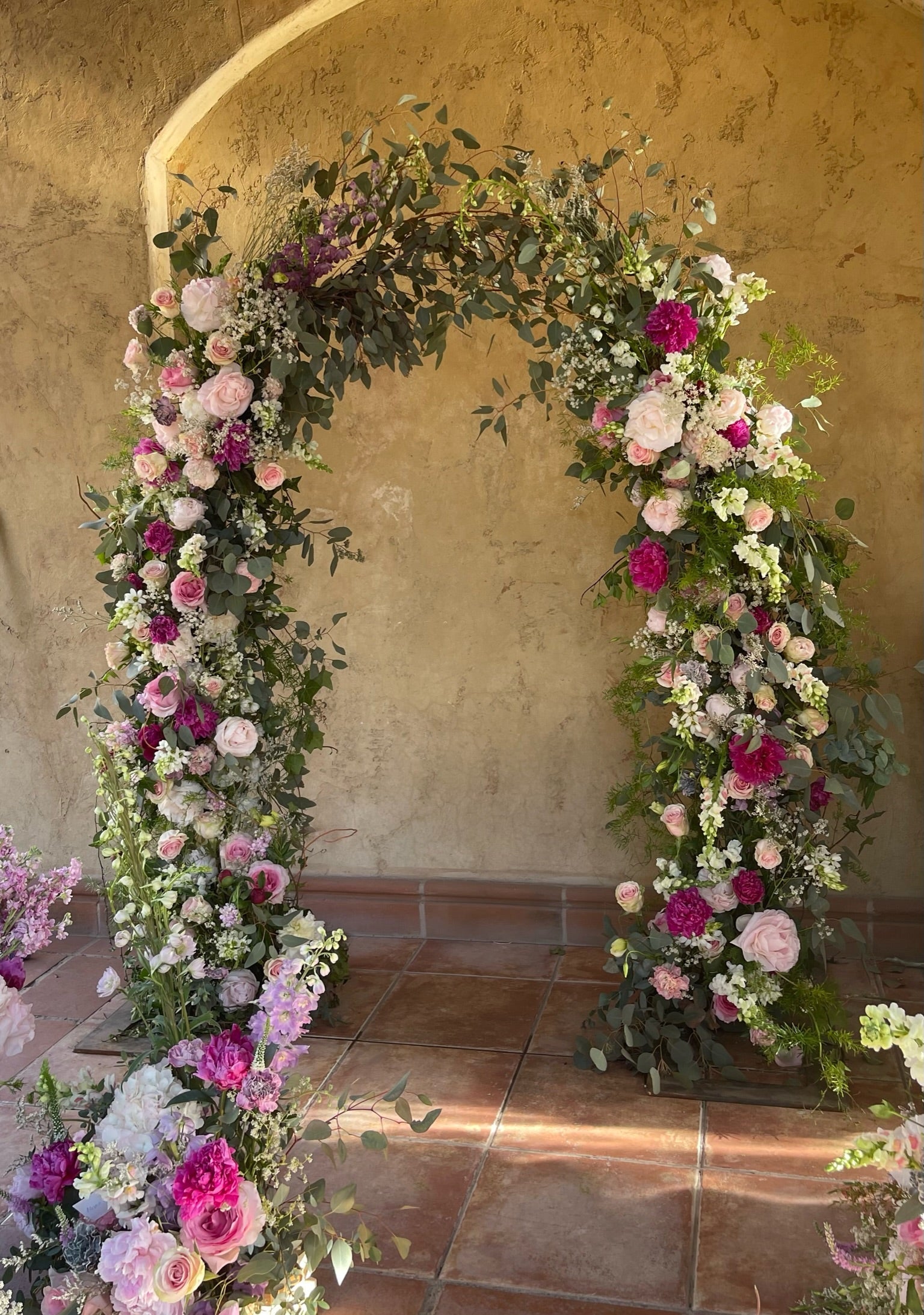 El arco de 2 m de altura y 170 cm de ancho full decorado con flores frescas y hojas verdes.