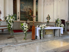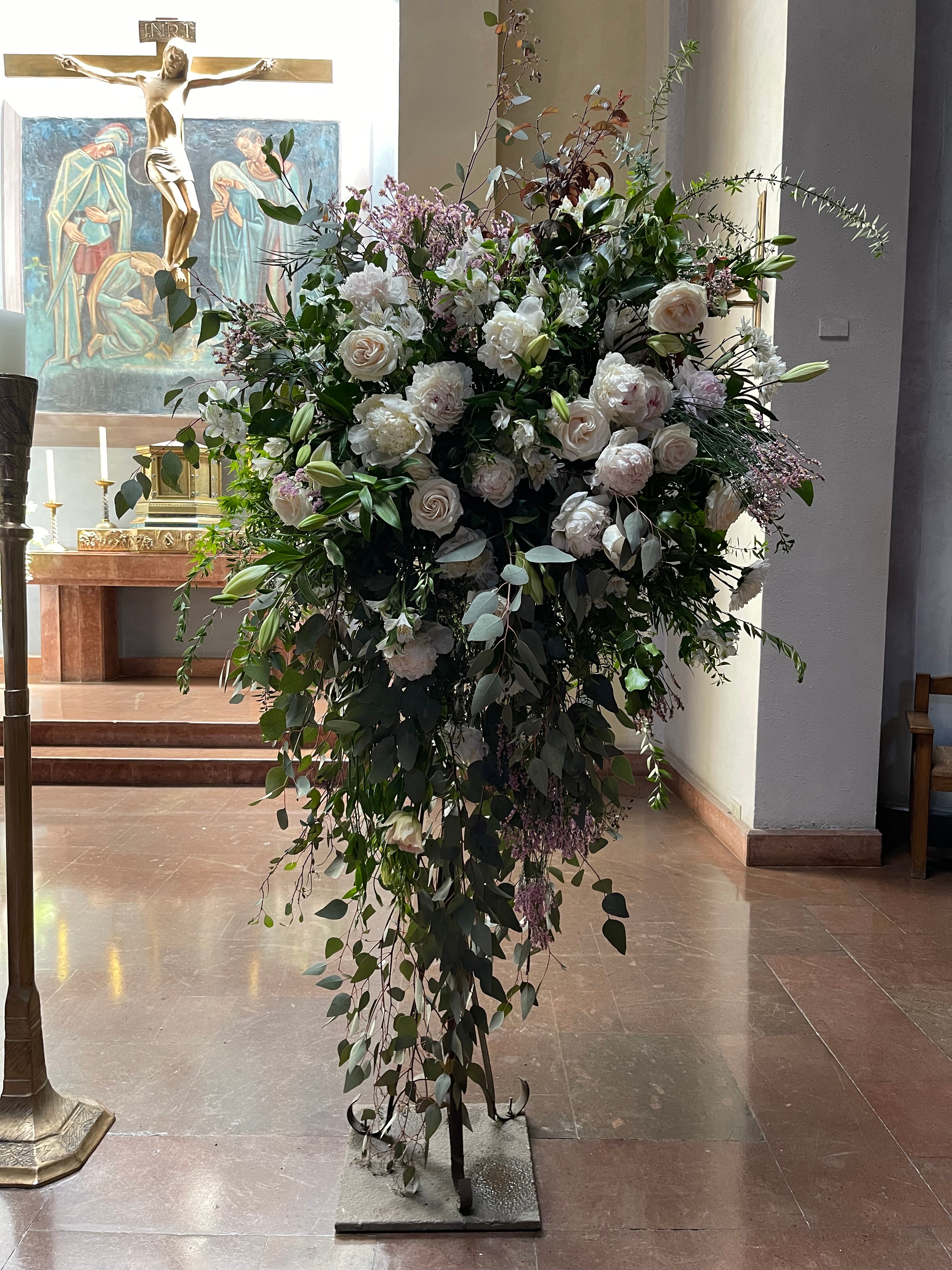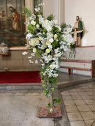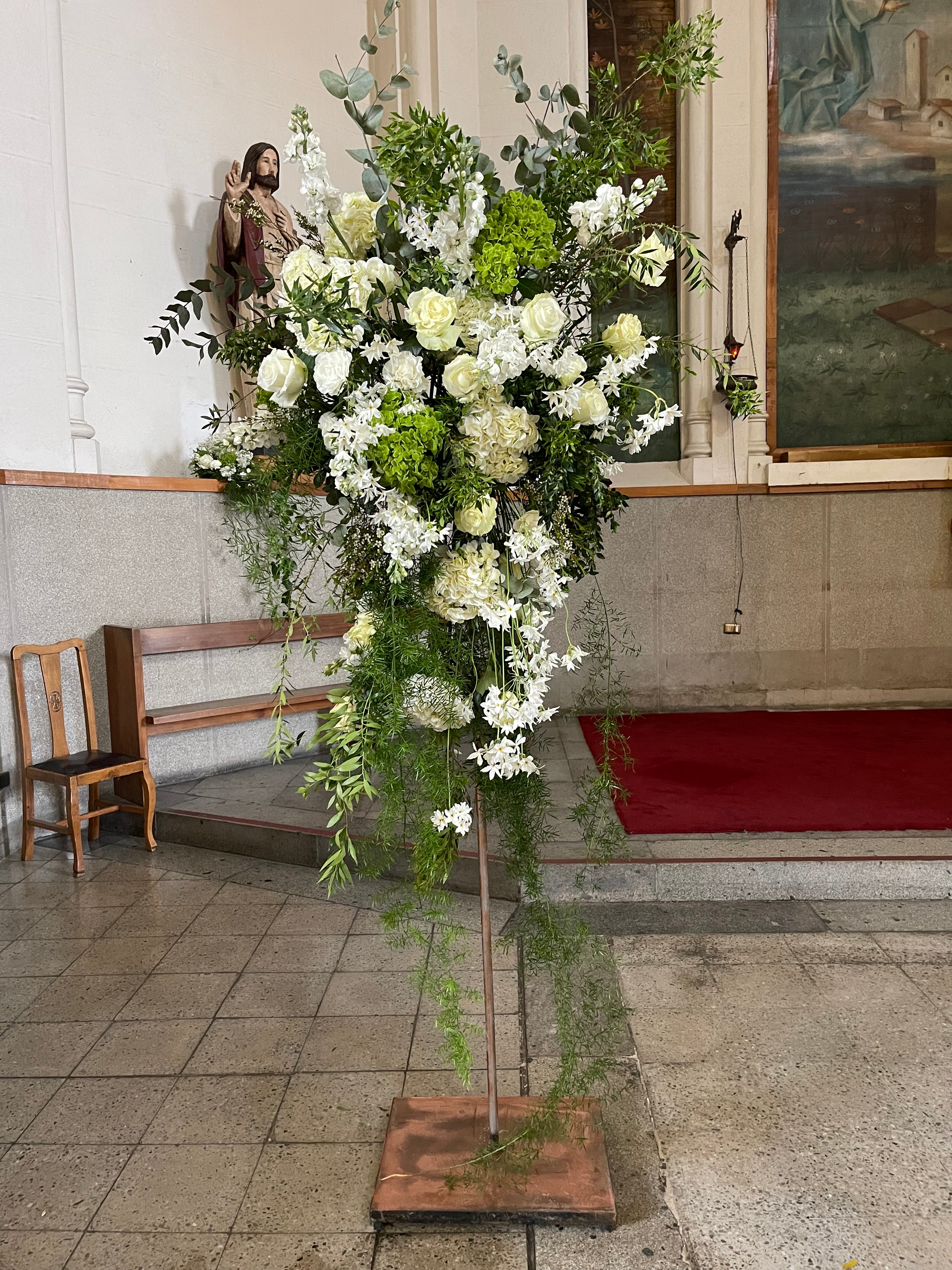 Arreglo alto XL en poste de metal de 180 cm de altura en forma “cascada” para decorar espacio al lado de altar o entrada a la iglesia.