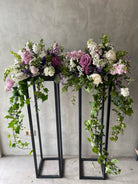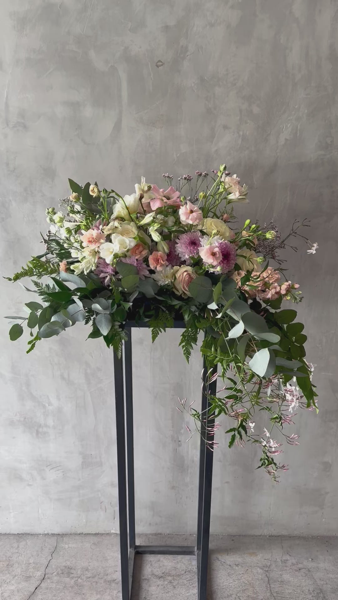 Arreglo de 50 cm de largo y 30 cm de altura. Lleva flores frescas en tonos claros y tiene una linda caída tipo cascada. Un formato ideal para adornar su Matrimonio Civil o Ceremonia Religiosa, entrada a la casa o Iglesia. También ofrecemos en arriendo los plintos metálicos.