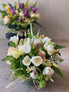 Este arreglo de 10 tulipanes y flores de temporada en una fuente de vidrio es un arreglo bello para cualquier ocasión. Tiene altura de 18-20 cm y ancho de 23-25 cm.