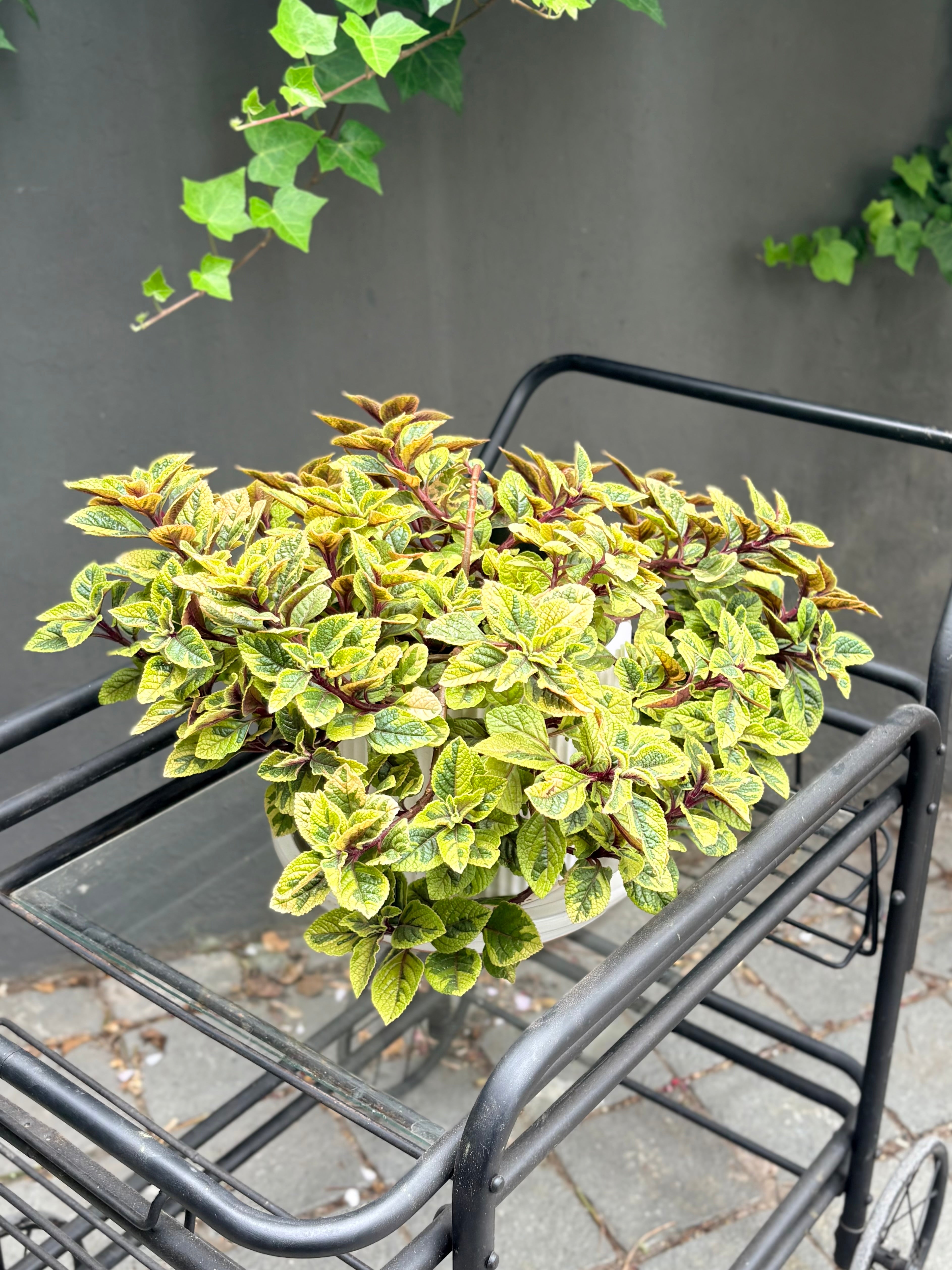 Planta aromática y ornamental de hojas aterciopeladas con tonos verdes y bordes púrpura de 28 cm. De altura. Su aroma fresco la hace muy agradable y distintiva. Se adapta bien al sol directo o semisombra, y con riego moderado (una vez por semana suele ser suficiente) mantiene su follaje frondoso y colorido. Perfecta para macetas, terrazas o para aportar textura a arreglos botánicos.