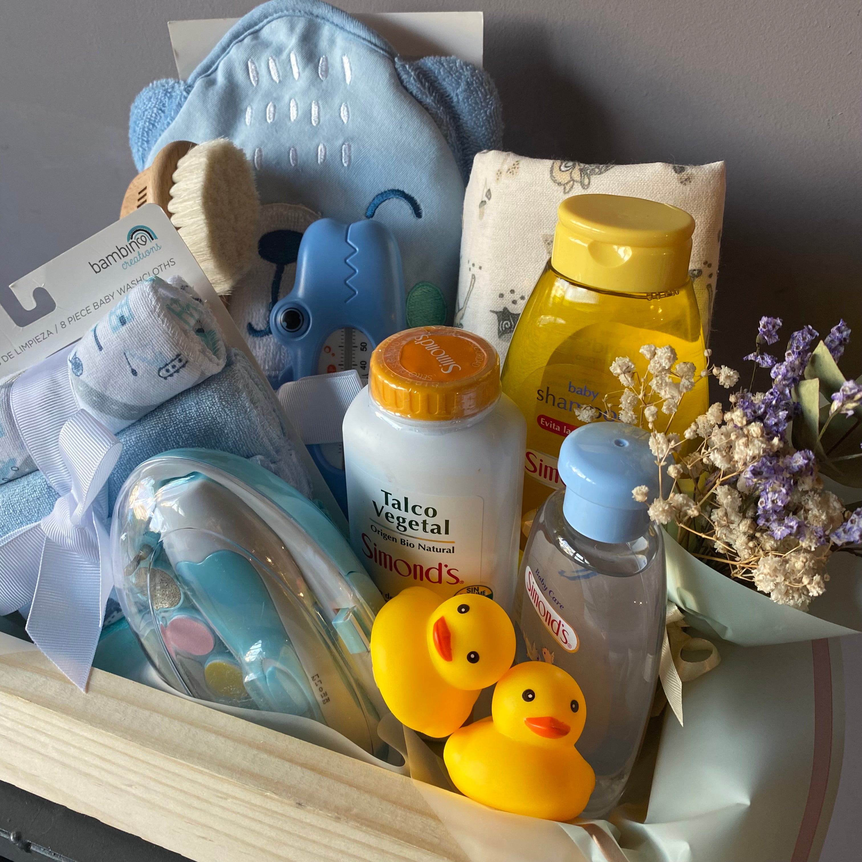 Un lindo conjunto en caja para nacimiento de bebé en tonos celestes / rosados con varios regalitos lindos y útiles para primeros meses de la vida del bebé y para su aseo, como: