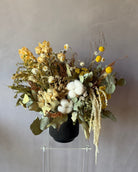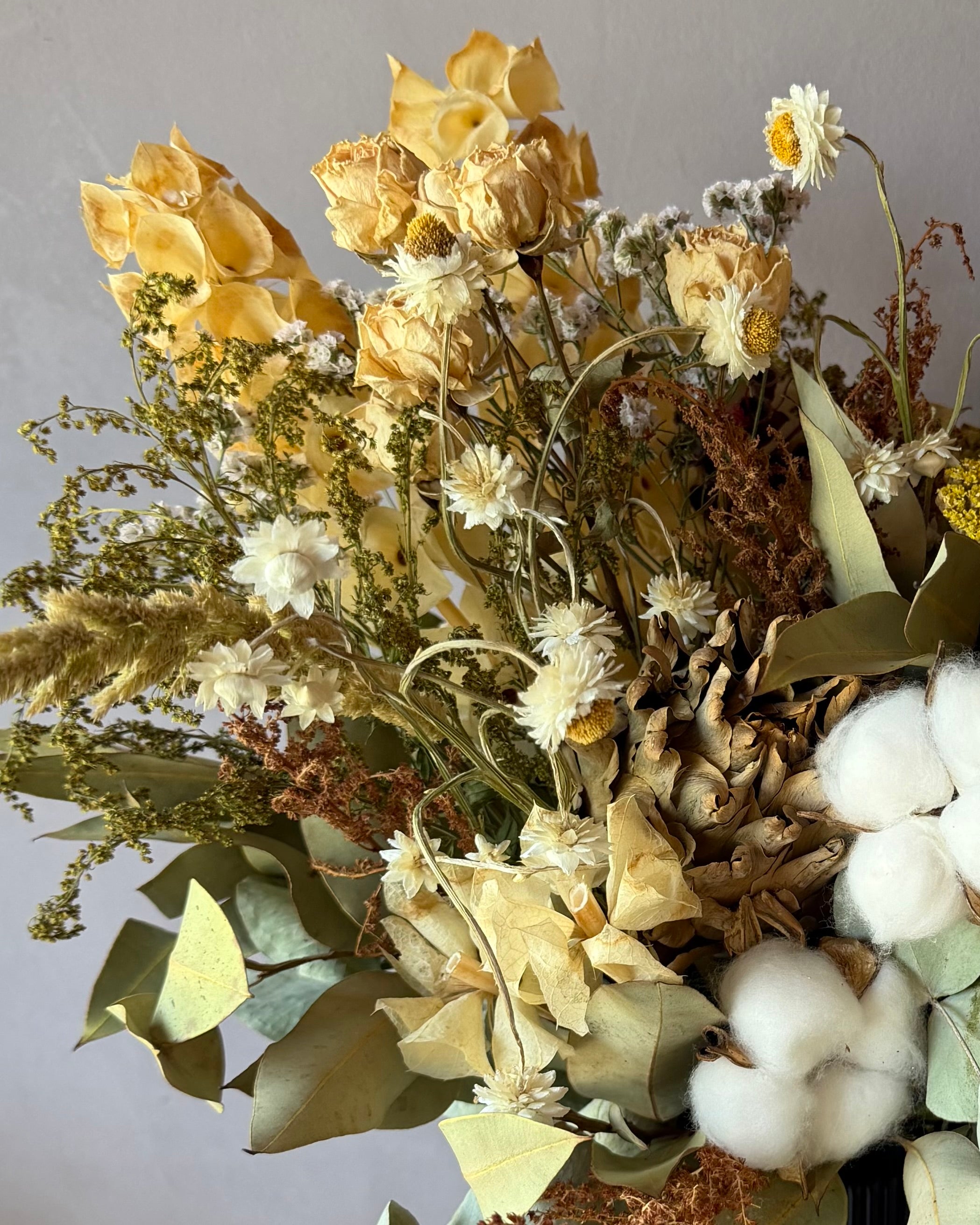 Arreglo de flores secas en tonos naturales, diseñado en una maceta de cerámica que aporta un estilo sobrio y atemporal. Una composición decorativa de larga duración, ideal para dar calidez a cualquier espacio sin necesidad de mantenimiento. Perfecto como regalo o como detalle decorativo para el hogar u oficina.