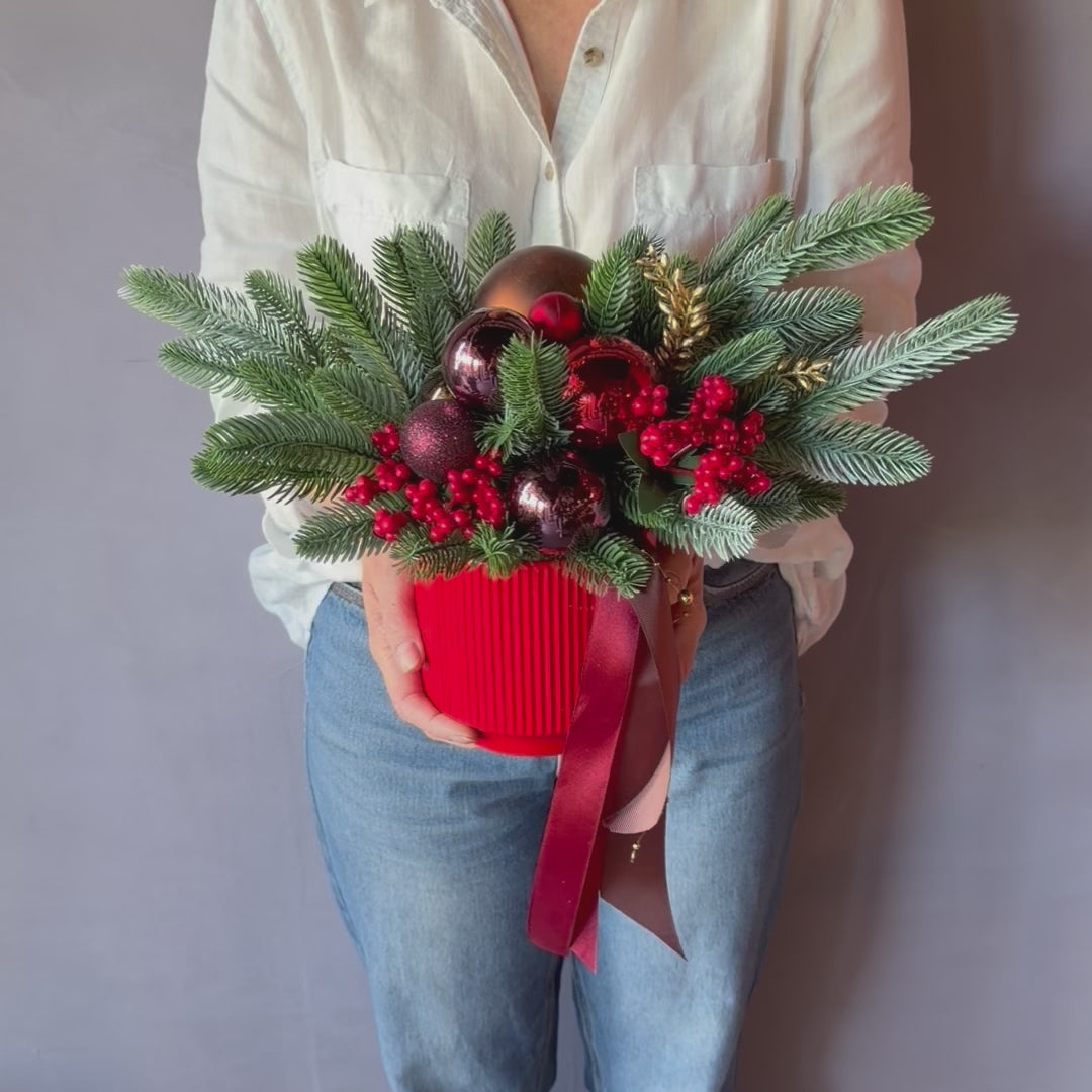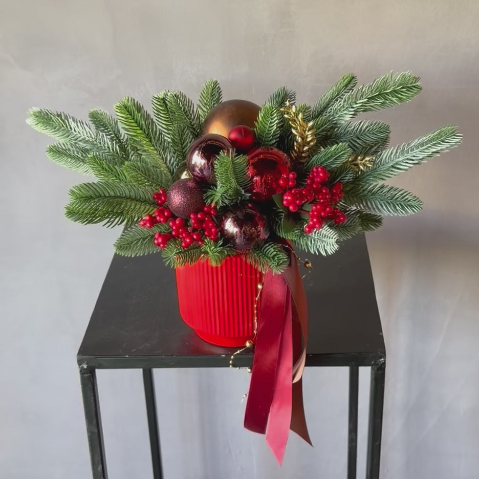 Este hermoso arreglo navideño en maceta de cerámica roja es el regalo perfecto para esta temporada. Hecho con pino artificial de alta calidad, puede ser disfrutado por varios años, agregando alegría y maravilla a cualquier hogar. Impresiona a tus seres queridos con este regalo dulce, duradero y encantador. Altura aproximada 22 cm y ancho 25 cm