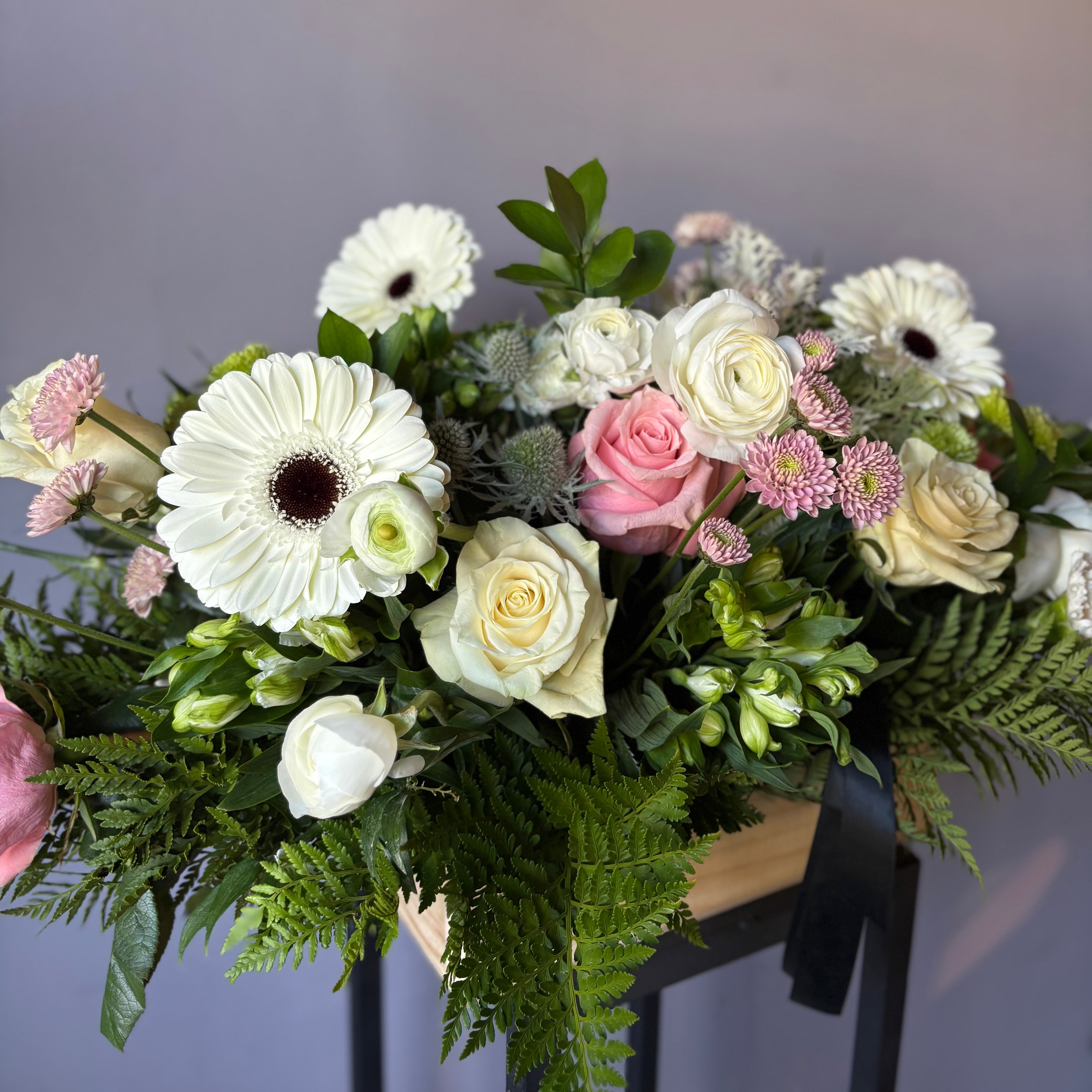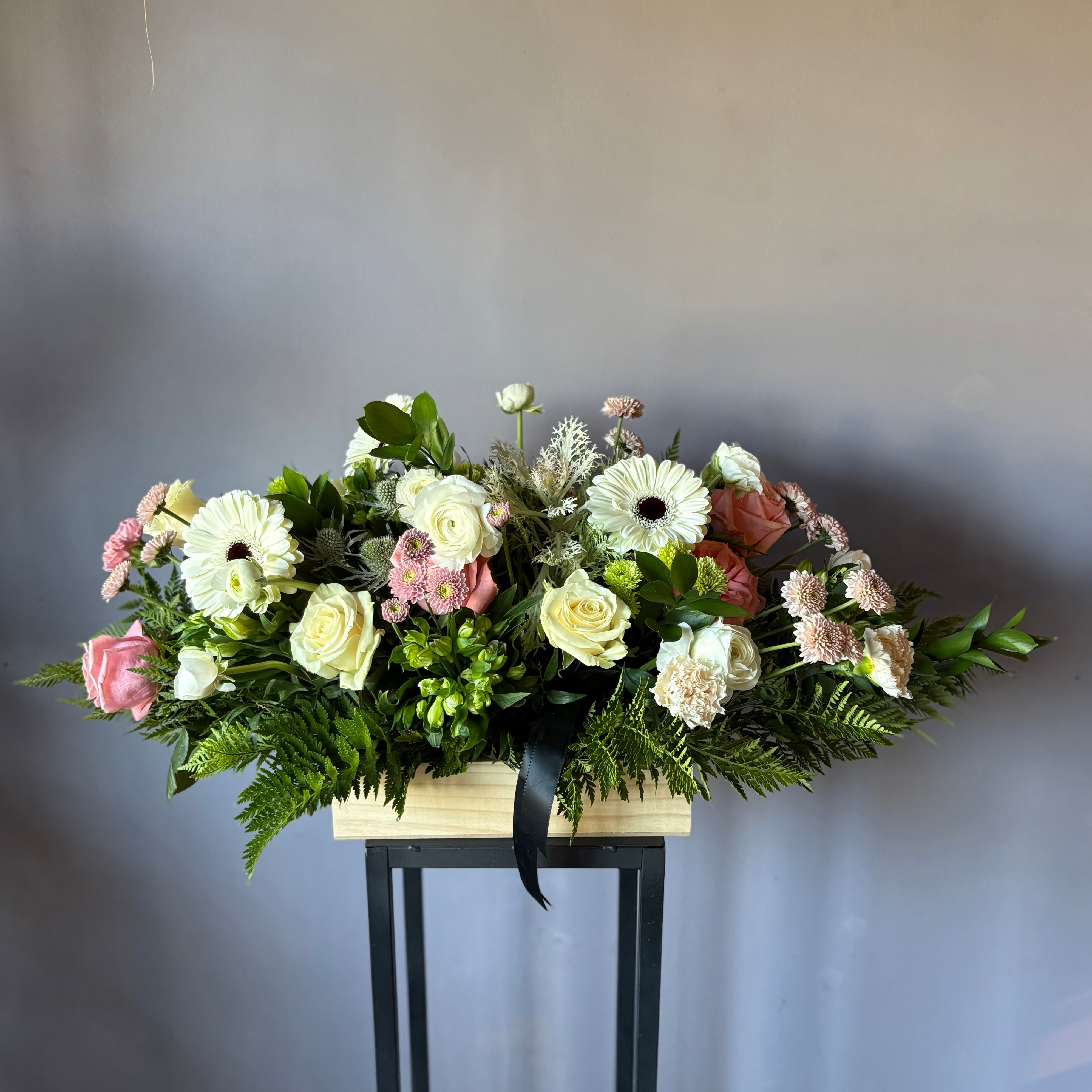 Caja de Condolencias de madera XL con flores surtidas blancas, tonos pasteles y gerberas de 70 cm de largo aproximadamente. Es una excelente opción entre las flores fúnebres, arreglos de condolencias y flores para cementerio. Este hermoso detalle no solo embellece el entorno, sino que también transmite amor y apoyo en momentos difíciles. En tiempos de duelo, este Arreglo de Condolencias es más que una simple decoración; es una muestra de cariño que honra la memoria de quienes ya no están físicamente con nosotros.