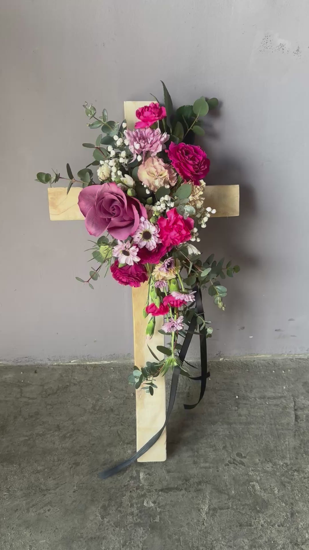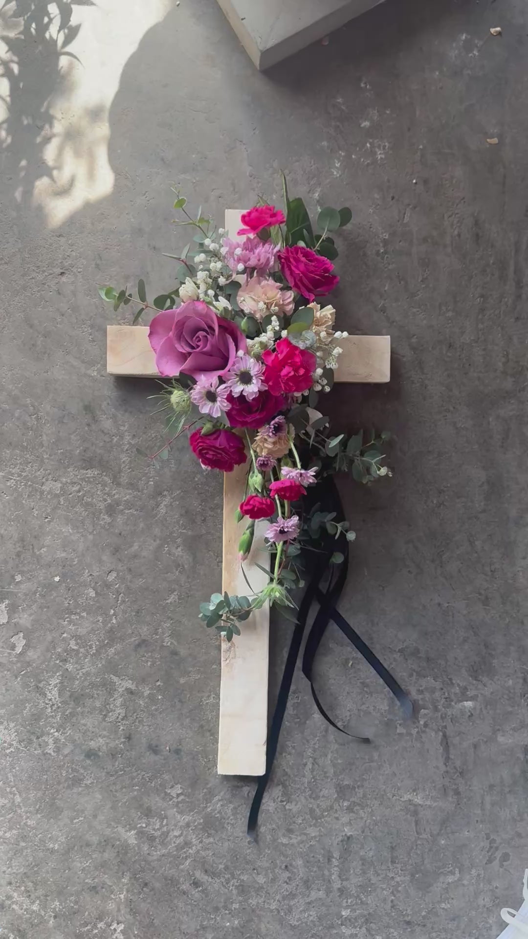 Esta hermosa cruz con arreglo floral es una expresión de amor y condolencias perfecta para un funeral. Sus flores frescas combinadas con la calidez de su cruz de madera, crean un homenaje apropiado y cariñoso para el ser querido fallecido. La mezcla de colores y texturas es una manera amorosa de recordarles. Largo de la Cruz es 60 cm y ancho 40 cm.