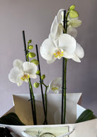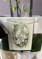 Una hermosa orquídea phalaenopsis blanca, presentada en elegante bolsa de regalo con detalles sobrios y delicados. Su color blanco simboliza paz, luz y recuerdo, convirtiéndola en un gesto respetuoso y significativo para acompañar momentos de despedida o expresar condolencias.