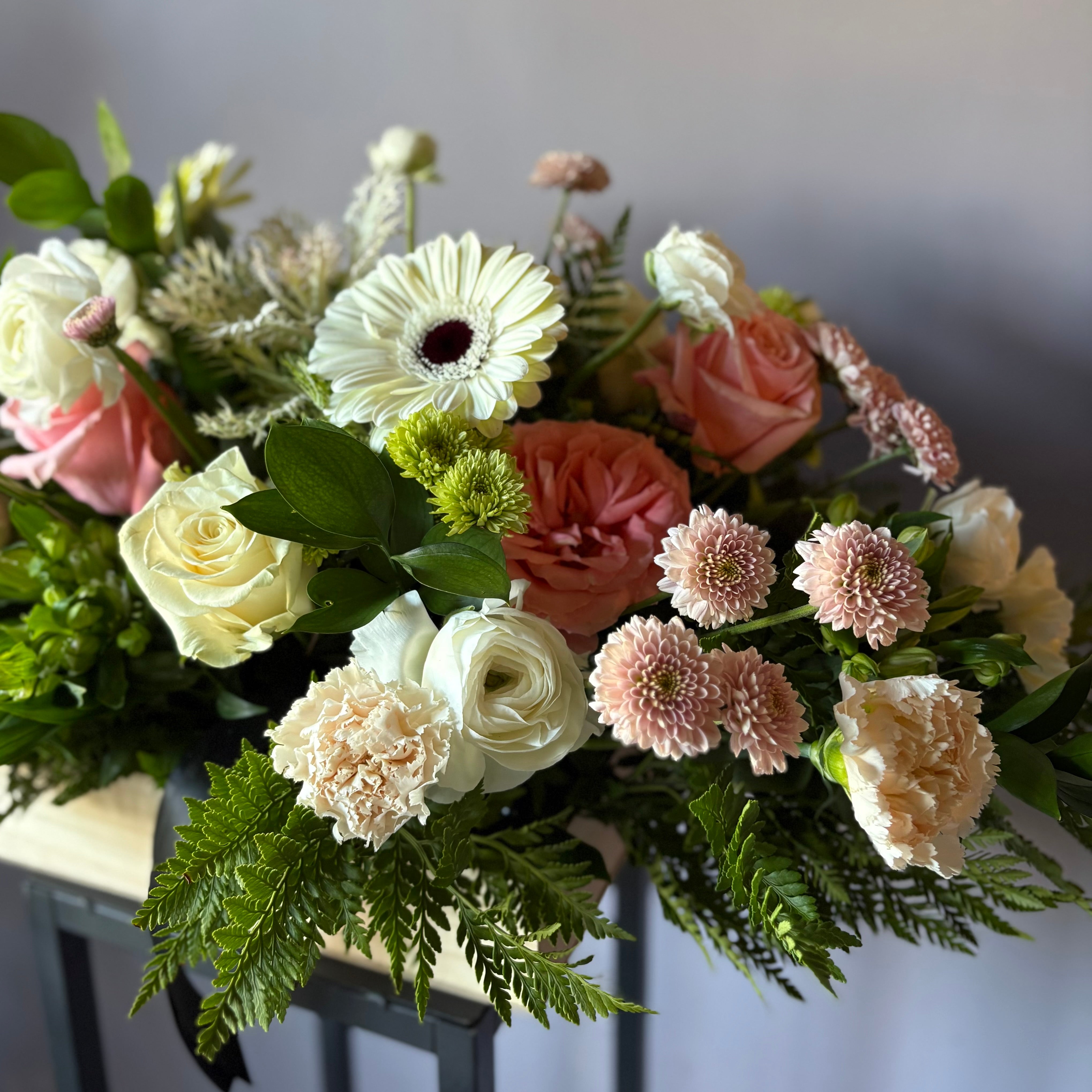 Arreglo de condolencias asimetríco con rosas blancas