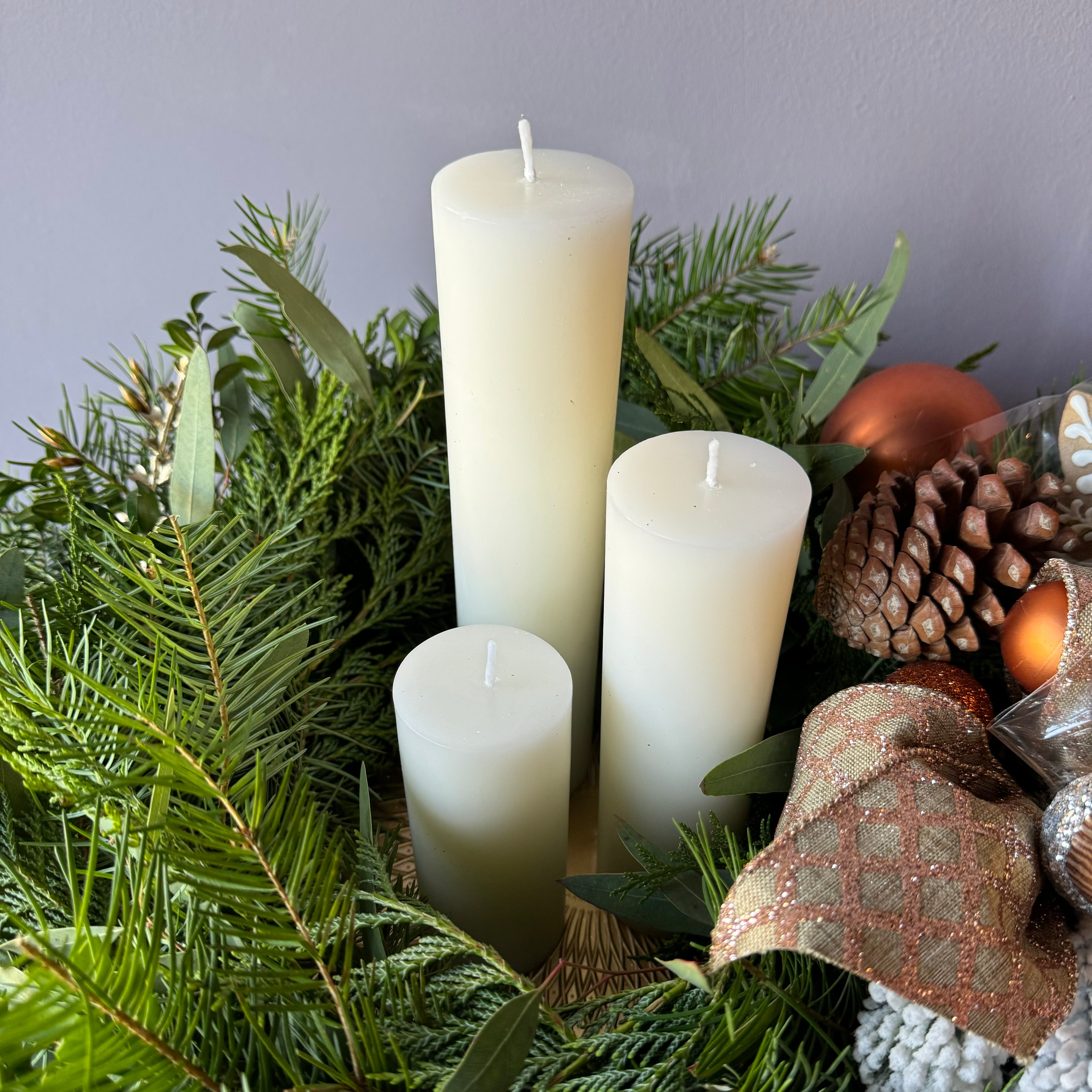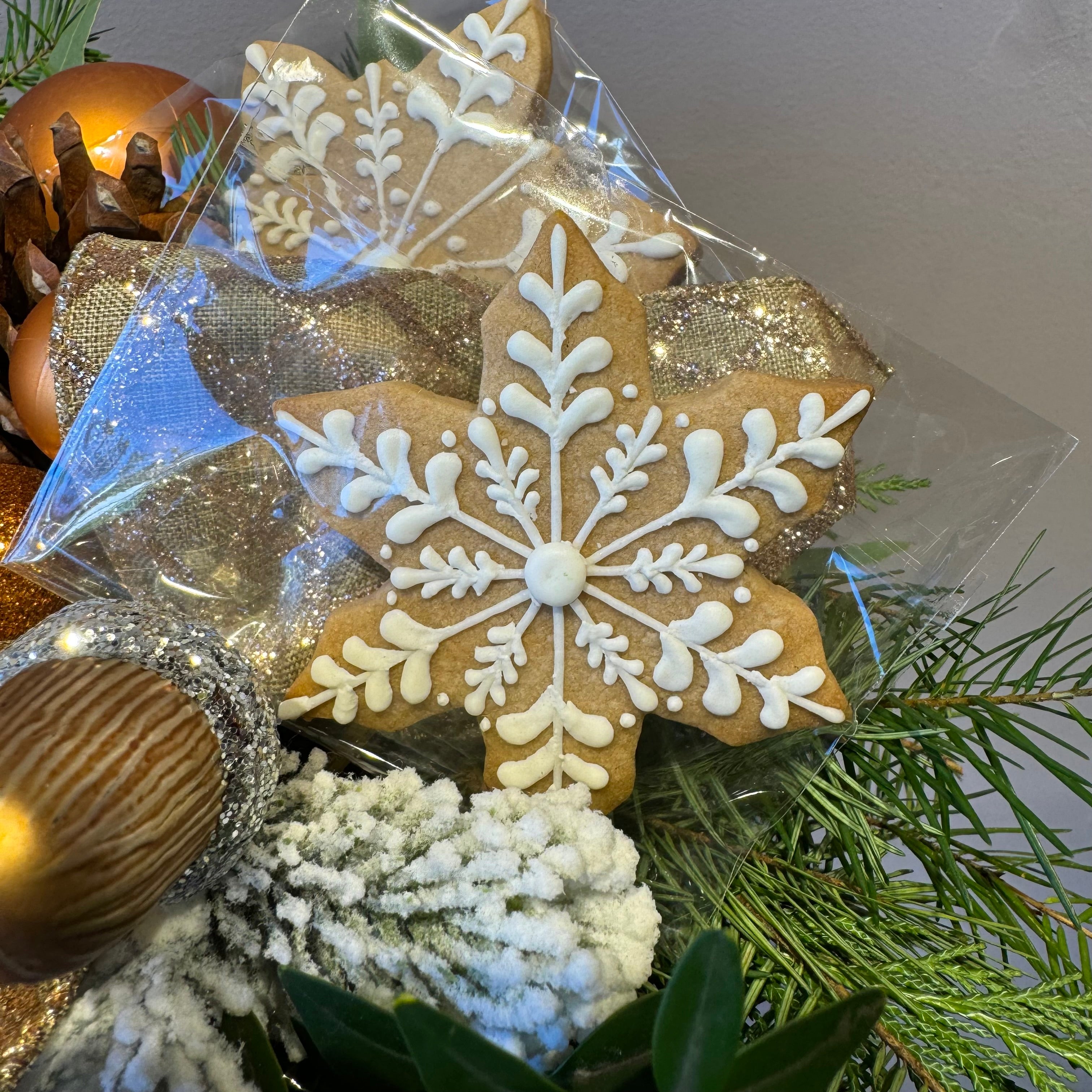 Centro de mesa en forma de corona de pino y otro follaje con adorno navideño, 2 galletas con diseño y 3 velas. Diámetro 40 cm. Viene envuelto en papel transparente.