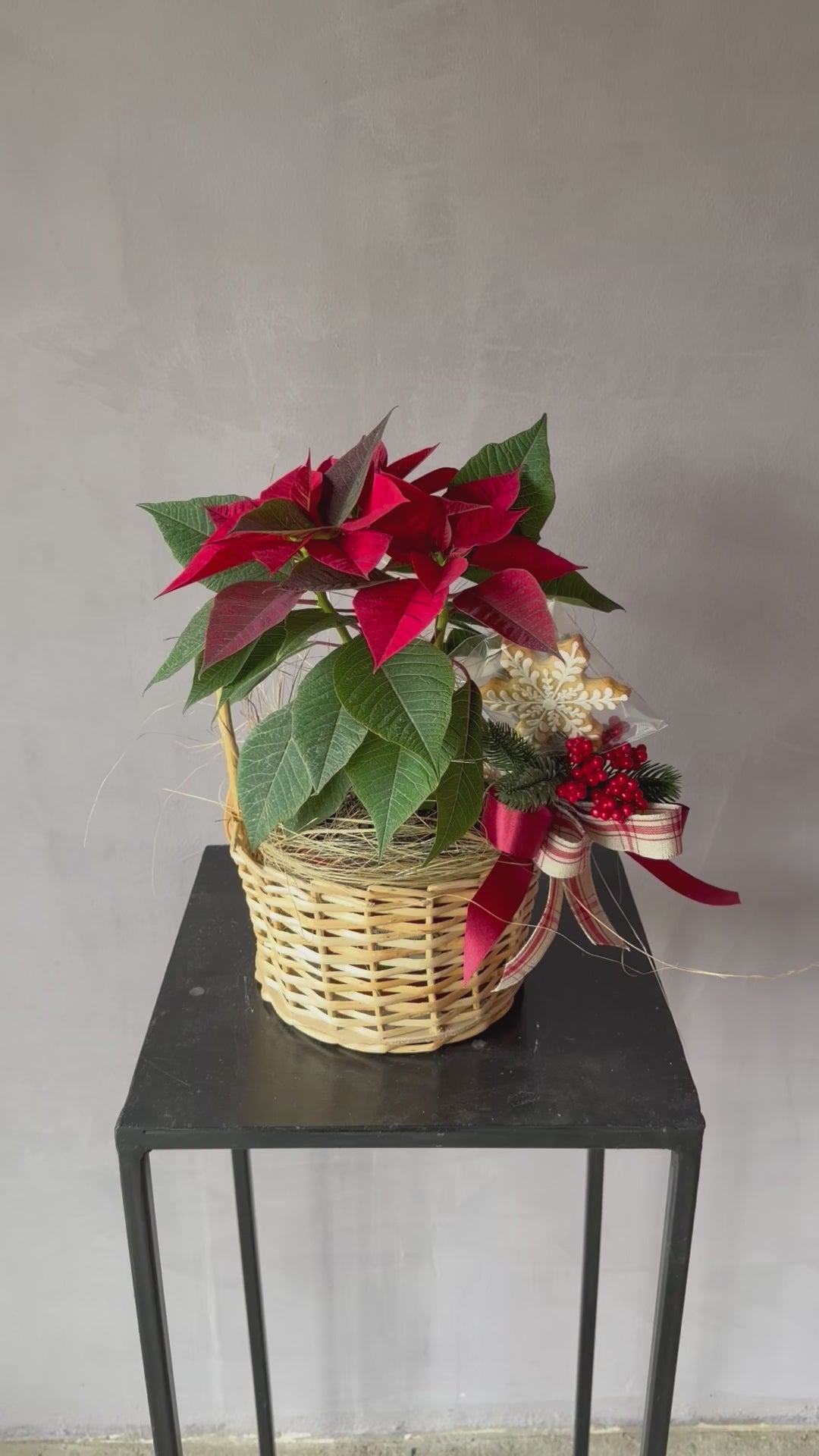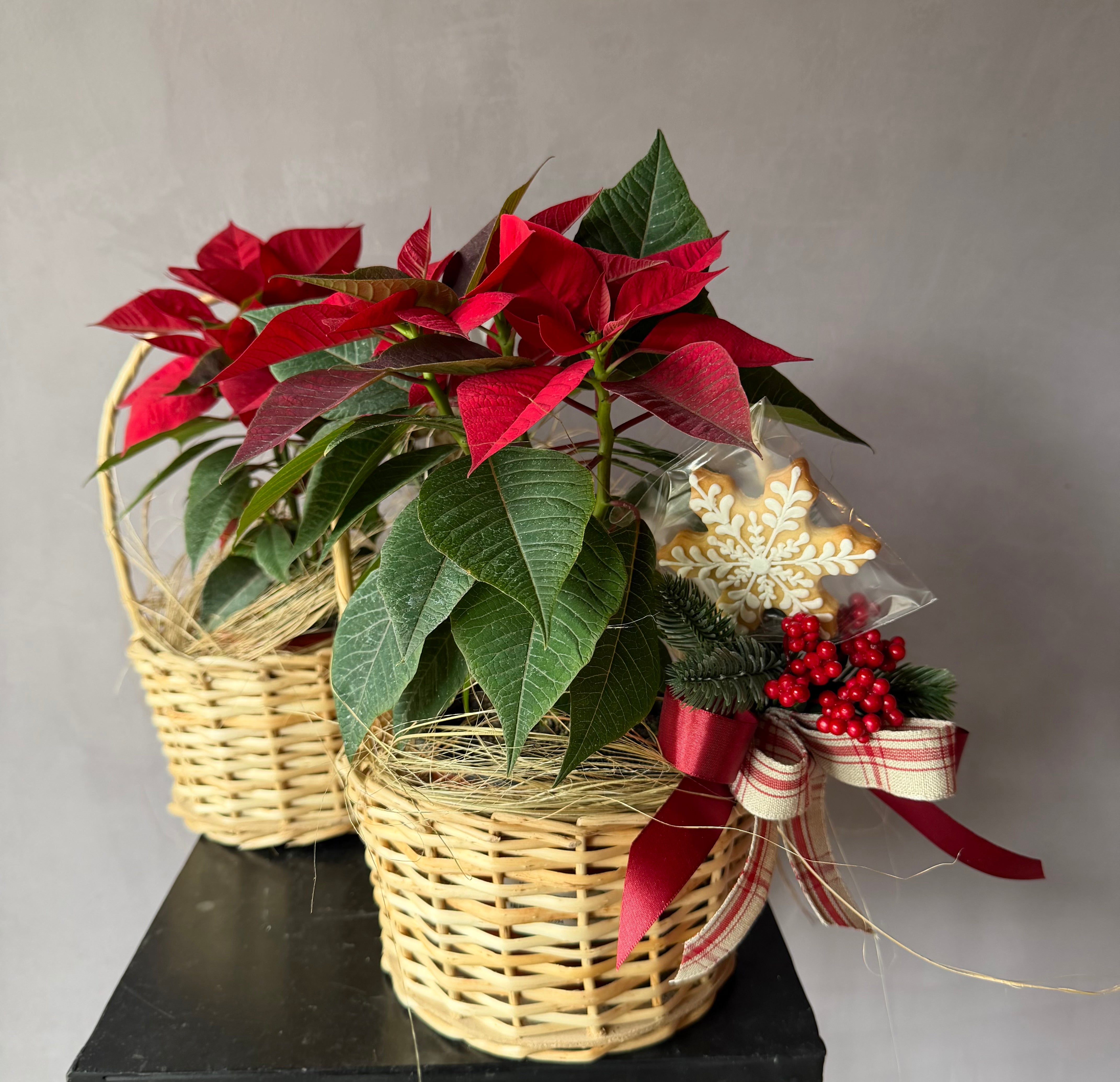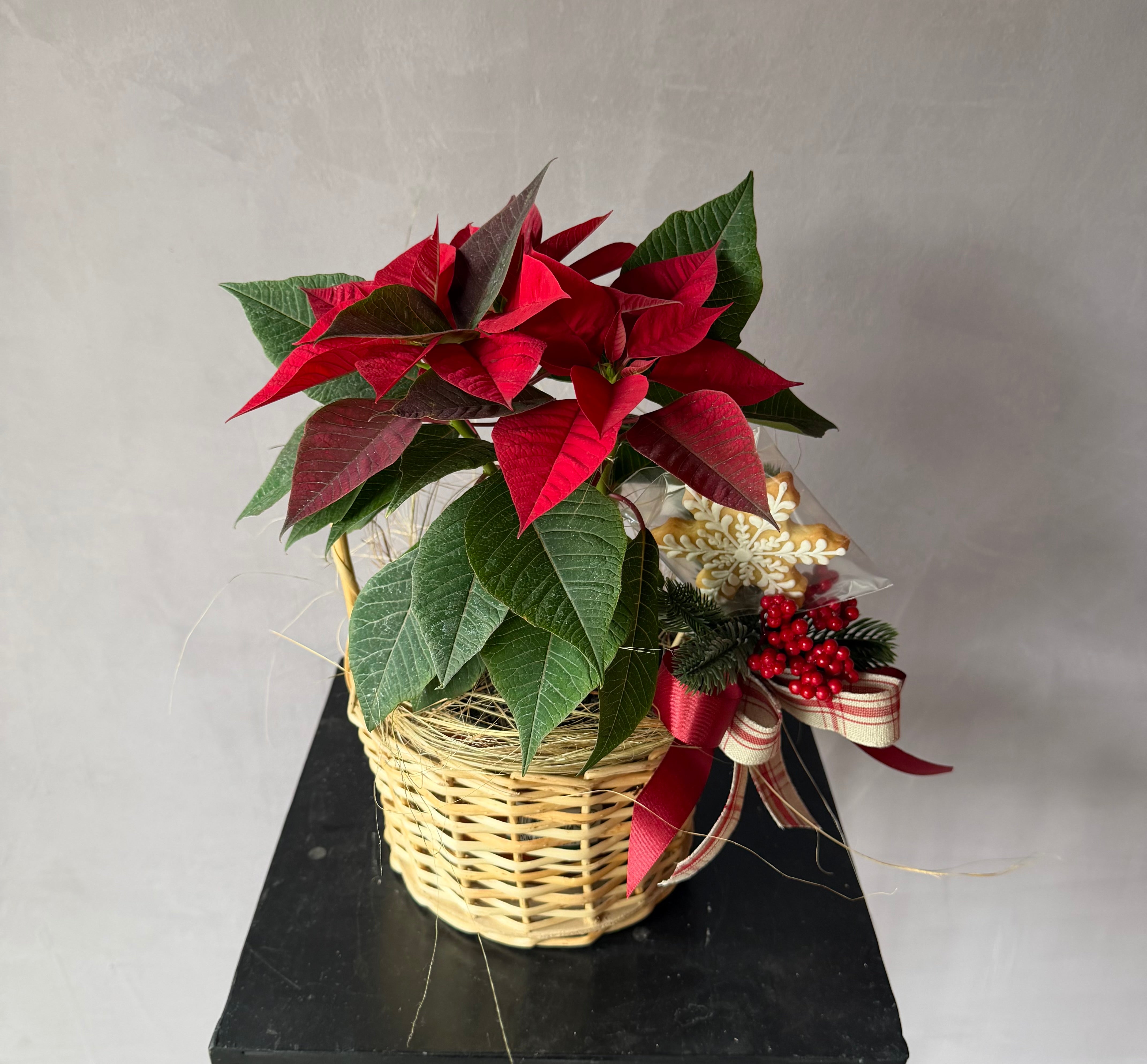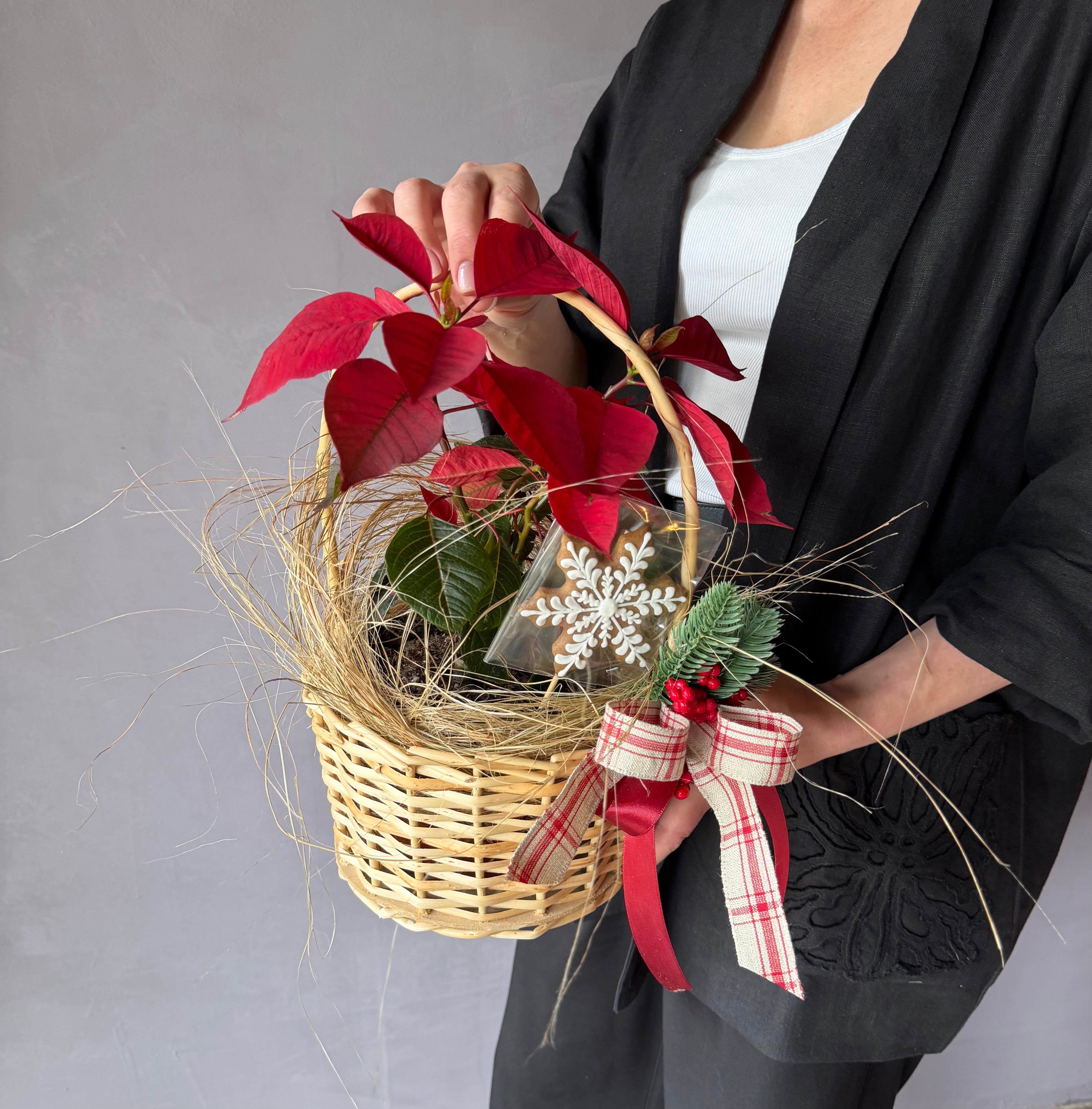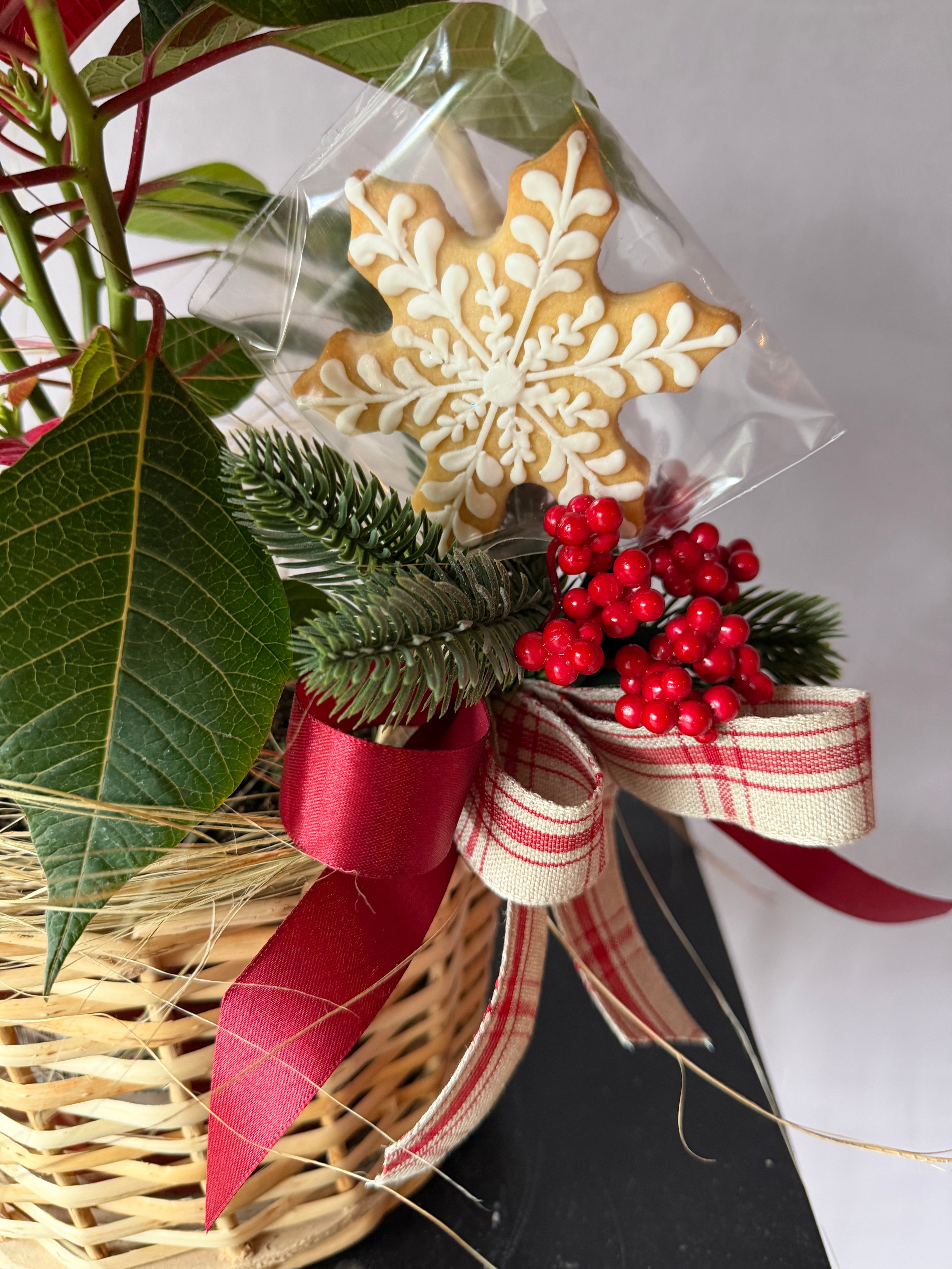 Descubre esta hermosa planta de poinsettia, cuidadosamente colocada en una canasta con un arreglo pequeño tradicional en colores rojos y verdes. Además, una galleta navideña pintada a mano para completar el regalo perfecto para esta navidad. Sorprende a tus seres queridos con este detalle único y festivo.
