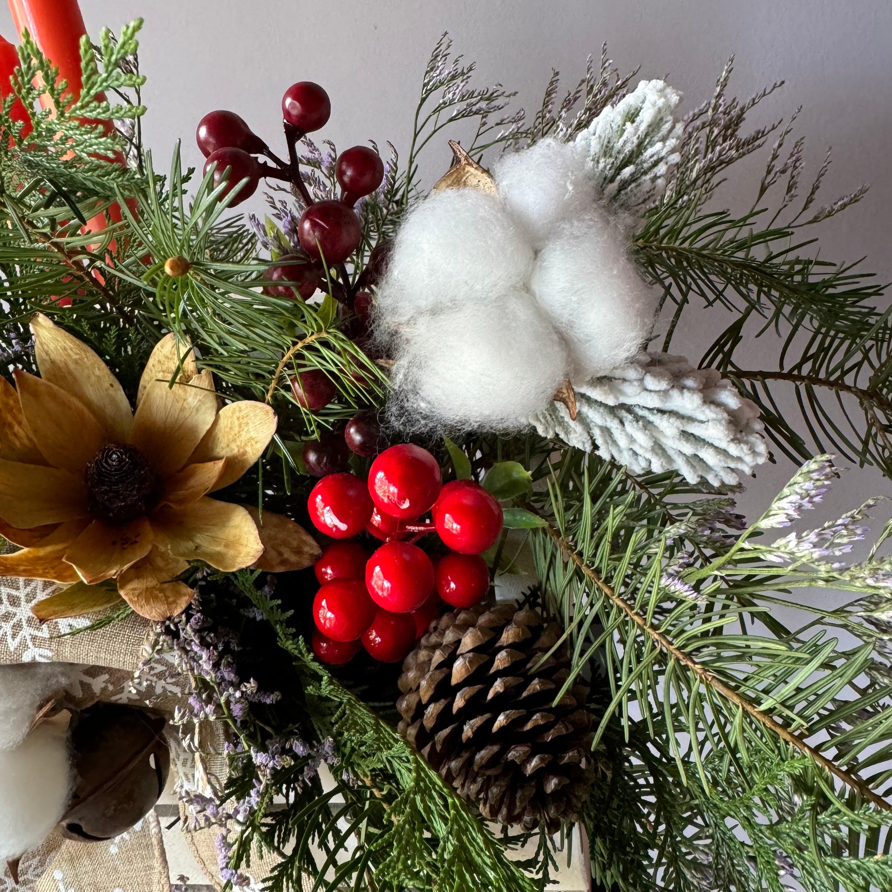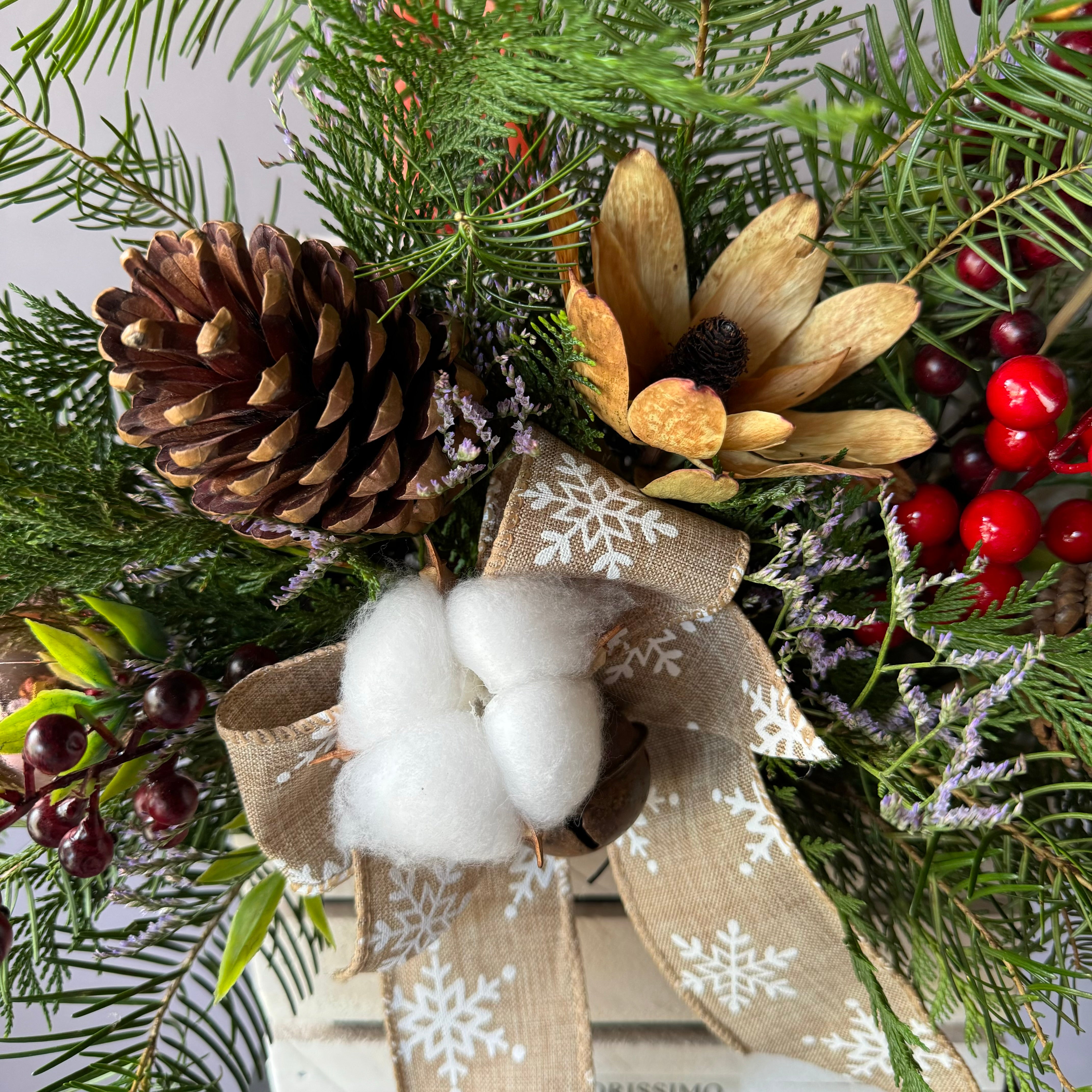 Regala un espíritu navideño con esta caja mediana de madera con ramas de pino natural, velas y adornos.