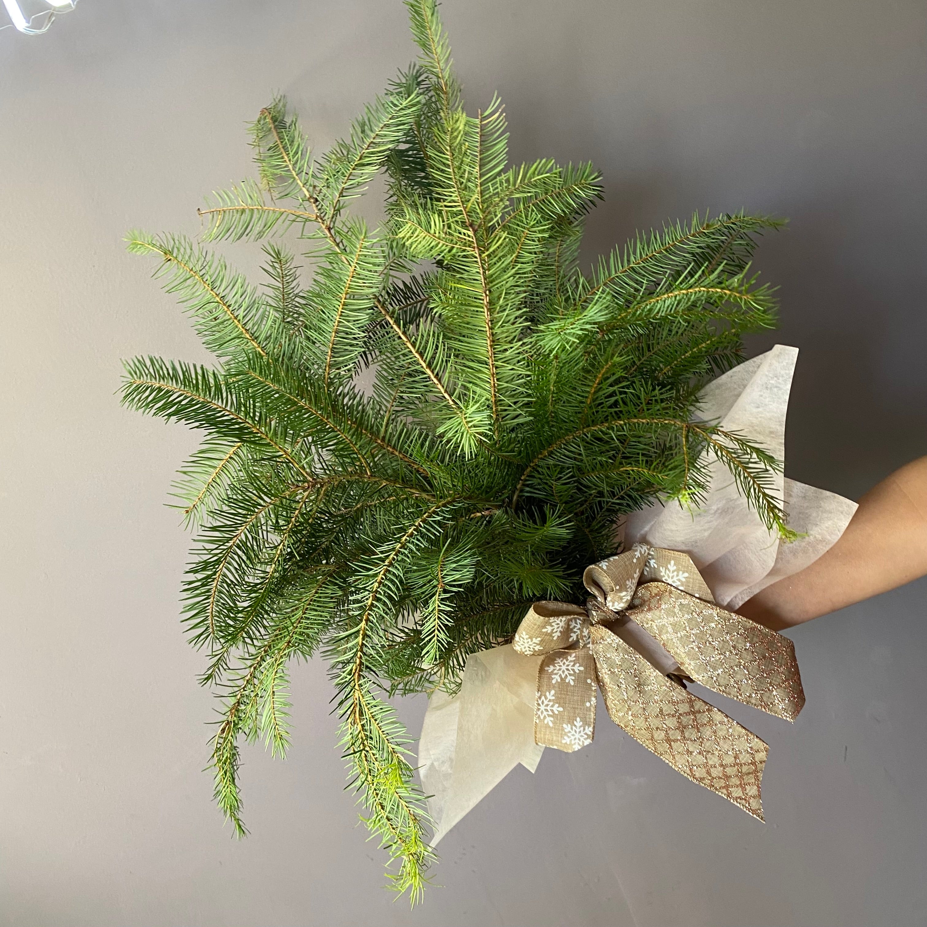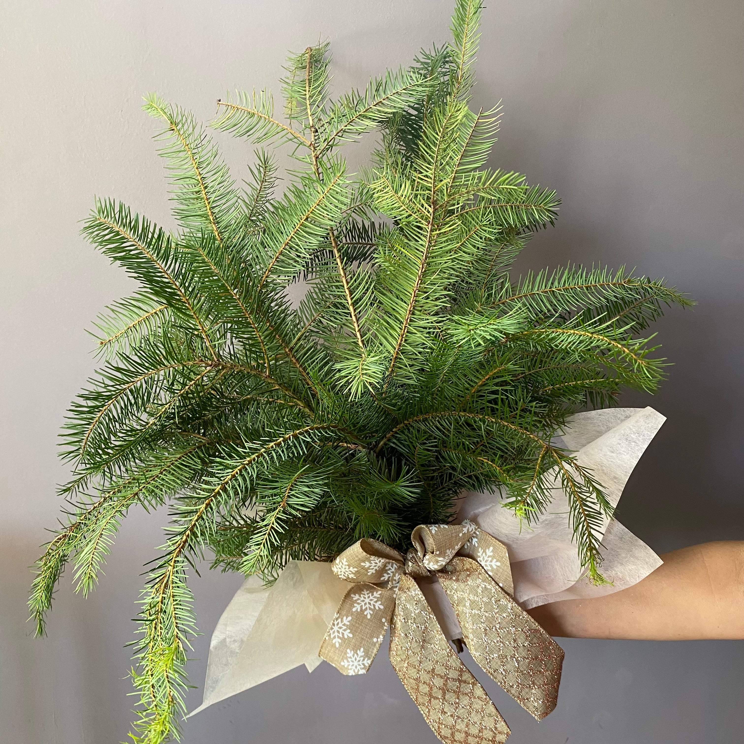 Ramo de pino natural para adornar su mesa estas fiestas navideñas o para enviar de regalo a tu ser querido. Envuelto papel ademas de una cinta.