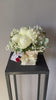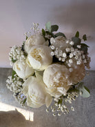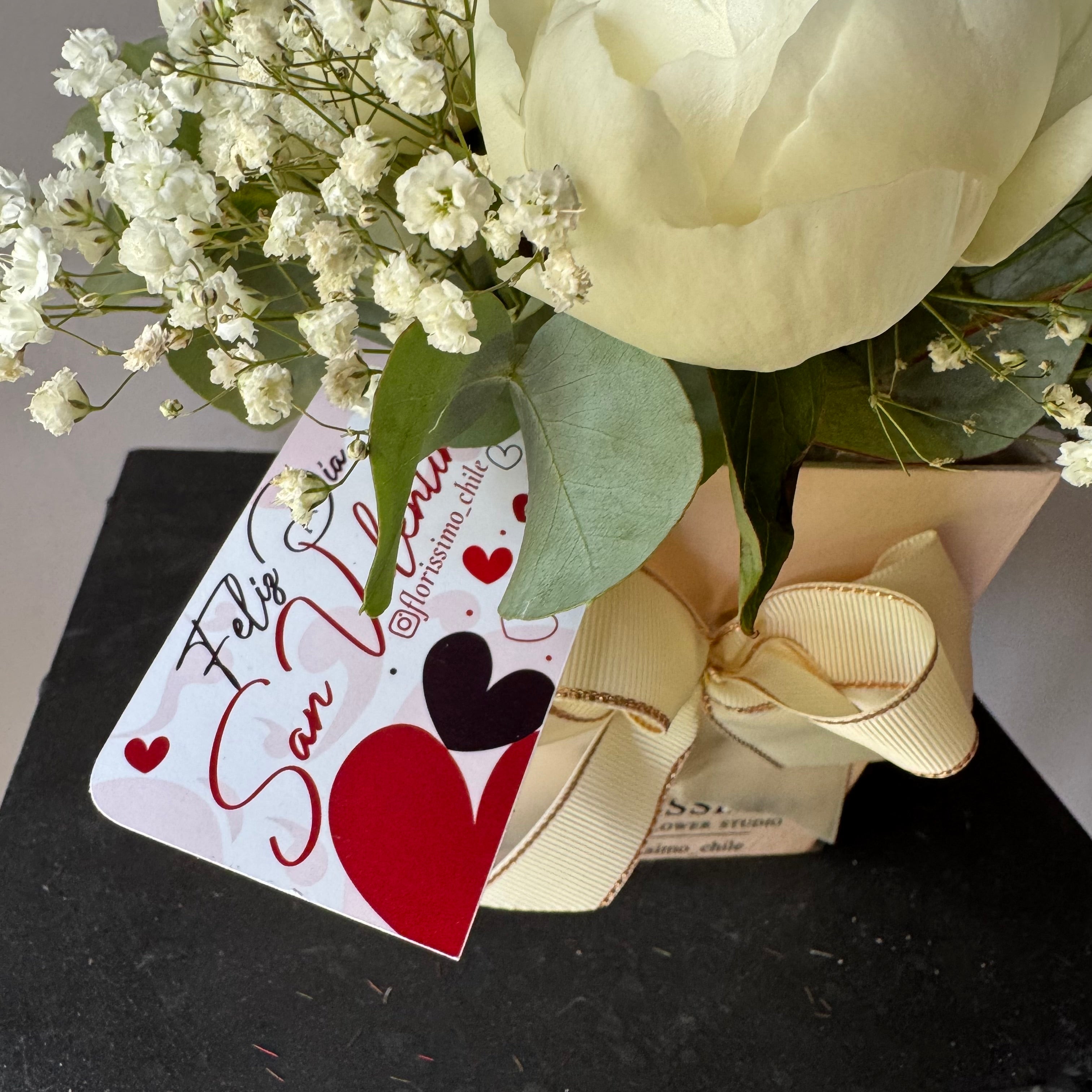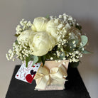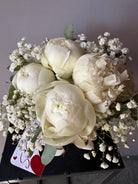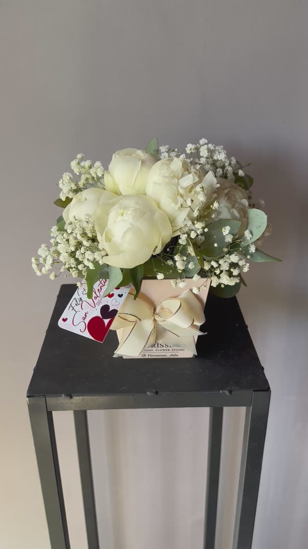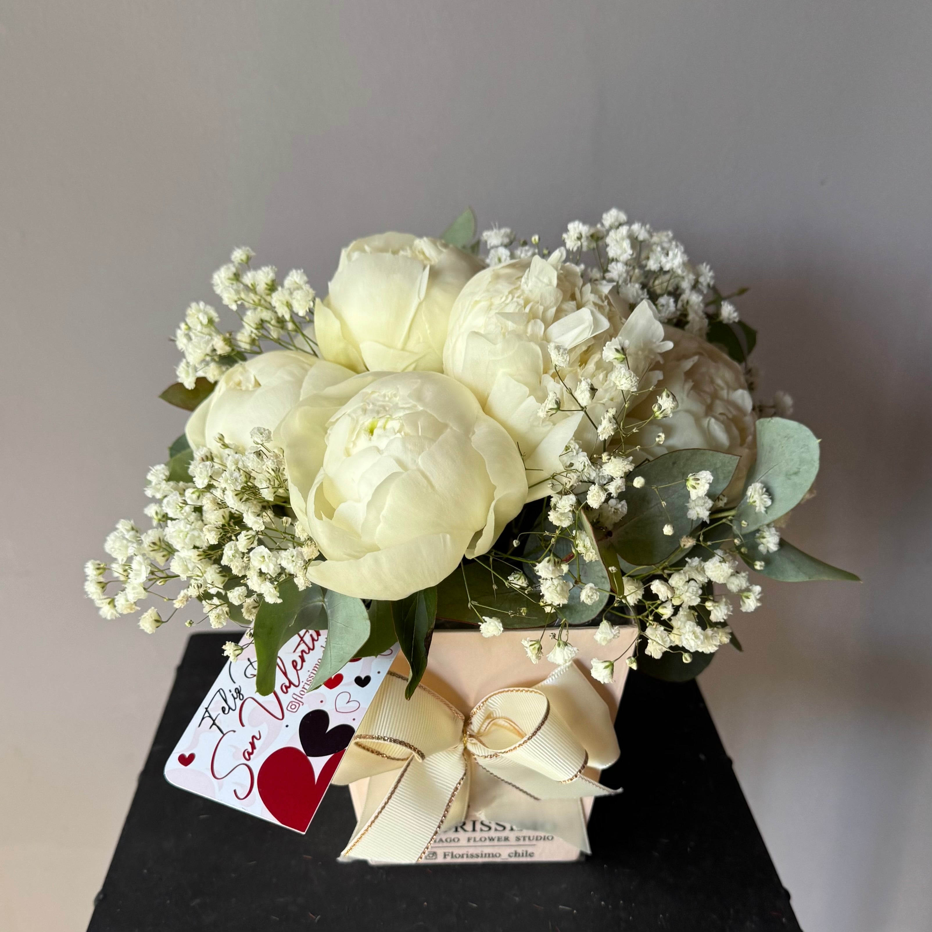 Una elegante caja floral con siete peonías blancas acompañadas de gypsophila y follaje verde, dispuestas en un delicado diseño que transmite pureza y romanticismo. Ideal para regalar amor, gratitud o celebrar momentos especiales con un toque de elegancia natural.
