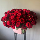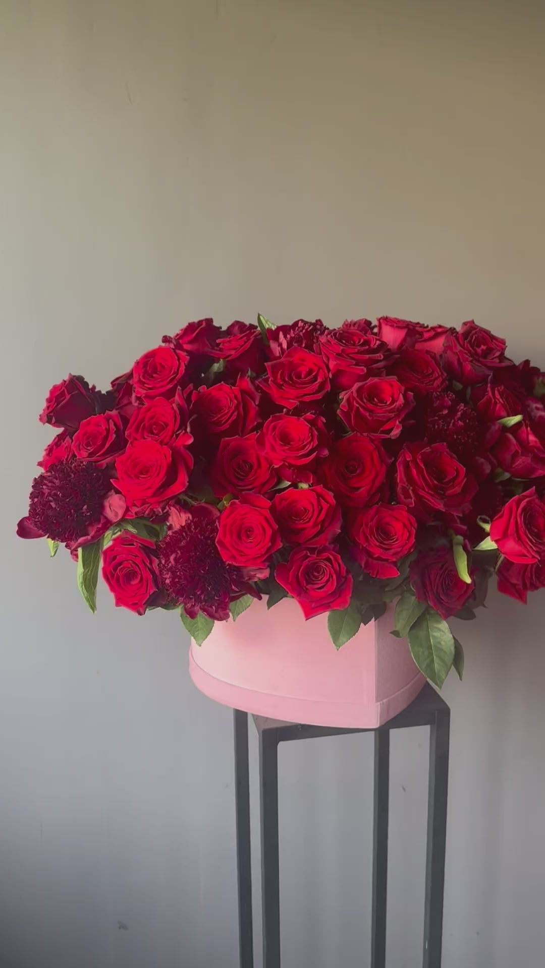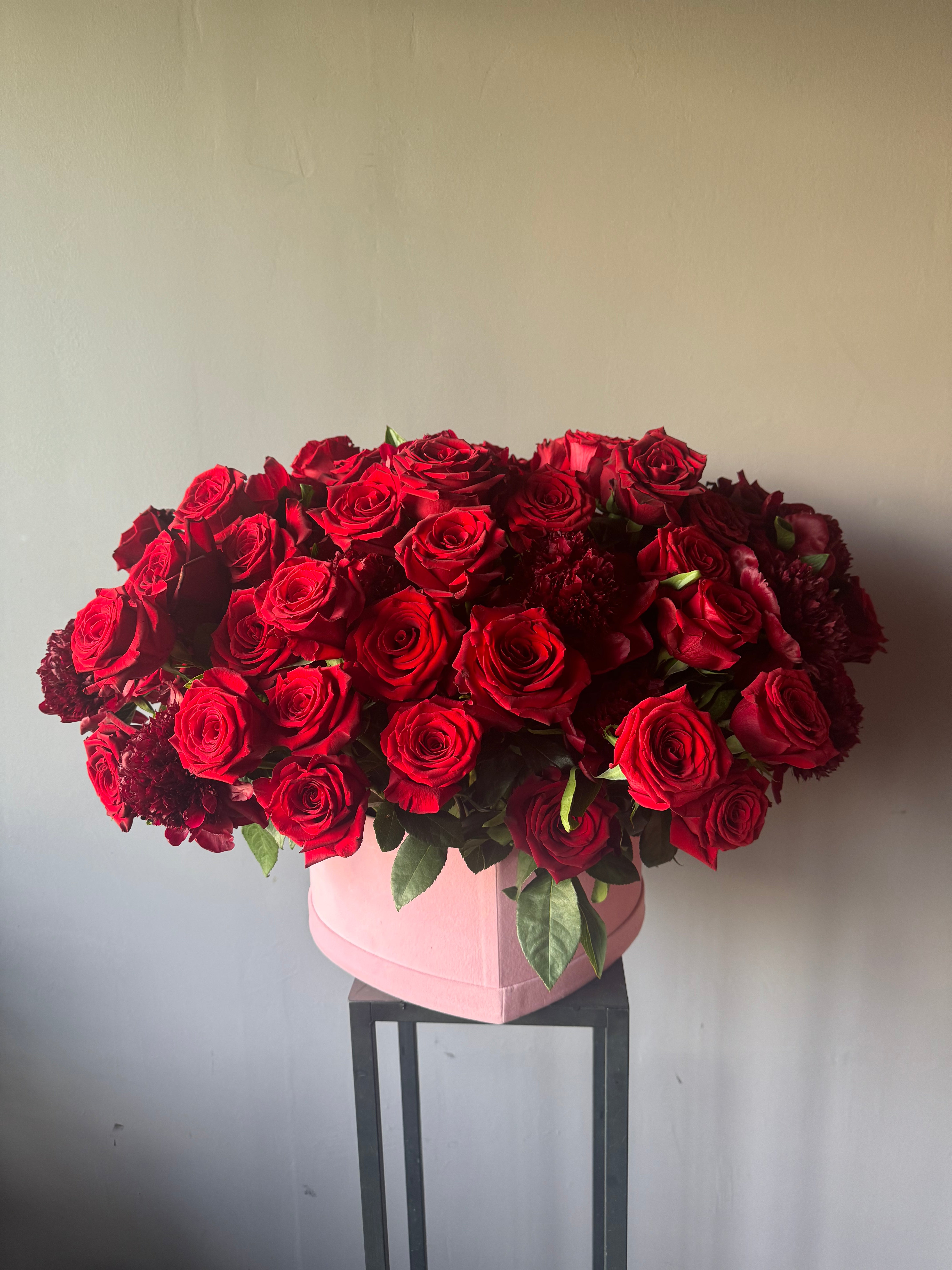 Un arreglo lujoso en caja de forma corazón de terciopelo rosado. Cuenta con 60 rosas rojas y 25 peonias rojas. Tamaño XL, altura 60 cm, ancho 75-80 cm.