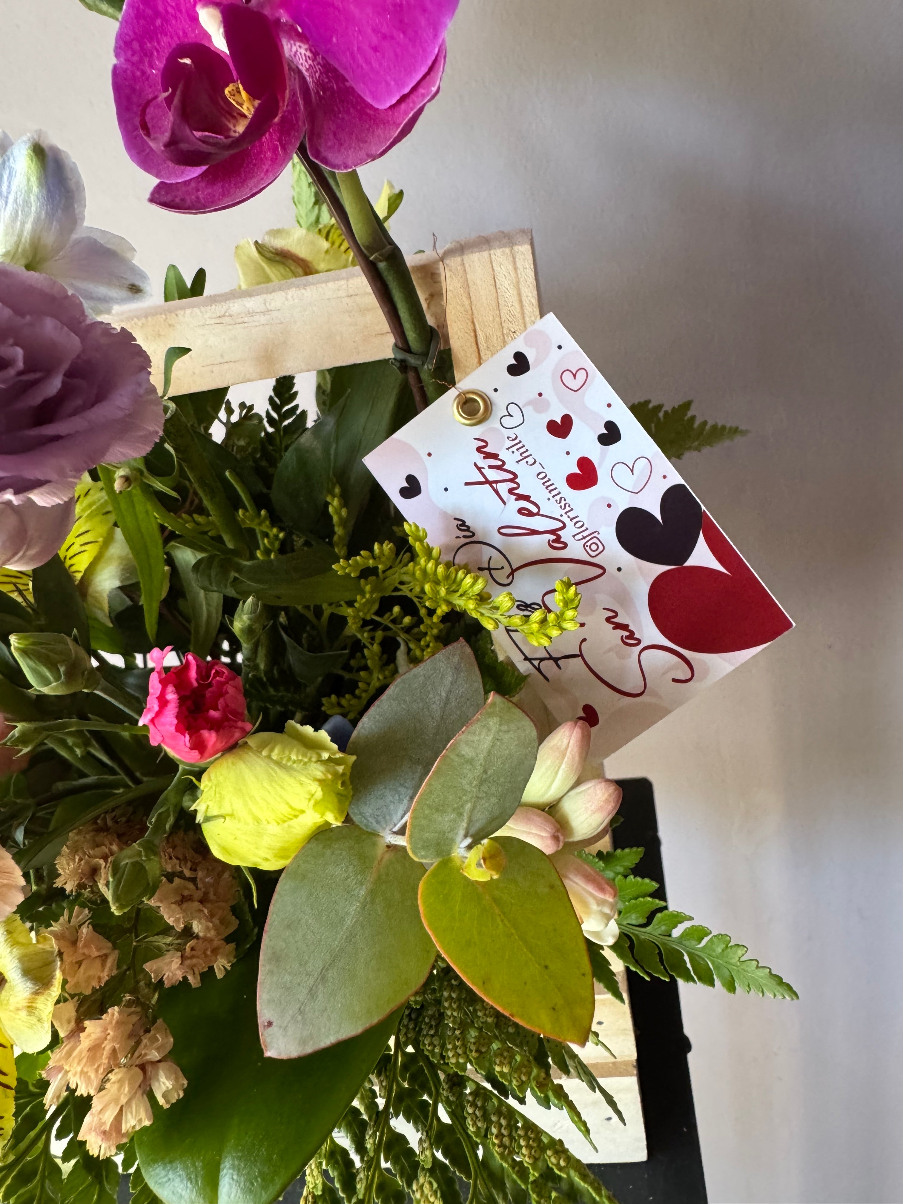 Esta hermosa jardinera contiene una planta de orquídea que durará siempre con cuidado adecuado. Además, su diseño novedoso y las flores frescas que la acompañan son perfectas para sorprender a tu pareja o expresar y declarar tu amor en este San Valentín. ¡Haz de este regalo algo especial y novedoso!