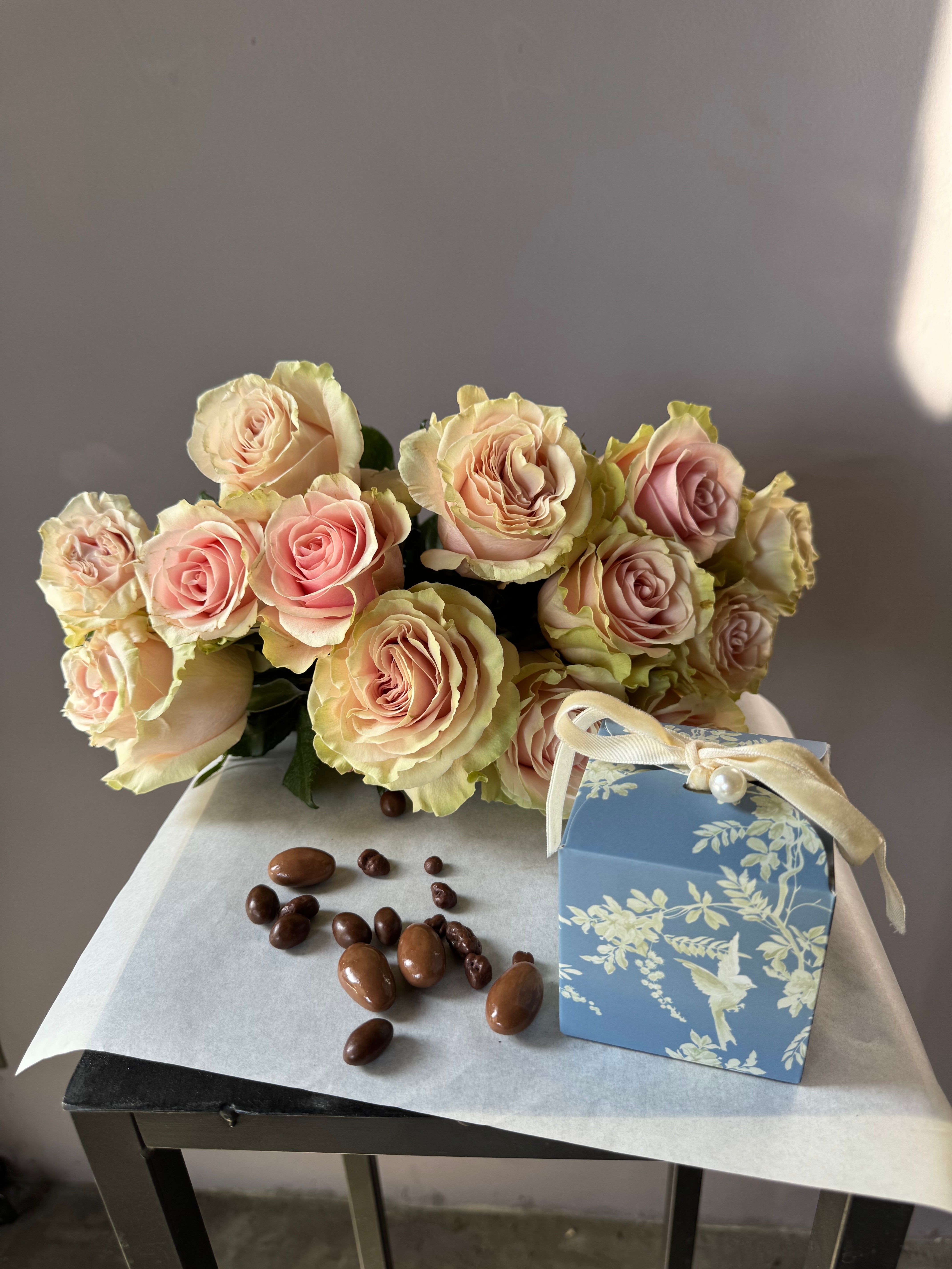 Un pack de oferta! Un ramo clásico y elegante de 12 rosas rosadas ecuatorianas amarrado con una cinta roja y cajita de almendras y pasas bañadas en chocolate de leche.