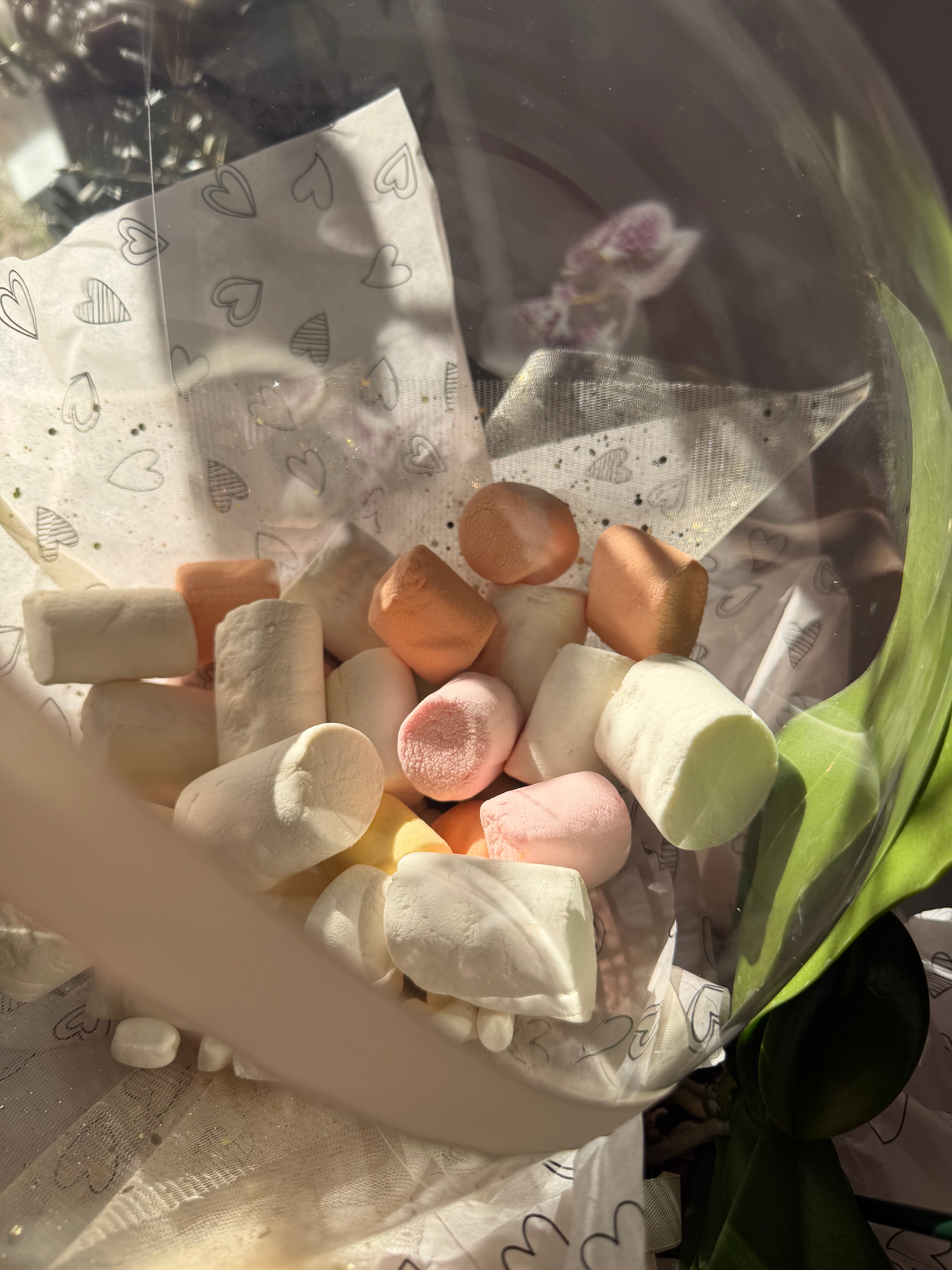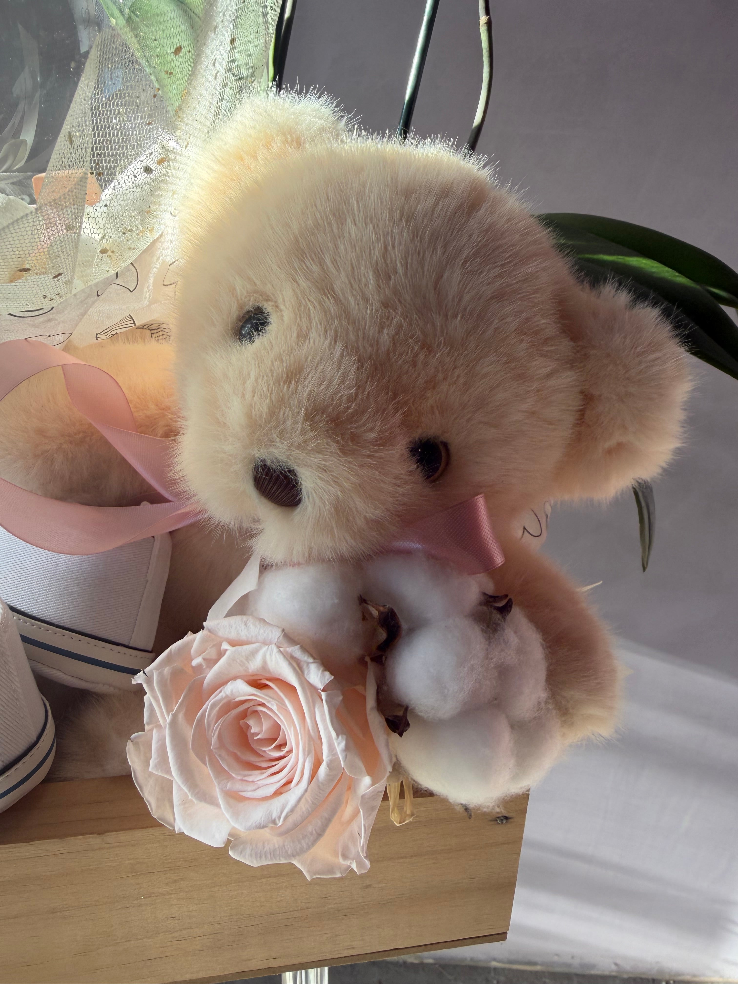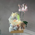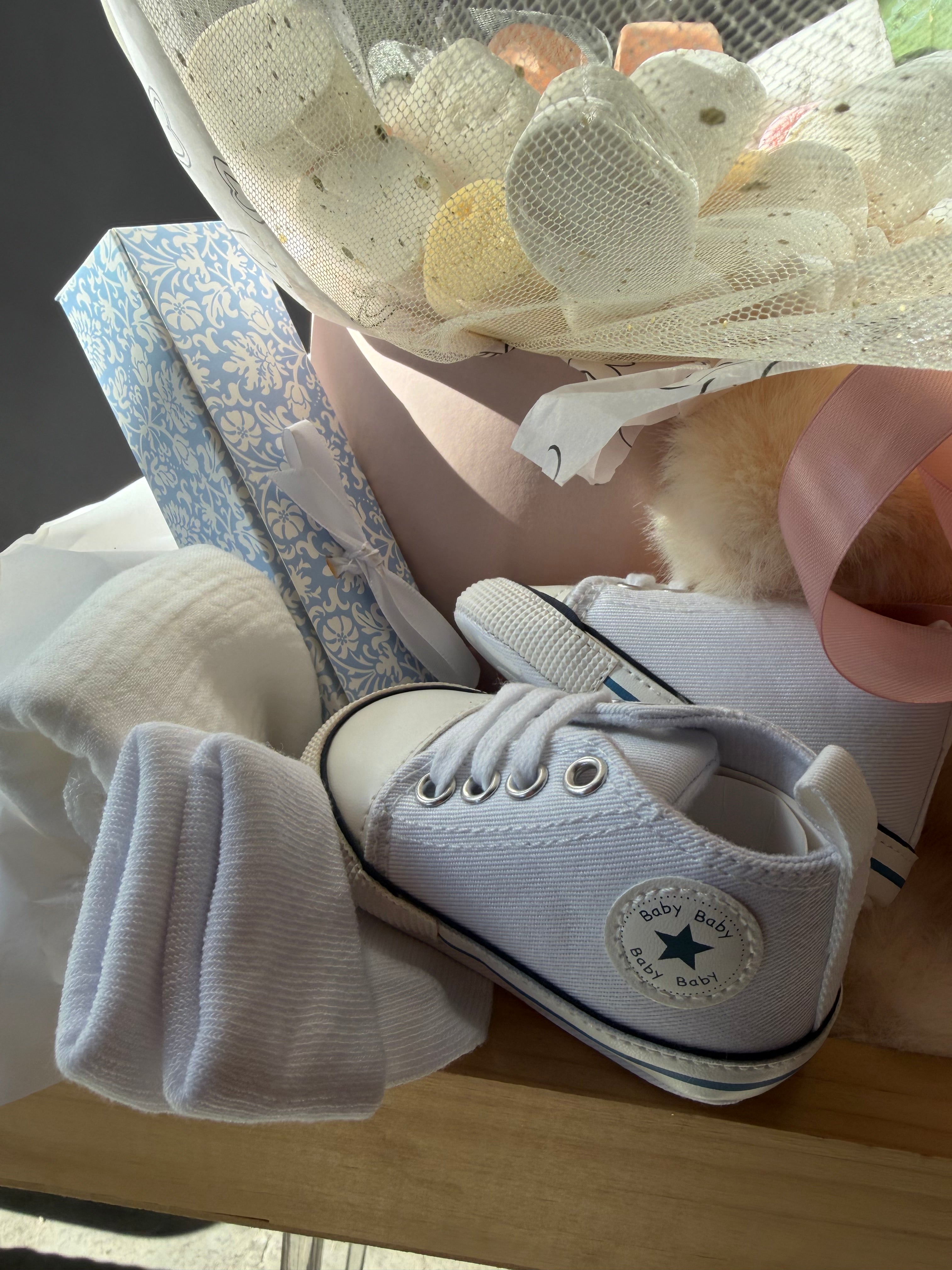 Presentamos una elegante caja de nacimiento premium deluxe que incluye una planta de orquídea phalaenopsis, un osito de peluche mediano, un globo transparente, marshmallows, zapatillas, un paño de algodón, calcetines para bebé, una cajita celeste con bombones de chocolate y un pequeño arreglo con flores de algodón y rosa preservada. Ideal para celebrar la llegada de un nuevo ser.