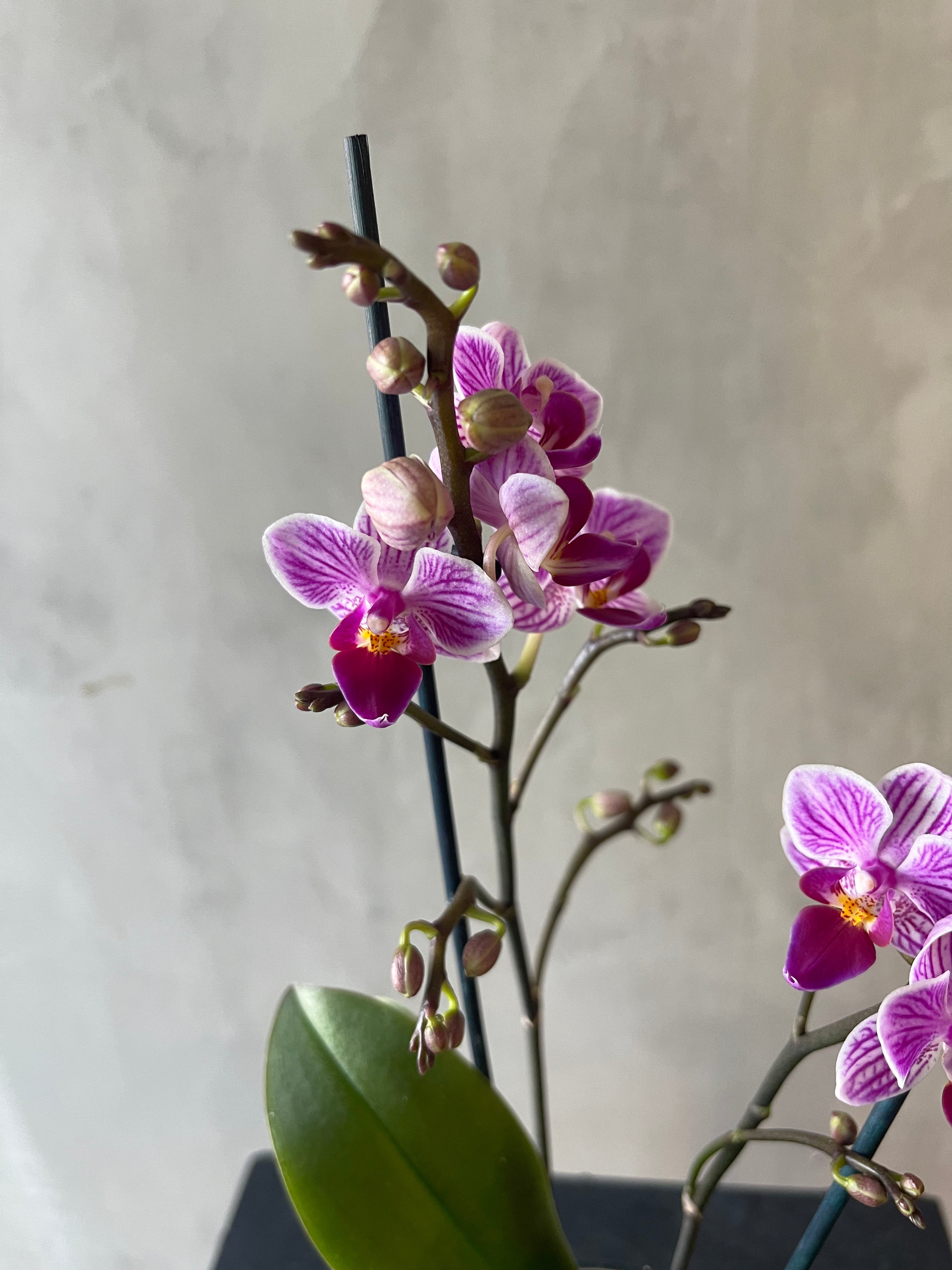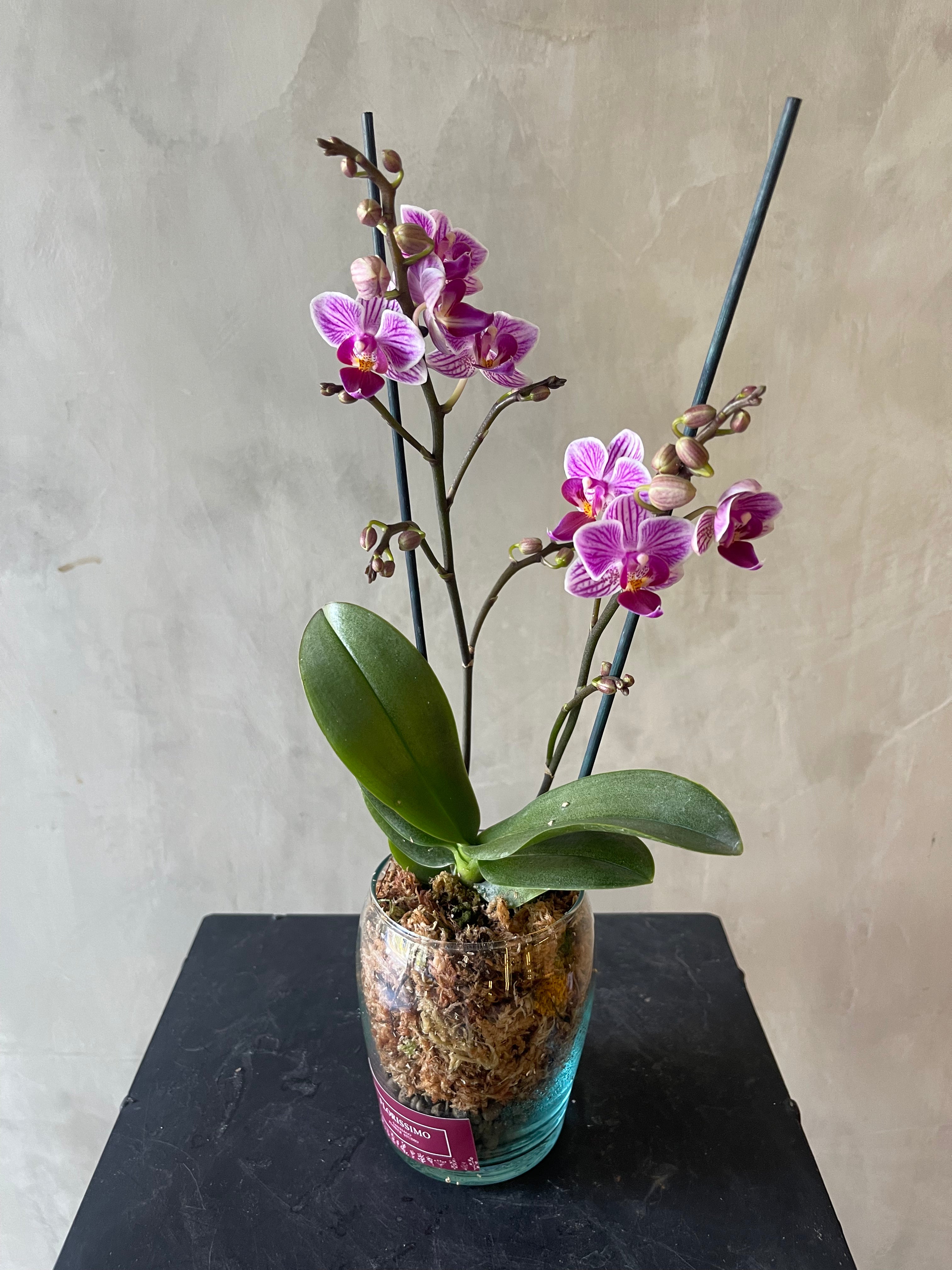 Planta de orquídea phalaenopsis en maceta de vidrio. Viene plantada en un musgo especial, fácil de cuidar. Requiere poco riego y mucha luz sin sol directo. Florece 2 veces al año durante varios meses.