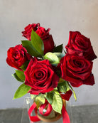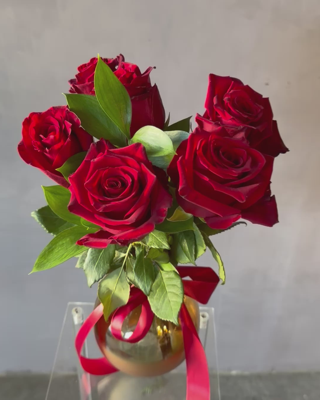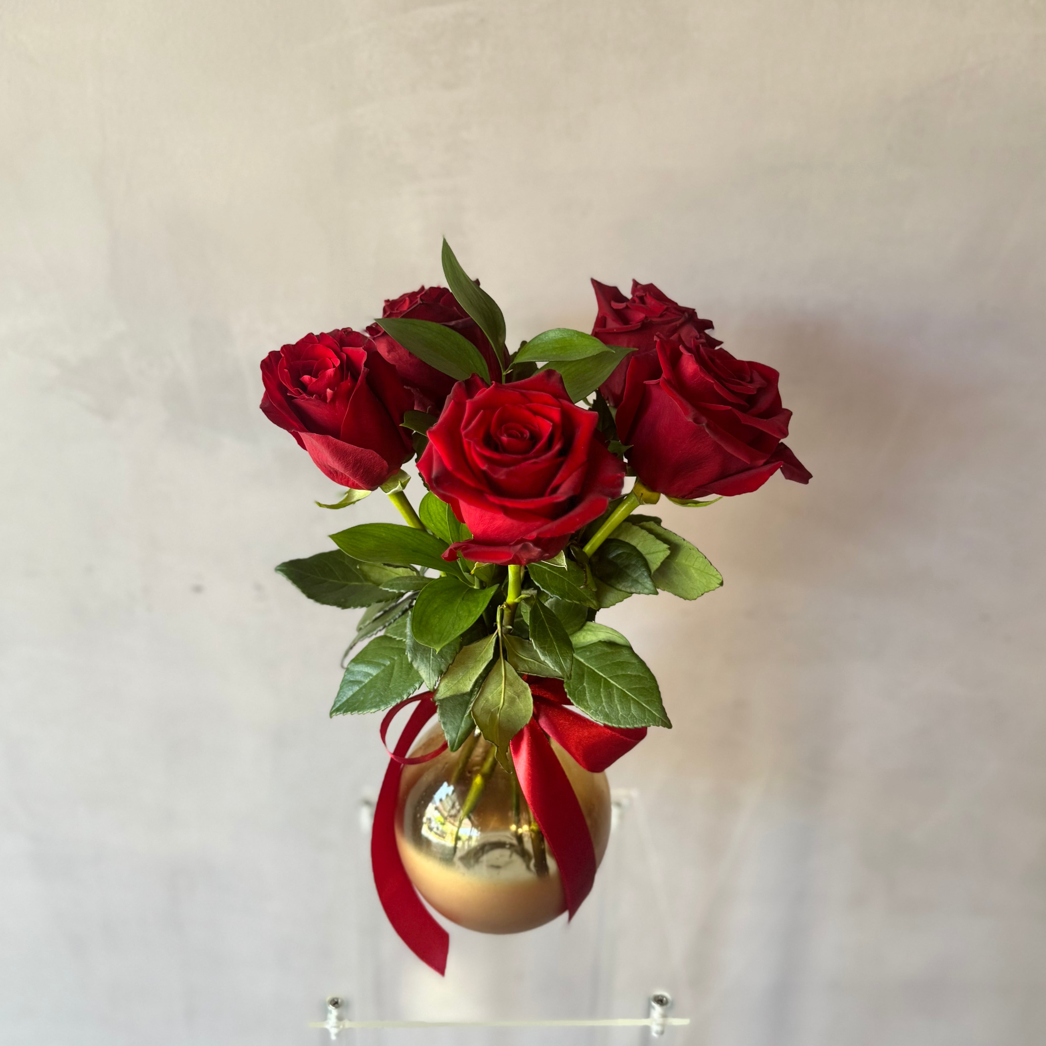 Ramo compuesto por 5 rosas rojas cuidadosamente dispuestas en un florero dorado, acompañado de delicadas varas de follaje que aportan equilibrio y frescura al diseño. Una propuesta clásica y sofisticada que simboliza amor y pasión, ideal para sorprender en aniversarios, cumpleaños o en cualquier ocasión donde quieras expresar sentimientos profundos con elegancia.